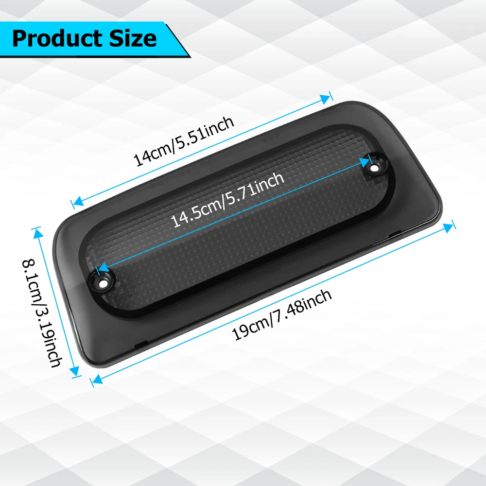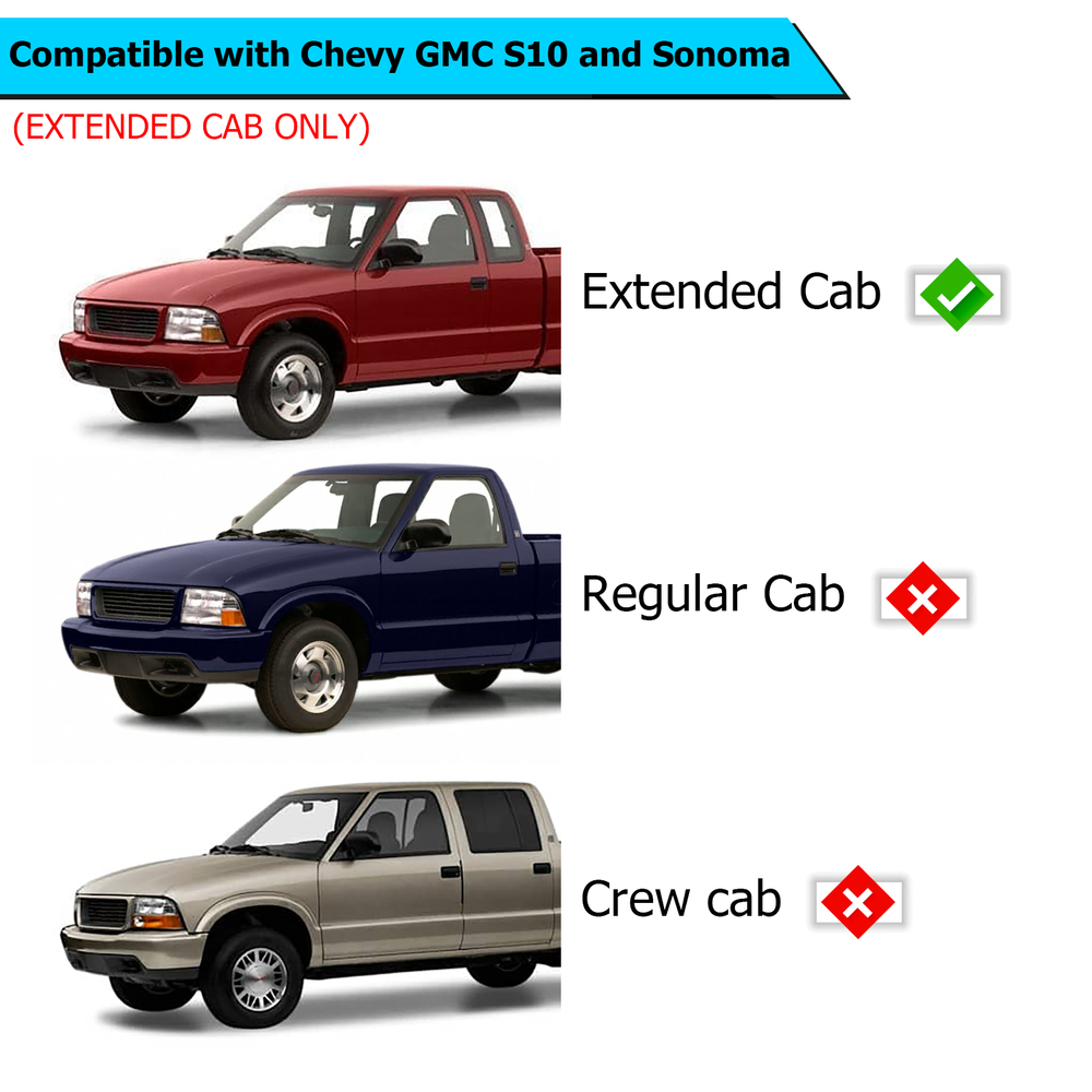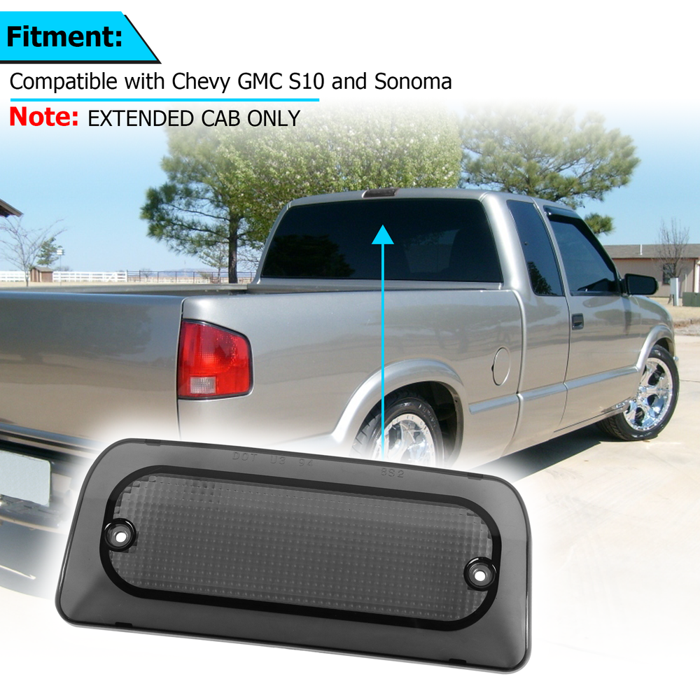 Fitment 3rd Third Brake Light Smoke Lens compatible with 1994-2003 Chevy S10; 1994-2003 GMC Sonoma. Note: Extended Cab Only (Does not fit Regular or Crew cab) Specifications Condition:100% Brand New Color:Smoke Light Source Type:LED Vehicle Service Type:Car Special Feature:Waterproof Auto Part Position:Rear Lens Color:Smoke Lens Material:ABS,Plastic Features 1.Our LED lights have brighter visibility, make your vehicle with a modern look and enhance safety at night. 2.Made of premium ABS/PC housing and lens. Waterproof design, energy saving, longer lifetime, no faded with long-time exposure. 3.Plug & Play, direct replacement, no modification or trimming needed, made specifically to fit Extended Cab. Package Included 1 x Third Brake Light Note 1.Please allow 1~3 cm error due to manual measurement, thanks. 2.Due to the difference between different monitors, the picture may not reflect the actual color of the item. Please understand, thank you. 3. Please confirm whether the 3rd Brake Light Lens is suitable for your vehicle before purchasing. On Feb 11, 2025 at 18:12:03 PST, seller added the following information: