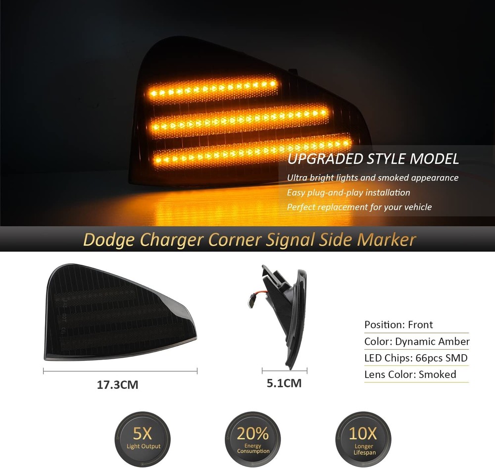 Just installed these dynamic LED side markers on my '08 Charger and they look amazing! The smoked tint gives it a sleek, aggressive look while the bright, flashing LEDs improve visibility. Plug-and-play install was super easy—no wiring mess. The ABS plastic feels sturdy and fits perfectly like OEM. Definitely upgrades the car’s style and safety. Worth every penny!