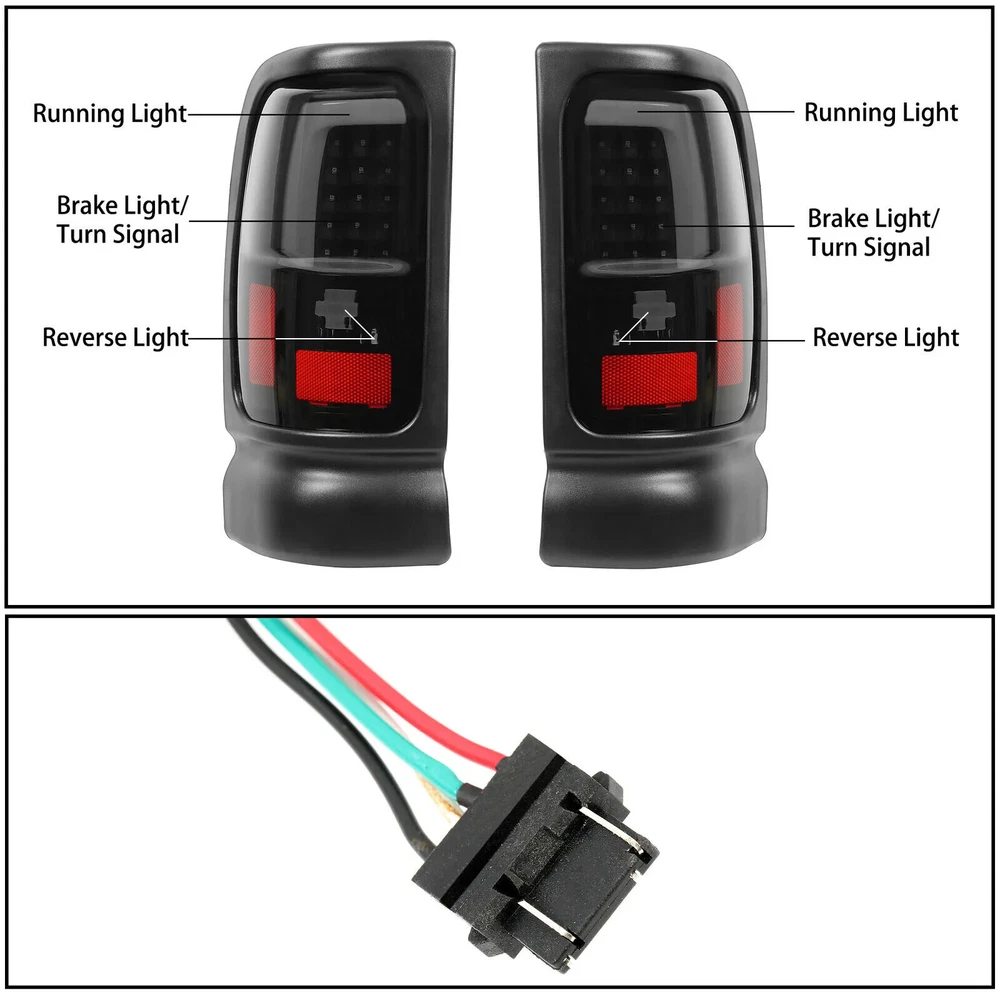 Smoke Lens LED Tail Lights Brake Lamp DOT For 1994-2001 Dodge Ram 1500 2500 3500 Specifiction: Condition: 100% New Color: Smoke Lens+Black Housing Material: Plastic Warranty: Lifetime Placement on Vehicle: Rear, Left, Right Other Part Number: Replace for CH2800122 + CH2801122, CH2800135 + CH2801135, 55055265AC, 55055264AC, 5EK45DX8AC, 5EK44DX8AC Features : 100% Brand New in Box , Never Been Installed Before Comes in a Pair, Which Means Included Left Side (Driver Side) & Right Side (Passenger Side) This Pair of Tail Light Equipped With High Quality LED Illuminated, Long Lasting And The Brightest Direct Bolt On Replacement For Your Original Tail Lights, No Wiring or Any Other Modification Needed Included Wiring diagram LED tail lights are proven to give off a more even light increasing the visibility while being less likely to blind other drivers at the same time. Note : We are LEDs not halogen, With long use time and high quality. Fits : For Dodge Ram 1500 1994-2001 For Dodge Ram 2500 1994-2002 For Dodge Ram 3500 1994-2002 Package: 1 Pair of Driver & Passenger Side Tail Light Shipping : All items will be shipped out in 1 business day, no expedited service available. (USA only, Does NOT include Hawaii, Alaska or Puerto Rico, PO Boxes/APO's) Contact us : Any Questions, Just feel free to contact us on eBay. We will reply you in 1 business day. On Oct 27, 2024 at 22:11:07 PDT, seller added the following information: