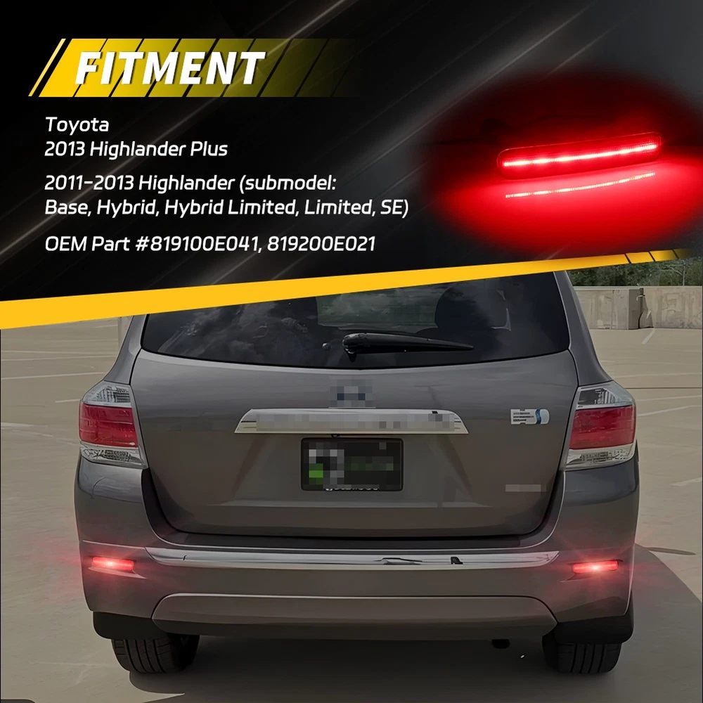 Product Detail Copyright©MotoringPlus Details This page features One Pair (2 Pieces) Smoked / Tinted Lens Red LED Rear Bumper Tail Brake Reflectors Light Kit For 2011-2013 Toyota Highlander These reflectors are made with high-quality Polymethy l Methacrylate (PMMA) and Polycarbonate (PC) plastics 50% Brighter red LED lighting for tail light; 100% Brighter red LED lighting for brake light Give your ride upgraded LED rear bumper lights with an unique and modern look as well as increased safety, visibility, and style at night! Specifications: 100% Brand new and quality Lens Color: Smoked / Tinted LED Color: Red Voltage: 12-24V DC; Power: 4W A complete set of two LED rear reflector lights, replacement for the driver side & passenger sides Compatible With 2011-2013 Toyota Highlander Directly replace or repair your car's rear bumper reflectors with red LED strips CE DOT SAE approved Application: For 2011 2012 2013 Toyota Highlander Replace OEM # 819100E041, TO2831106, 819200E021, TO2830106 Please make sure you have available space in your car for these reflectors to fit before placing or der. Package include: 2PCS Driver & Passenger side rear bumper LED reflector Lights (Smoked / Tinted Lens) Installation: To install these LED bumper reflectors, you simply need to access to the back of the rear bumper, push to remove the stock bumper reflectors and directly replace back with these LED reflectors and then tap the wires accordingly. Connect black wire to tail light negative, white wire to tail lights positive and red wire to brake light positive. Note: Professional installation is highly recommended! Returns Policy Shipping Policy Payment Method About US Contact Us Returns Policy Please check actual stock bulb model & housing size before purchasing replacement bulbs. Compatibility list on eBay listing is not a complete list and it is a known issue that there are errors on it. Half year warranty from the purchased date. Please contact us via ebay message before returning the defectived item. Our warranty does not extended to any products that are physically damaged or that are not under normal operating conditions as a result of misuse or improper installation on the buyers/user's part. Return items should include the original packaging and all accessories. Buyers MUST contact us for the returning address. In all cases, buyers pay shipping fees at their own cost to return products for exchange or refund. We will be responsible for the postage of replacements. Refund will be made upon receipt of the returned item. Our goal is to make sure you are a happy buyer and pleasant shopping with us. If you have any problems, please contact us immediately before leaving us any negative or neutral feedback. We understand the concerns and frustrations you might have, and will do our endeavor to resolve the issues. Please give us the opportunity to resolve any problem. Shipping Policy Item will be shipped from China / Hongkong Post by Standard International Post. All orders will be shipped to buyer's paypal shipping address within 24 hours after receiving your verified payment (Excluding Weekends and Public Holidays) International order may takes about 15-25 business day delivery time for most countries. Transactions on weekends or public holidays,item will be sent later on work time. Payment Method We accept Paypal ONLY. Unpaid transaction will be cancelled after 8 days About US Contact Us We are dedicated to providing you the best shopping experience and high quality items at a very low price. If you are satisfied with our service,Please remember to leave us 5 STAR for All Detailed Seller Ratings If you found any problem/issue of our merchandise/service,please let us know before leaving any negative feedback! Please feel free to contact us if you have any question. Any message will be replied within 24 hours. We will try our best to help! Home Payment Shipping About us Contact us Copyright©MotoringPlus Home Payment Shipping About us Contact us Store Categories Store Categories SIDE MARKER LIGHT TURN SIGNAL LIGHT TAIL BRAKE LIGHT LICENSE PLATE LIGHT DECODER OTHERS Other Product Detail Copyright©OFFKAT Why Buy From Us Why Buy From Us Details This page features One Pair (2 Pieces) Smoked / Tinted Lens Red LED Rear Bumper Tail Brake Reflectors Light Kit For 2011-2013 Toyota Highlander These reflectors are made with high-quality Polymethy l Methacrylate (PMMA) and Polycarbonate (PC) plastics 50% Brighter red LED lighting for tail light; 100% Brighter red LED lighting for brake light Give your ride upgraded LED rear bumper lights with an unique and modern look as well as increased safety, visibility, and style at night! Specifications: 100% Brand new and quality Lens Color: Smoked / Tinted LED Color: Red Voltage: 12-24V DC; Power: 4W A complete set of two LED rear reflector lights, replacement for the driver side & passenger sides Compatible With 2011-2013 Toyota Highlander Directly replace or repair your car's rear bumper reflectors with red LED strips CE DOT SAE approved Application: For 2011 2012 2013 Toyota Highlander Replace OEM # 819100E041, TO2831106, 819200E021, TO2830106 Please make sure you have available space in your car for these reflectors to fit before placing or der. Package include: 2PCS Driver & Passenger side rear bumper LED reflector Lights (Smoked / Tinted Lens) Installation: To install these LED bumper reflectors, you simply need to access to the back of the rear bumper, push to remove the stock bumper reflectors and directly replace back with these LED reflectors and then tap the wires accordingly. Connect black wire to tail light negative, white wire to tail lights positive and red wire to brake light positive. Note: Professional installation is highly recommended! Returns Policy Shipping Policy Payment Method About US Contact Us Returns Policy Our 60-day Satisfaction Guarantee assures our customers that they will receive all orders promptly and exactly as described. In addition, it allo