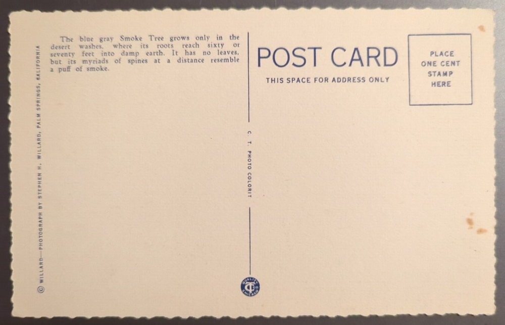 Vintage Linen Postcard Smoke Trees in a Desert Wash California c1940 Unposted. There may be wear on the edges or a bent or torn corner, staining or writing on the card, creasing, or the card may have a cancellation mark. Most of the postcards I sell are 50 to 100+ years old and will never be perfect. Please examine the photos carefully for condition information - there is some writing on the bottom edge of the white border. All postcards with a value of less than $20 are shipped via eBay Standard Envelope with a 2 mm postcard sleeve and a piece of cardstock on either side, taped closed with masking tape and placed in a heavy cardboard mailer. Postcards with a value of more than $20 are sent Ground Advantage in a 2 mm postcard sleeve, sandwiched between cardboard and shipped in a padded polybag. Both methods are provided with tracking.