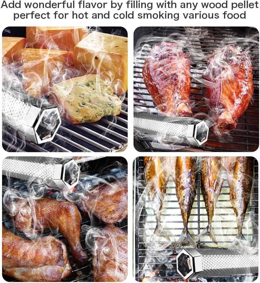 Smoke Tube for Pellet Smoker, 12'' Smoker Tube for Pellet Grill - Hot or Cold 【BILLOWING SMOKE AND BIG CAPACITY】 The pellet smoker tube has massive density diffusion holes on its body. So the smoker tube can let air come in, diffusing smoke efficiently and evenly to your food. The perforated design and hexagon shape of tube smoker allow the pellets stay lit the fully burn to provide constant smoke. With a length of 12 inches large capacity, the wood pellets smoker tube is capable of holding enough pellets and will produce abundant quantity of smoke up to 5hrs 【UNFORGETTABLE FLAVORS FOR HOT AND COLD SMOKING】This smoke tube can be used with various wood pellets such as cherry, hickory, mesquite, apple, pecan to add different tastes. The 12" tube smoker works with wood chips as well. You can mix these or stack them in the tube. This smoke tube is idea for hot and cold smoking, adding wonderful smoking flavor to many types of food: meats, cheeses, veggies, nuts, bacon, chicken, salt, burger, steaks, pork, hot dogs, sausages, fruit, corn, and more 【WORKS WITH ALL GRILLS AND SMOKERS】 The smoker tube is compatible with electric, gas, charcoal, pellet grills, any type of grills of any size and shape. Just fill the barbeque smoker tube with wood pellets, lean the grill smoker tube against the inside wall or of put it in the middle or any position. The bbq pellet smoker tube will release smoke. This bbq smoker tube turns your barbeque grill into a smoker without modification. The smoke generator is also designed to supplement smoke in a smoker 【IMPROVED DESIGN AND STAINLESS STEEL MATERIAL】 The special hexagonal smoker tube can stay steadily and will not roll on grill grate. Open cap at one end is for easy filling and lighting. Closed cap at other end keeps pellets inside. The whole smoker tube is made of high standard 304 grade stainless steel that is anti-rust and heat-resistant. With excellent workmanship, the smoker tube is very durable and will not be broken or bent after long-time use Shipping We offer FREE shipping on all orders! We ship within Three business days of payment, usually sooner. We use a selection of shipping services such as UPS, FedEx, USPS etc. We only ship to the lower 48 states, no APO/FPO addresses or PO Boxes allowed. Local pickups and combined shipping options are not provided at this time. Return You can return a product for up to 30 days from the date you purchased it. Any product you return must be in the same condition you received it and in the original packaging. Please keep the receipt. Customer satisfaction is very important to us. If you have any problem with your order, please contact us and we will do our best to make you satisfied. Contact Us If you have any queries, please contact us via ebay. We usually respond within 24 hours on weekdays. Please visit our eBay store to check out other items for sale! Thank you for shopping at our store.