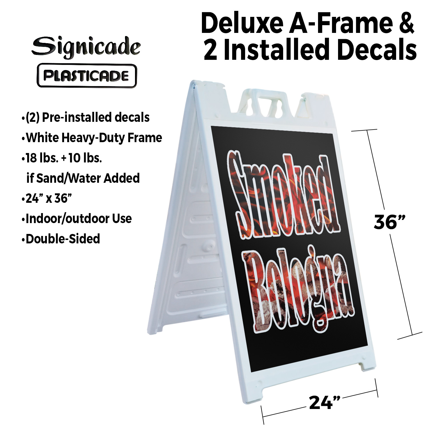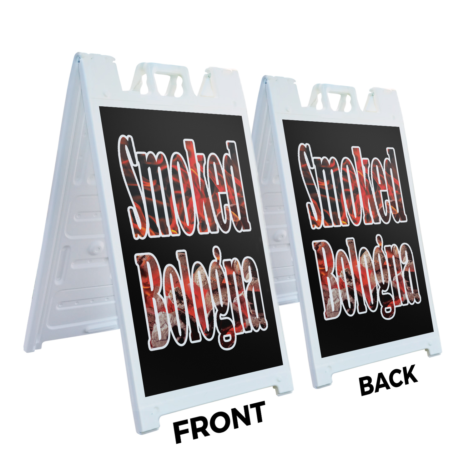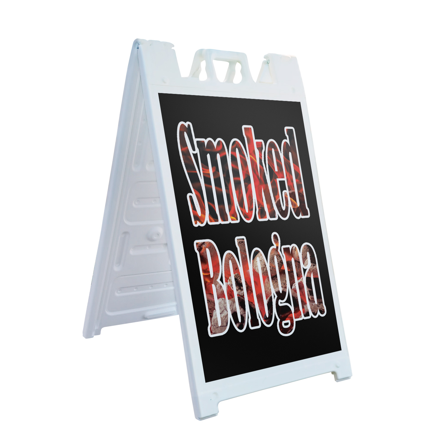 Smoked Bologna (2-Pack) 24 Inch x 36 Inch Plastic Signs | Sign Insert 4mm Corrugated Plastic Signs Storefront Window Poster | Freshly Cooked, BBQ Favorites, Delicious Treats | Made in USA Universal 2 eBay Template by Finest Design Vinyl Banners Aluminum Signs Safety Signs Yard Signs Designer Aluminum Signs Novelty Signs Vinyl Banners Aluminum Signs Safety Signs Yard Signs Designer Aluminum Signs Novelty Signs Description Smoked Bologna Heavy Duty A-Frame Sidewalk Sign Freshly Cooked BBQ Favorites SignMission Deluxe A-Frame Signs Heavy-Duty - Portable - Reusable - Weather Resistant A-Frames, also known as sandwich board signs, are an easy and affordable way to advertise your business or event. The durable thick plastic frame allows them to be placed both indoors and outdoors in any conditions except extreme weather. They are also extremely easy to set up, take down, and move from one location to another as needed. Our Signicade Deluxe A-Frame is available with two installation options: Decals Installed – The sign graphics are printed on high-quality vinyl decals that come pre-installed on the frame. Corrugated Plastic Signs Installed – Includes two 4mm corrugated plastic sign inserts that are attached using self-adhesive Velcro (included). Need to switch up your messaging? Extra sets of inserts are available in both decal and corrugated plastic options. Order multiple sets and change your message in just a few minutes! Simply search for SignMission 24” x 36” sign inserts to get additional replacements. Product Features & Specs (2) 4mm Corrugated Plastic Signs OR Pre-Installed Decals Self-Adhesive Velcro (For corrugated plastic option) White Heavy-Duty Frame 18 lbs. + 10 lbs. if Sand/Water Added 24” x 36” Removable Sign Graphics Indoor / Outdoor Use Double-Sided A-Frame Features Weatherproof: The combination of high-quality plastic and added weight from sand/water makes these signs perfect for outdoor use. Rain or shine, your A-Frame sign can endure it all. Maximum Visibility: Because every A-Frame is double-sided, you can make sure everyone sees your message. Portable: The collapsible A-Frame and convenient handle make it easy to move your sign from one location to another. Reusable: Store your signs and use them as you always have, swap inserts to change your messaging, and use your A-frame signs for years to come. Weight: 18 lbs. (Weight does not reflect when the frame is filled with water or sand, which can add 10 additional lbs. when full.) Details: Durable heavy-duty plastic frame with a regressed double-sided sign area (24”x36”). Foldable with a molded handle for easy grip and carrying. Fillable frame for greater stability. Swappable corrugated plastic graphics or pre-installed decals. Portable. Uses: Indoor/Outdoor. Trade shows. Sidewalk advertising. Daily specials and menus for restaurants. Point-of-purchase displays. Event and foot traffic. Directional signage. Estimated Lifespan: 5+ years with proper placement and care. Size: 45"H x 25"W x 3"D - Frame; 24" x 36" Graphic Area.