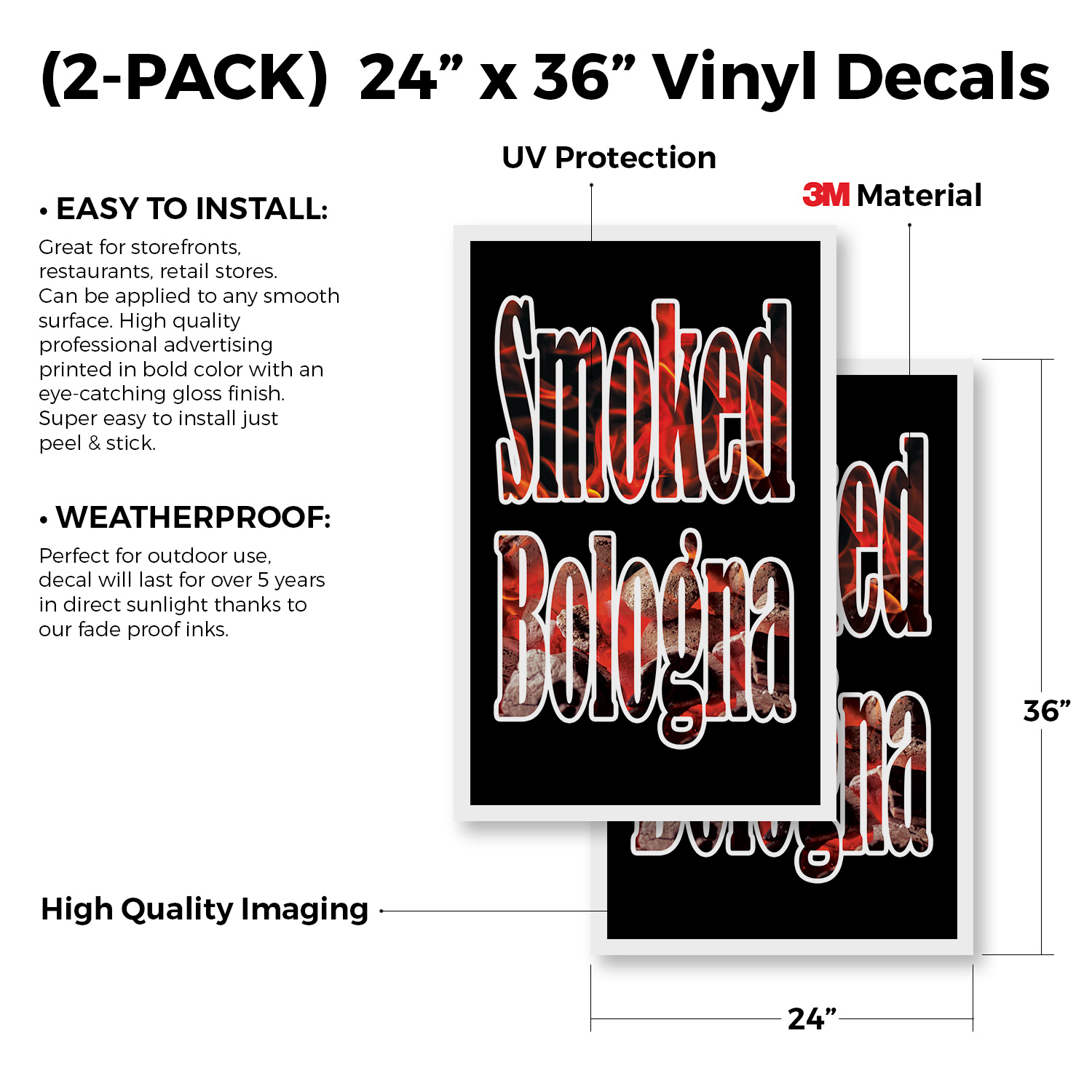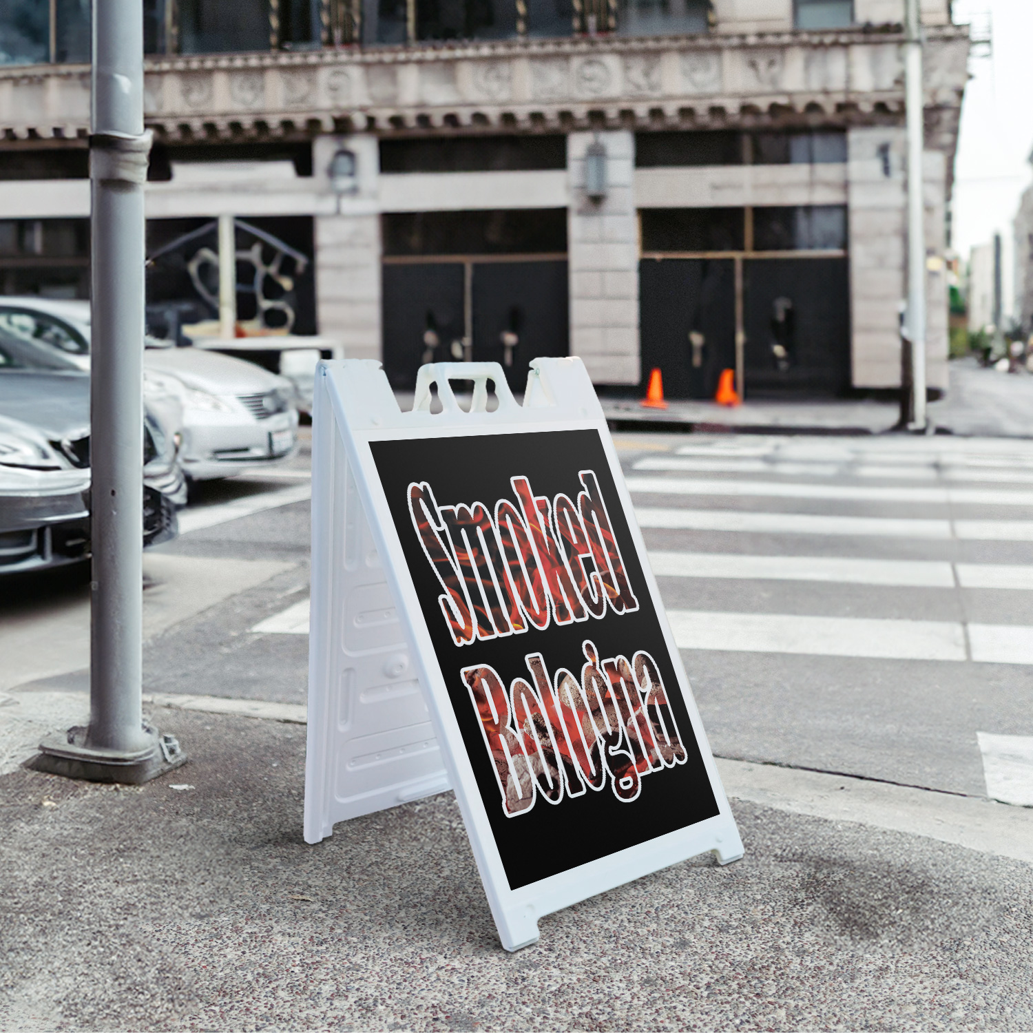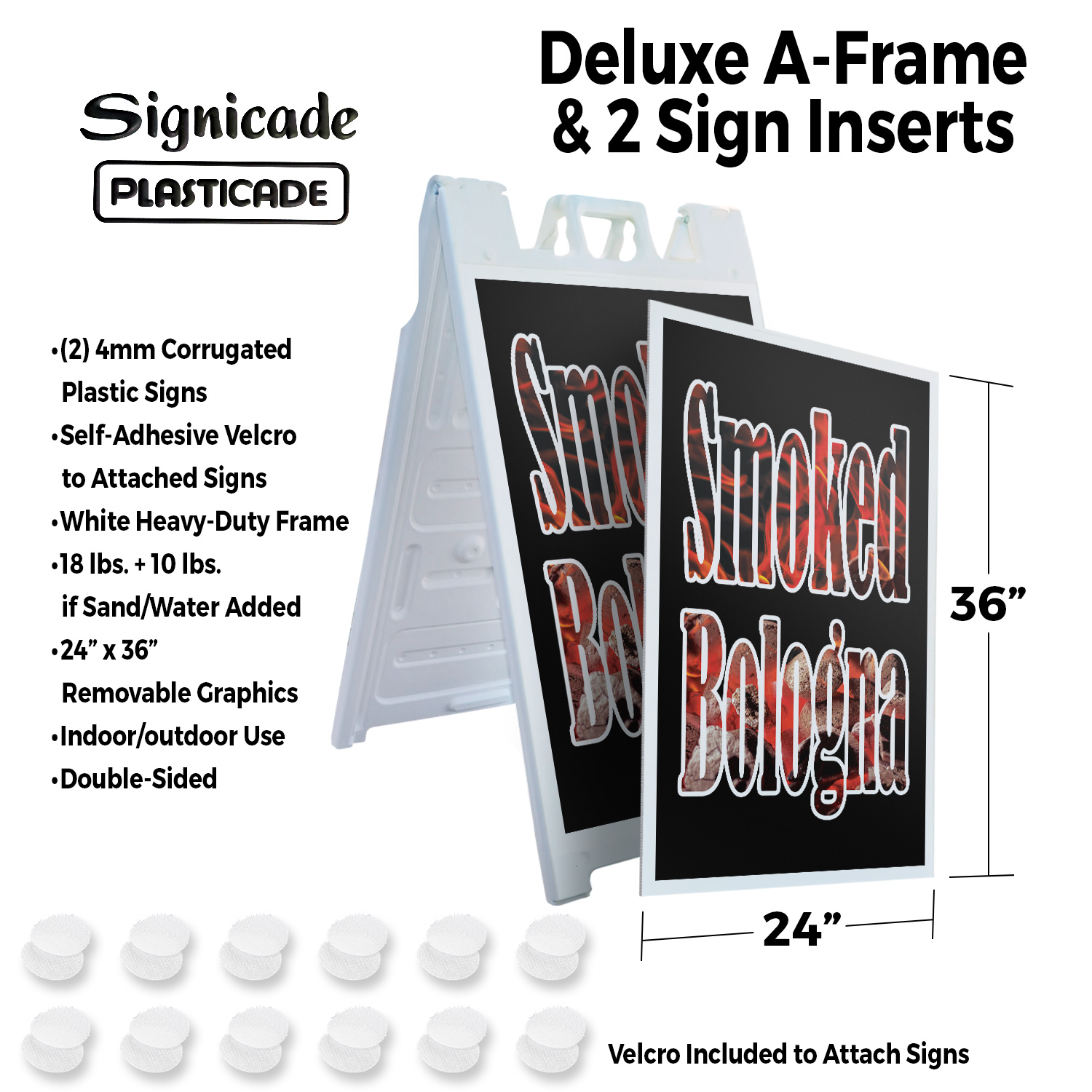Smoked Bologna (2-Pack) 24 Inch x 36 Inch Plastic Signs | Sign Insert 4mm Corrugated Plastic Signs Storefront Window Poster | Freshly Cooked, BBQ Favorites, Delicious Treats | Made in USA Universal 2 eBay Template by Finest Design Vinyl Banners Aluminum Signs Safety Signs Yard Signs Designer Aluminum Signs Novelty Signs Vinyl Banners Aluminum Signs Safety Signs Yard Signs Designer Aluminum Signs Novelty Signs Description Smoked Bologna Heavy Duty A-Frame Sidewalk Sign Freshly Cooked BBQ Favorites SignMission Deluxe A-Frame Signs Heavy-Duty - Portable - Reusable - Weather Resistant A-Frames, also known as sandwich board signs, are an easy and affordable way to advertise your business or event. The durable thick plastic frame allows them to be placed both indoors and outdoors in any conditions except extreme weather. They are also extremely easy to set up, take down, and move from one location to another as needed. Our Signicade Deluxe A-Frame is available with two installation options: Decals Installed – The sign graphics are printed on high-quality vinyl decals that come pre-installed on the frame. Corrugated Plastic Signs Installed – Includes two 4mm corrugated plastic sign inserts that are attached using self-adhesive Velcro (included). Need to switch up your messaging? Extra sets of inserts are available in both decal and corrugated plastic options. Order multiple sets and change your message in just a few minutes! Simply search for SignMission 24” x 36” sign inserts to get additional replacements. Product Features & Specs (2) 4mm Corrugated Plastic Signs OR Pre-Installed Decals Self-Adhesive Velcro (For corrugated plastic option) White Heavy-Duty Frame 18 lbs. + 10 lbs. if Sand/Water Added 24” x 36” Removable Sign Graphics Indoor / Outdoor Use Double-Sided A-Frame Features Weatherproof: The combination of high-quality plastic and added weight from sand/water makes these signs perfect for outdoor use. Rain or shine, your A-Frame sign can endure it all. Maximum Visibility: Because every A-Frame is double-sided, you can make sure everyone sees your message. Portable: The collapsible A-Frame and convenient handle make it easy to move your sign from one location to another. Reusable: Store your signs and use them as you always have, swap inserts to change your messaging, and use your A-frame signs for years to come. Weight: 18 lbs. (Weight does not reflect when the frame is filled with water or sand, which can add 10 additional lbs. when full.) Details: Durable heavy-duty plastic frame with a regressed double-sided sign area (24”x36”). Foldable with a molded handle for easy grip and carrying. Fillable frame for greater stability. Swappable corrugated plastic graphics or pre-installed decals. Portable. Uses: Indoor/Outdoor. Trade shows. Sidewalk advertising. Daily specials and menus for restaurants. Point-of-purchase displays. Event and foot traffic. Directional signage. Estimated Lifespan: 5+ years with proper placement and care. Size: 45"H x 25"W x 3"D - Frame; 24" x 36" Graphic Area.