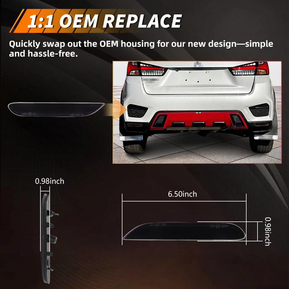 Product Detail Copyright©MotoringPlus Details This page features One Pair (2 Pieces) Smoked / Tinted Lens Rear Bumper Tail Reflectors Light Kit For 2020+ Mitsubishi Outlander Sport These reflectors are made with high-quality Polymethy l Methacrylate (PMMA) and Polycarbonate (PC) plastics No modification required! Each piece is easy to install with an OEM fit, Instantly transform your car and give it a modern and trendy appearance and feel! Note: Bulbs & socket adapters are NOT included Specifications: 100% Brand new and quality Lens Color: Smoked / Tinted A complete set of two reflector lights, replacement for the driver side & passenger sides Compatible With 2020+ Mitsubishi Outlander Sport Directly replace or repair your car's rear bumper reflectors CE DOT SAE approved Application: For For 2020+ Mitsubishi Outlander Sport Replace OEM # 26560JJ90A, 26565JJ90A; 26560-JJ90A, 26565-JJ90A Please make sure you have available space in your car for these reflectors to fit before placing or der. Package include: 2PCS Driver & Passenger side rear bumper reflector Lights (Smoked / Tinted Lens) Installation: Direct replacement the OEM parts without any modification needed Note: Professional installation is highly recommended! Returns Policy Shipping Policy Payment Method About US Contact Us Returns Policy Please check actual stock bulb model & housing size before purchasing replacement bulbs. Compatibility list on eBay listing is not a complete list and it is a known issue that there are errors on it. Half year warranty from the purchased date. Please contact us via ebay message before returning the defectived item. Our warranty does not extended to any products that are physically damaged or that are not under normal operating conditions as a result of misuse or improper installation on the buyers/user's part. Return items should include the original packaging and all accessories. Buyers MUST contact us for the returning address. In all cases, buyers pay shipping fees at their own cost to return products for exchange or refund. We will be responsible for the postage of replacements. Refund will be made upon receipt of the returned item. Our goal is to make sure you are a happy buyer and pleasant shopping with us. If you have any problems, please contact us immediately before leaving us any negative or neutral feedback. We understand the concerns and frustrations you might have, and will do our endeavor to resolve the issues. Please give us the opportunity to resolve any problem. Shipping Policy Item will be shipped from China / Hongkong Post by Standard International Post. All orders will be shipped to buyer's paypal shipping address within 24 hours after receiving your verified payment (Excluding Weekends and Public Holidays) International order may takes about 15-25 business day delivery time for most countries. Transactions on weekends or public holidays,item will be sent later on work time. Payment Method We accept Paypal ONLY. Unpaid transaction will be cancelled after 8 days About US Contact Us We are dedicated to providing you the best shopping experience and high quality items at a very low price. If you are satisfied with our service,Please remember to leave us 5 STAR for All Detailed Seller Ratings If you found any problem/issue of our merchandise/service,please let us know before leaving any negative feedback! Please feel free to contact us if you have any question. Any message will be replied within 24 hours. We will try our best to help! Home Payment Shipping About us Contact us Copyright©MotoringPlus Home Payment Shipping About us Contact us Store Categories Store Categories SIDE MARKER LIGHT TURN SIGNAL LIGHT TAIL BRAKE LIGHT LICENSE PLATE LIGHT DECODER OTHERS Other Product Detail Copyright©OFFKAT Why Buy From Us Why Buy From Us Details This page features One Pair (2 Pieces) Smoked / Tinted Lens Rear Bumper Tail Reflectors Light Kit For 2020+ Mitsubishi Outlander Sport These reflectors are made with high-quality Polymethy l Methacrylate (PMMA) and Polycarbonate (PC) plastics No modification required! Each piece is easy to install with an OEM fit, Instantly transform your car and give it a modern and trendy appearance and feel! Note: Bulbs & socket adapters are NOT included Specifications: 100% Brand new and quality Lens Color: Smoked / Tinted A complete set of two reflector lights, replacement for the driver side & passenger sides Compatible With 2020+ Mitsubishi Outlander Sport Directly replace or repair your car's rear bumper reflectors CE DOT SAE approved Application: For For 2020+ Mitsubishi Outlander Sport Replace OEM # 26560JJ90A, 26565JJ90A; 26560-JJ90A, 26565-JJ90A Please make sure you have available space in your car for these reflectors to fit before placing or der. Package include: 2PCS Driver & Passenger side rear bumper reflector Lights (Smoked / Tinted Lens) Installation: Direct replacement the OEM parts without any modification needed Note: Professional installation is highly recommended! Returns Policy Shipping Policy Payment Method About US Contact Us Returns Policy Our 60-day Satisfaction Guarantee assures our customers that they will receive all orders promptly and exactly as described. In addition, it allows customers to return new and unused products in their original factory condition for any reason within 60 days from the date of purchase. Buyers are responsible for appropriate packing, returning shipping cost, insurance and returning the item in "new" condition. Used items will not be accepted for return. We will replace the returning item with an identical item, issue a full store credit or a full refund. Our goal is to make sure you are a happy buyer and pleasant shopping with us. If you have any problems, please contact us immediately before leaving us any negative or neutral feedback. We understand the concerns and frustrations you might have, and will do our endeavor to resolve the issues. Please give us the opportunity to resolve any problem. Shippi