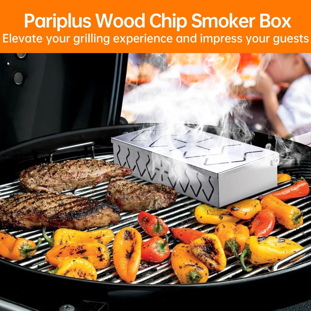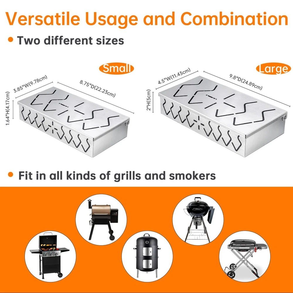 Versatile Usage and Combination: Set of 2 packs, large smoker box measures 9.8"D x 4.5"W x 2"H, small smoke box measures 8.75”D x 3.85”W x 1.64”H. The two different sizes are available in a variety of uses and combinations, perfect for all gas grill, charcoal grill and electric grills. When not smoking, you can take the smoker box for gas grilling off the grill to have a full grill top to cook more food Sturdy Structure and Food-Safe: The smoke boxes for gas grill have durable stainless steel construction. Heavy duty, heat and corrosion resistant, not easy to warp, bent or rust. The grill smoker boxes are food-safe to ensure that your grilled dishes are free from any harmful contaminants Offer Tantalizing Smoky BBQ Flavors: The unique hollow design not only enhances the aesthetics of the smoke box, but also provides great ventilation which helps to produce a lot of smoke and give off a fantastic smoky flavor. You can choose your favorite wood chips flavor, and enjoy delicious smoked meat like chicken breast, beef and ribs Easy to Use and Clean: The secure but simple hinge design allows you to easily add wood chips and adjust smoking intensity. The gas grill smoker box is super easy to clean with a polished surface and smooth edges. The wood chip smoker boxes for gas grill are also dishwasher safe, making cleaning a breeze Large Capacity & Great Service: The two smoker boxes for gas grill provide enough space for more wood chips, avoid adding wood chips while grilling. Each smoke box for pellet grill is well packaged and carefully inspected before shipment. If there is any problem with the gas grill accessories you received, please feel free to contact us. We will provide you with satisfactory solutions within 24 hours.