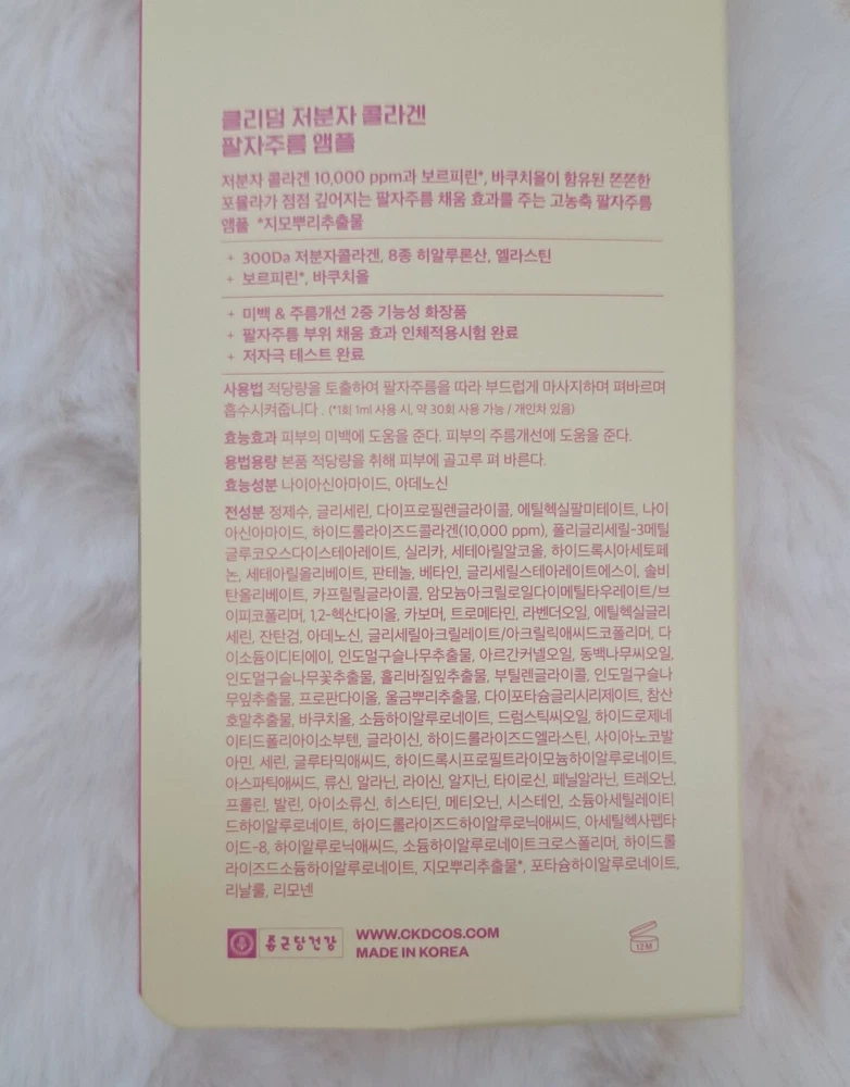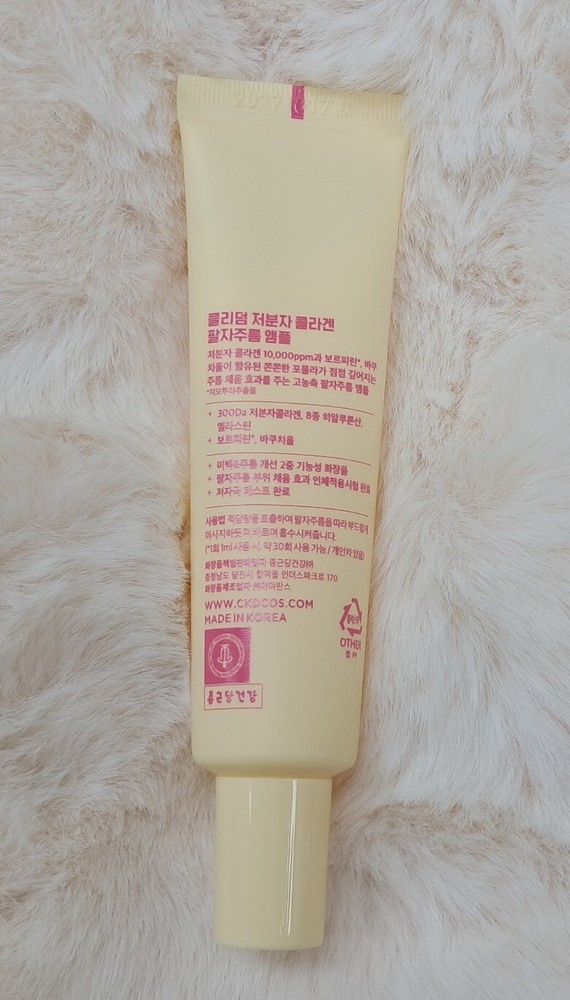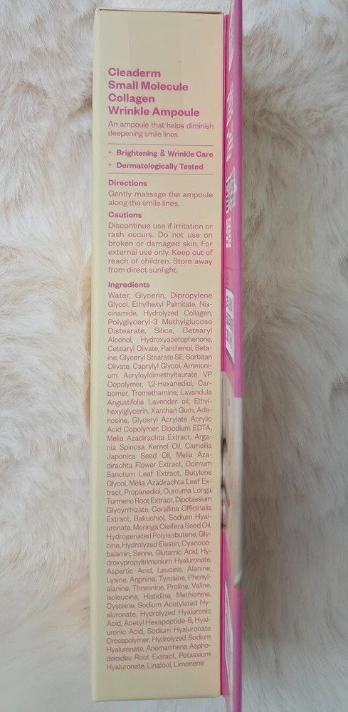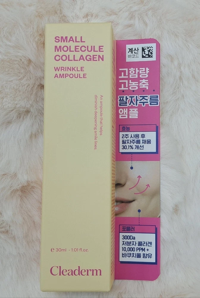 Small Molecule Collagen wrinkle ampoule to diminish smile lines Efficacy/Effectiveness Whitening. Wrinkle improvement Filling the smile lines Special note Completion of Human Application Test Hypoallergenic test completed How to use it Discharge an appropriate amount and gently massage along the smile lines, spread, and absorb. (If you use 1ml(0.03 fl.oz.) at a time, you can use it about 30 times/ It varies by person.)