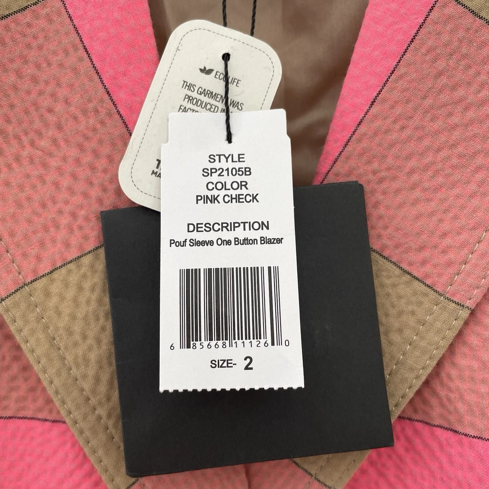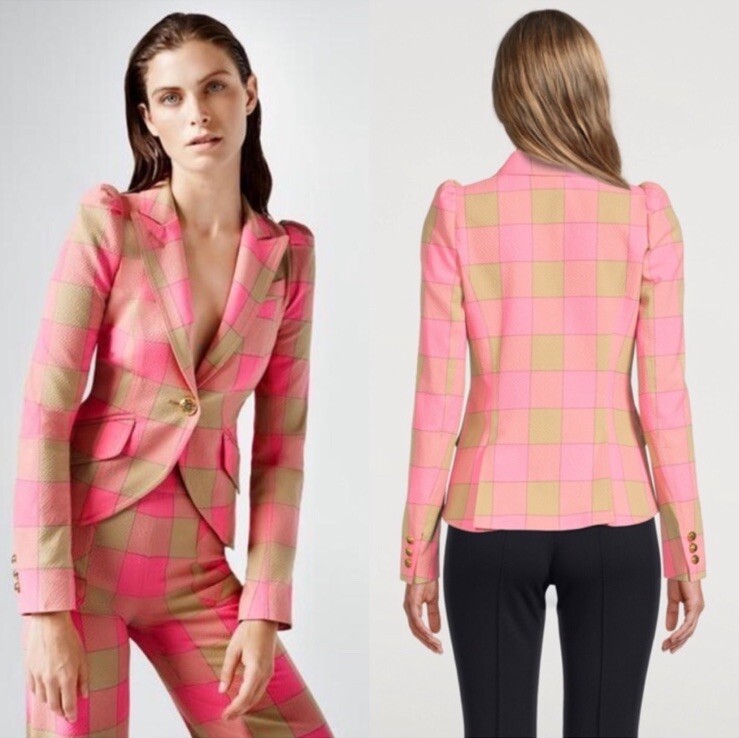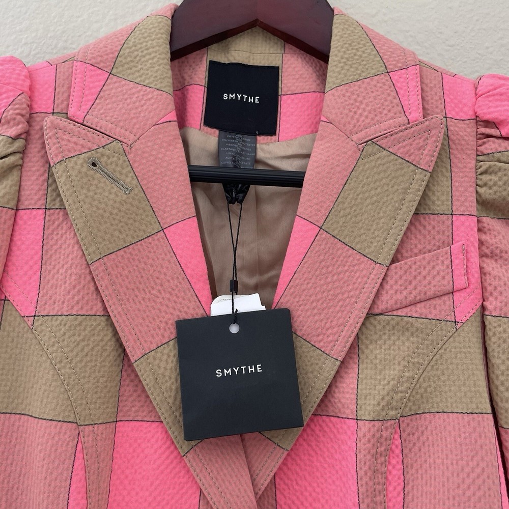 Smythe Pouf Sleeve One Button Blazer in pink check Size 2 See photos for measurements New with tags! Puffed sleeves, single button, lightweight seersucker fabric, bright pink and tan check print, button cuffs, comes with extra button, two stitched close pockets, tailored fit, feminine luxury designer Make me an offer! ❤️ Smoke free home! 🏡