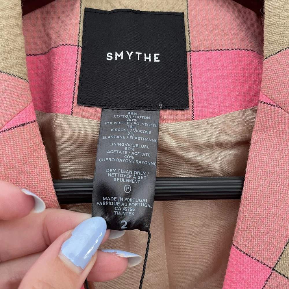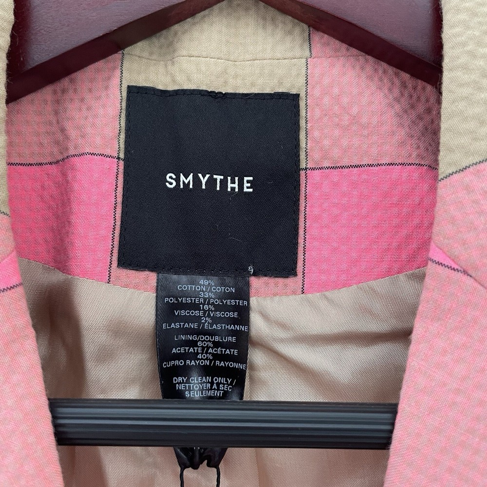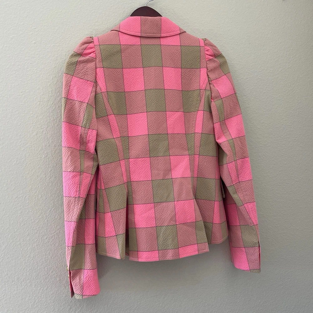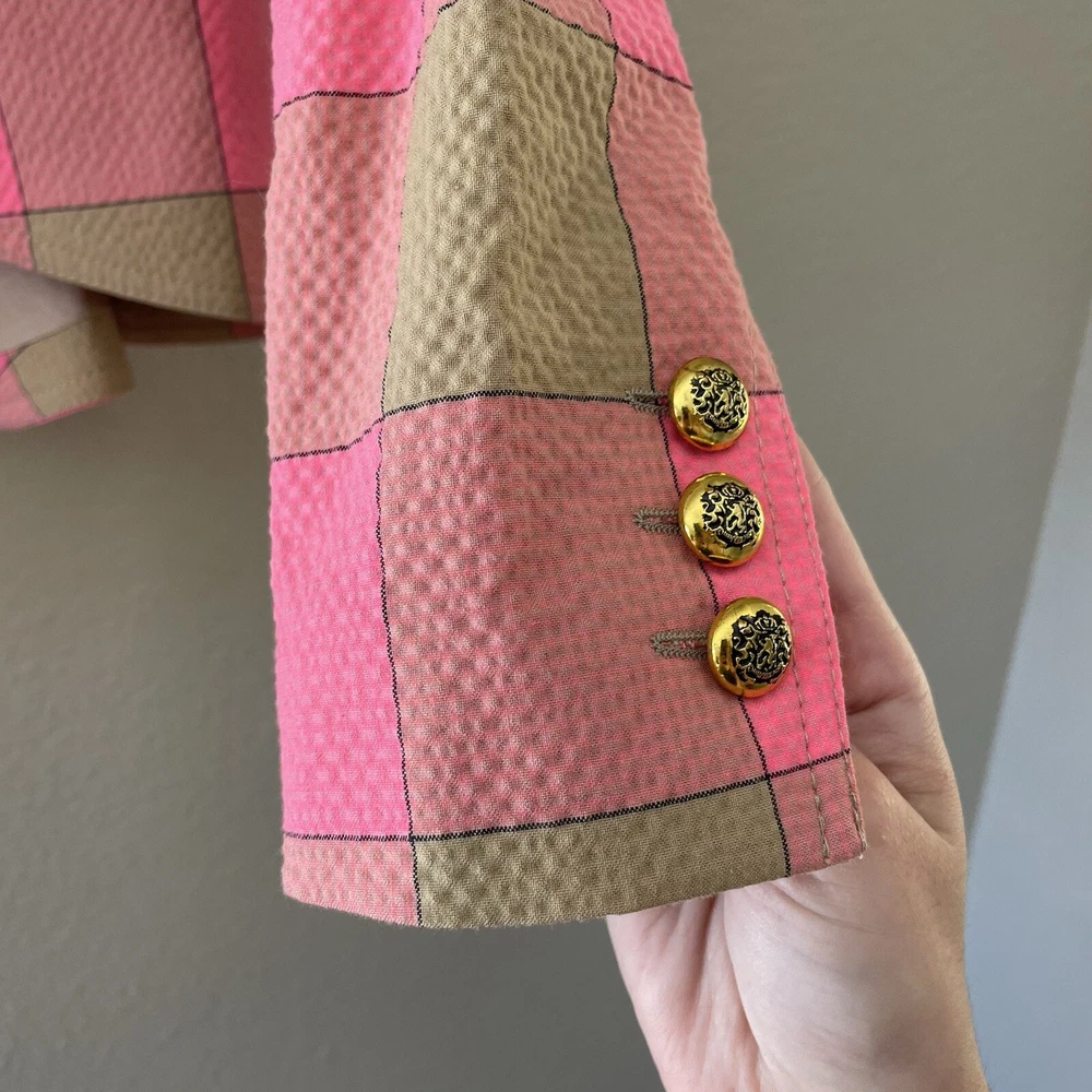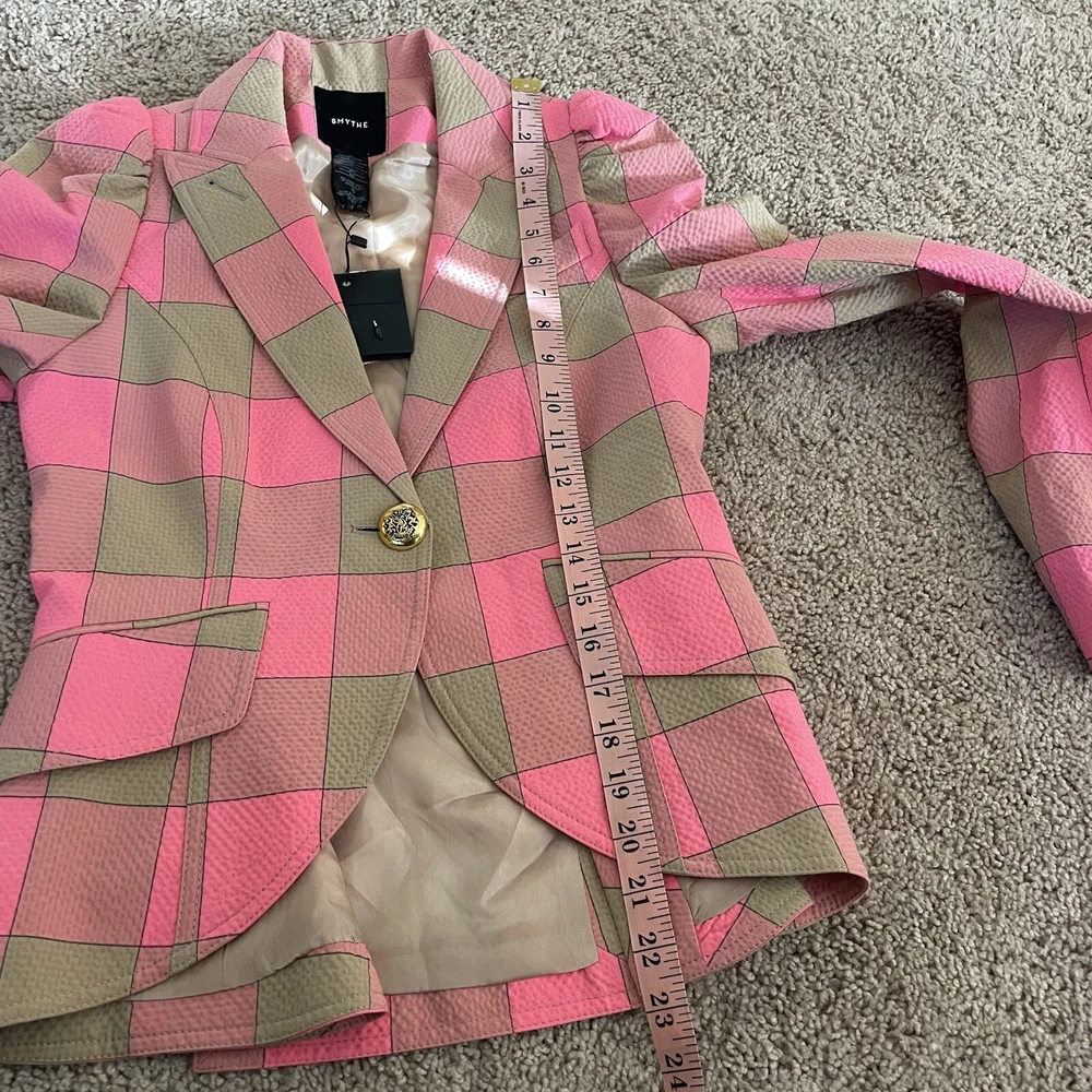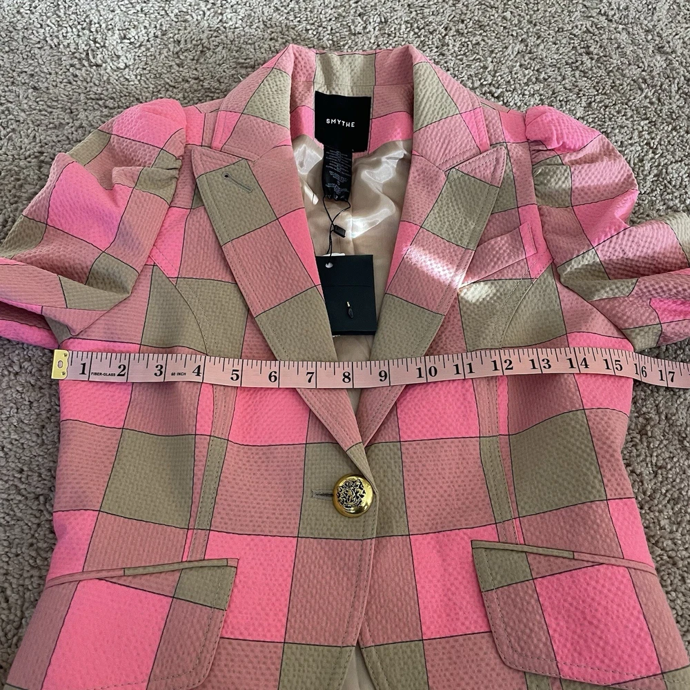 Absolutely love this blazer! The lightweight seersucker fabric makes it perfect for spring and summer, while the playful puffed sleeves and bold pink-and-tan check add a stylish pop. The tailored fit is flattering, and the extra button is a thoughtful touch. Designer Smythe delivers chic femininity—definitely a standout piece in my wardrobe! Great condition, smoke-free home. Highly recommend!