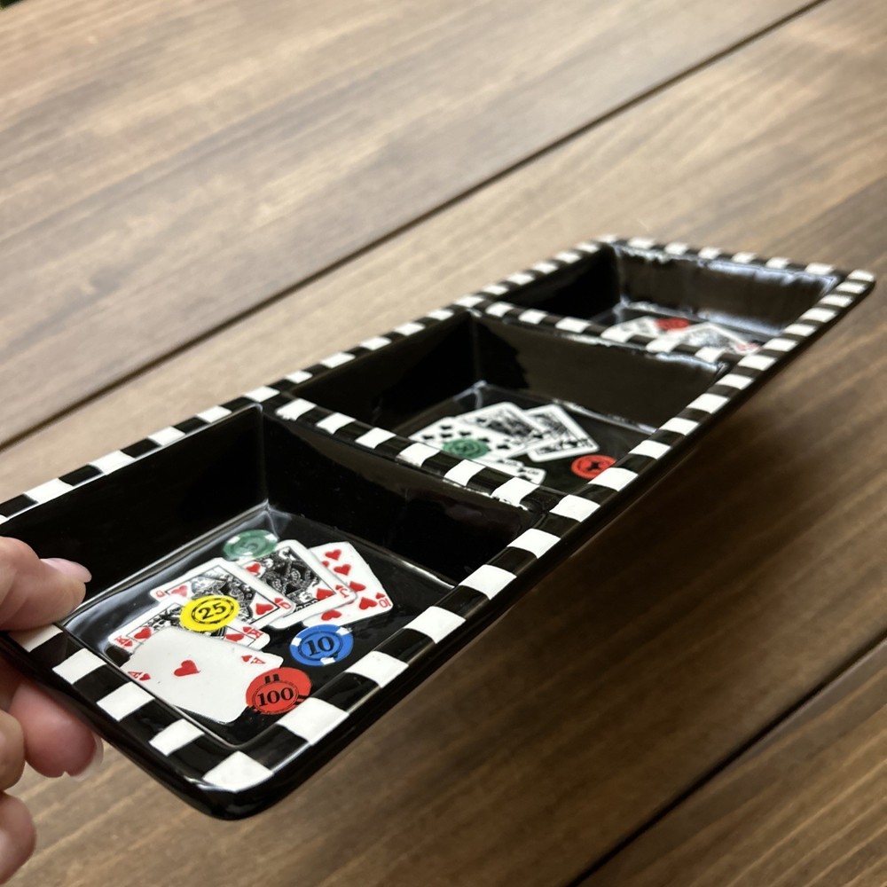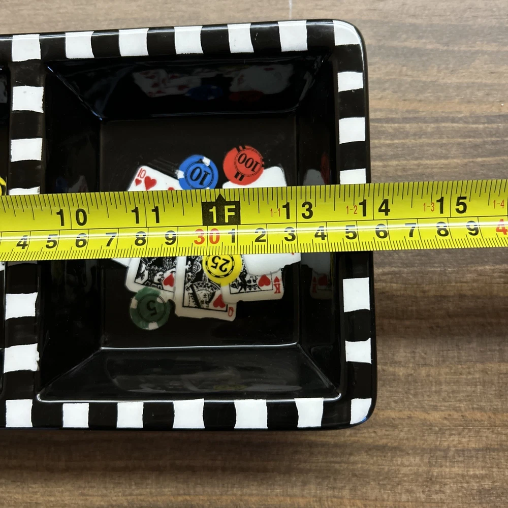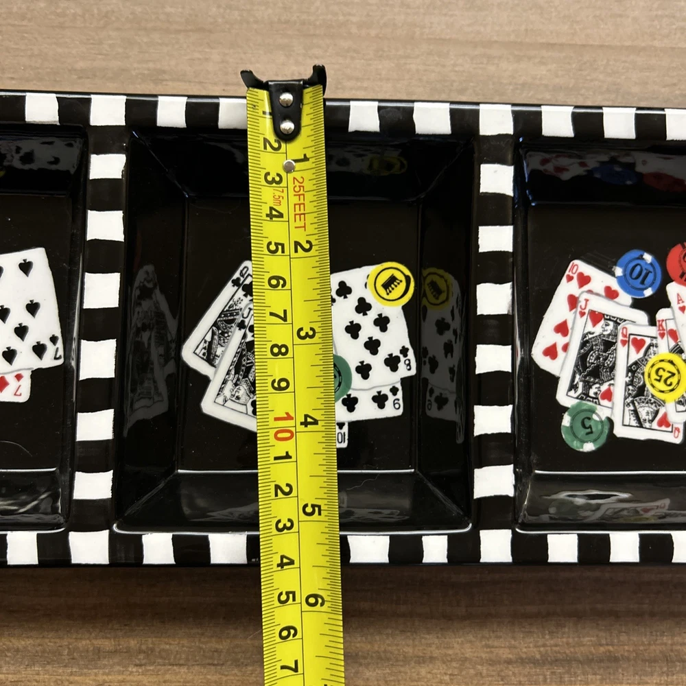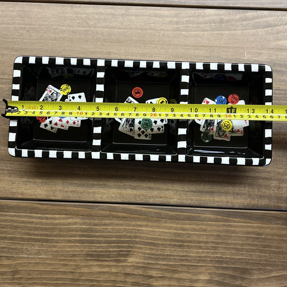 Pattern:Got Game / Poker HandBrand:Signature HousewaresMaterial:CeramicMPN:Does Not ApplyTheme:PokerFeatures:Dishwasher Safe, Microwave SafeCountry/Region of Manufacture:ChinaColor:BlackType:Serving Tray