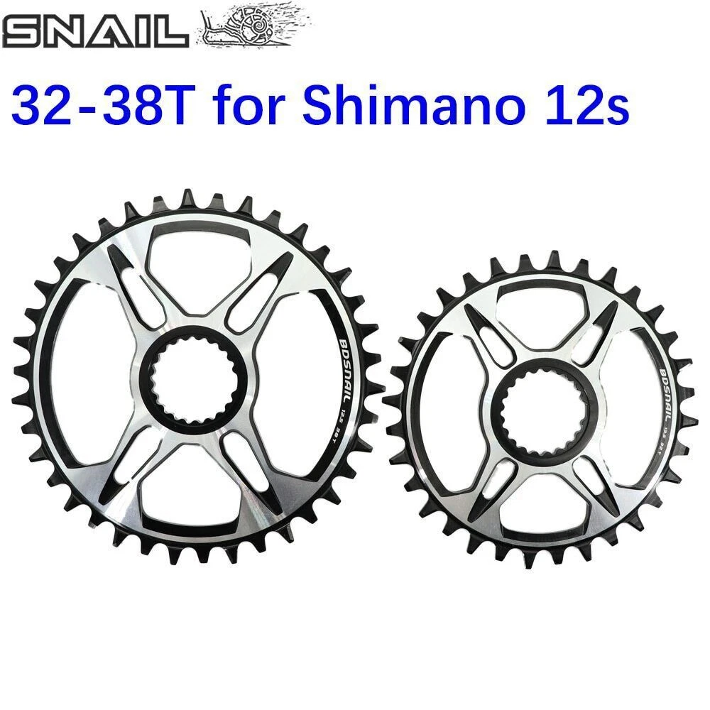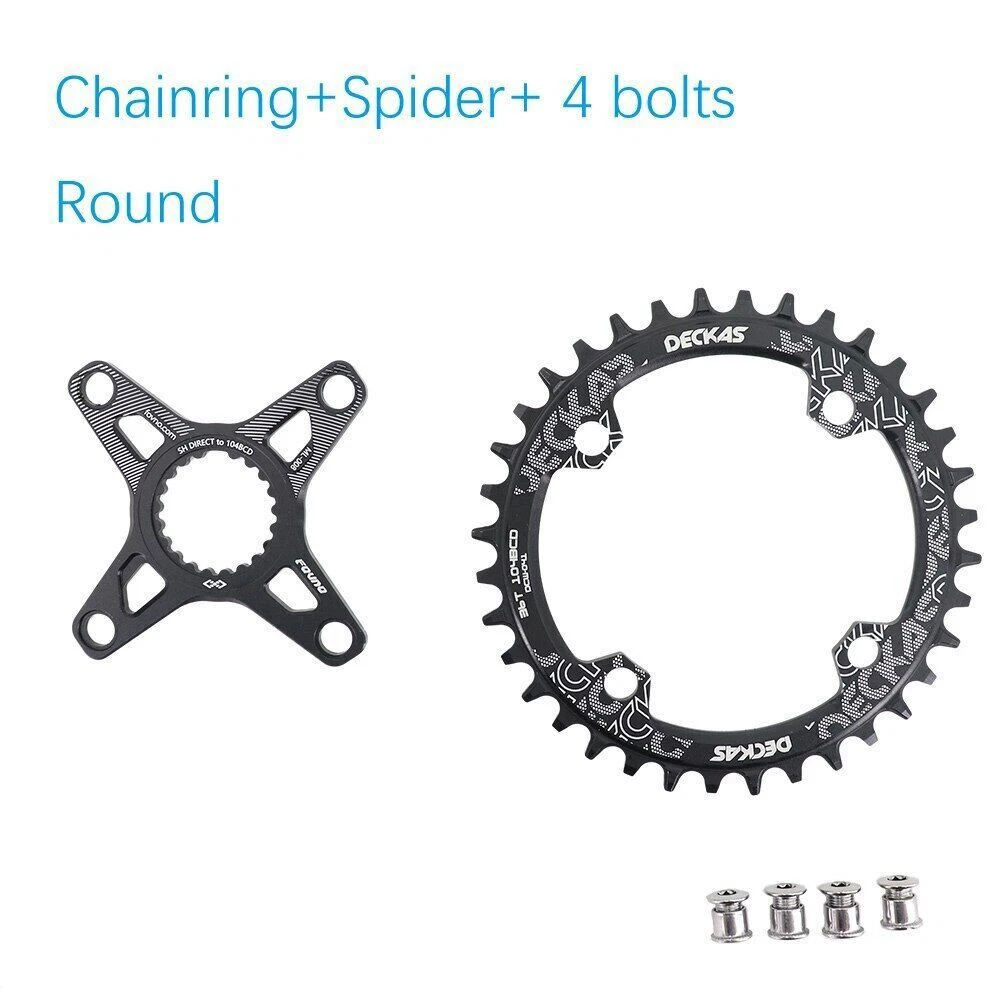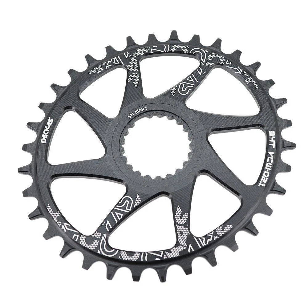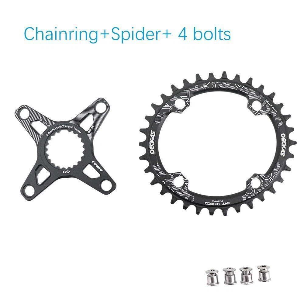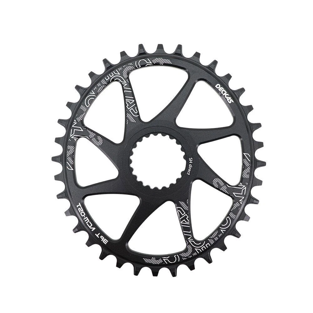 Model 1: Snail round chainring for shimano direct mount Snail direct mount chainring for 12 speed shimano direct mount crankset. Made by alu 7075 and CNC processed. Hollow tech make it lightweight but stiffness. Brand: Snail Material: alu 7075 Chain speed: 12 speed, 11 speed,10 speed, 9 speed Chainline:52mm offset: 3mm Tooth shape: Narrow wide tooth Surface treatment: Anodized black and silver Tooth: 32 34 36 38T Weight: 32T 68g, 34T 75g,36T 83g, 38T 91g Works for crank models: for Shimano M6100 M9100 M9120 M8100 M8120 M8130 M7100 FC-M7130 MT900, and all the shimano direct mount cranksets Package content: 1x chainring Model 2: Deckas oval chainring combo for shimano direct mount chainring Fovno is a high end brand of Deckas. Nice quality and design. You will like it. Surface treatment looks good compatible to Deckas brand. A same family products. Deckas direct mount chainring for 12 speed shimano direct mount crankset. Brand: Deckas and Fovno Material: alu 7075 Chain speed: 9-12 speed offset: 3mm Tooth shape: Narrow wide tooth Surface treatment: Anodized black Tooth: 32 34 36 38T Spider: Fovno brand. 39g weight. Shimano direct mount interface. Chainring: Deckas brand. 60-90g. 104BCD. 9-12 speed. Works for crank models: for Shimano M6100 M9100 M9120 M8100 M8120 M8130 M7100 FC-M7130 MT900, and all the shimano direct mount cranksets Package content: 1x Fovno spider 1x Deckas chainring 104BCD oval 4x bolts Model 3: Deckas oval chainring direct mount for shimano direct mount uni-body Brand: Deckas Offset: 3mm Weight: 70-90g Tool for install chainring