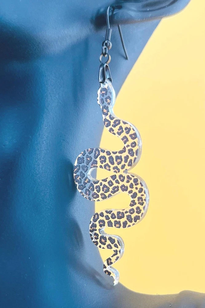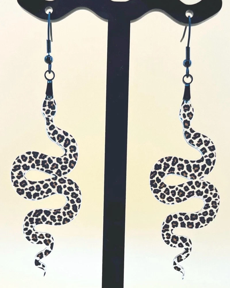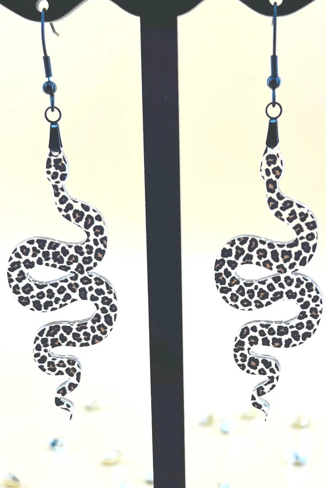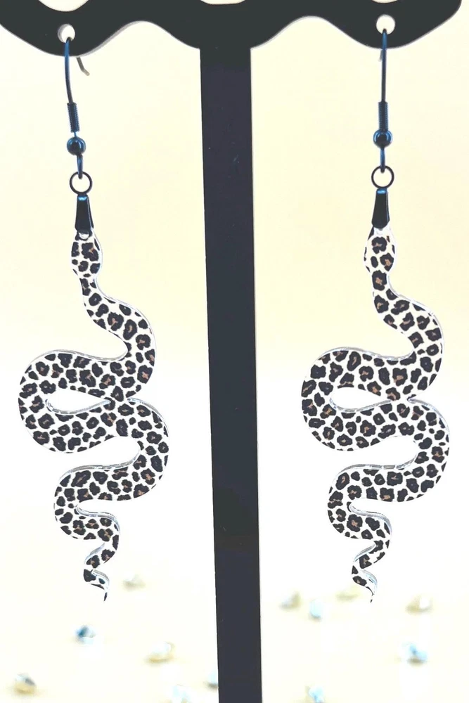 Elevate your style with these unique Snake Earrings, the perfect blend of Celestial and Halloween vibes. Embrace your inner witch with these goth-inspired Snake Lover Earrings. A must-have piece of Gothic jewelry that makes a thoughtful gift for her. Handcrafted for the ultimate witchy look. Lightweight Acrylic Earrings on a Stainless Steel hook. Earring hardware is stainless steel and nickel/lead free. 🌟(Please see item details/highlights/pictures for size information)🌟 Each earring is laser cut from acrylic and assembled by hand in our studio. 🌟Due to variation in the patterns and handmade processes, each earring will vary earring to earring. No two earrings will be identical but will look similar to what is pictured! Each pair of earrings comes on an earring card with silicone backers and packaged in an organza bag. Perfect for gift giving! We currently do not offer more gift-wrapping options. Shipping: All purchases are shipped in a box with tracking so that they arrive safely to you! Currently we only ship to US postal addresses. We have a set standard shipping time of 1-3 business days from the time your order is placed. Everything in our shop is already handmade and ready to ship FAST! Please be aware that unexpected delays can occur, which you will be notified at the time of any such occurrence. Jewelry Care: 🌟Each piece is delicate! Avoid dropping or bending! 🌟Do Not expose to excessive moisture, please remove jewelry before showering, swimming, and sleeping. 🌟Avoid abrasives, perfumes, lotions, excessive heat, chemicals etc. These may deteriorate your jewelry and may damage its appearance. 🌟Clean with the soft cloth we have included in your package (and it is FREE of Charge!) No Returns: Due to hygienic and safety reasons, ALL SALES ARE FINAL. We DO NOT accept returns. In the event you have an issue with your purchase, please feel free to message us on Etsy to discuss any possible resolution.