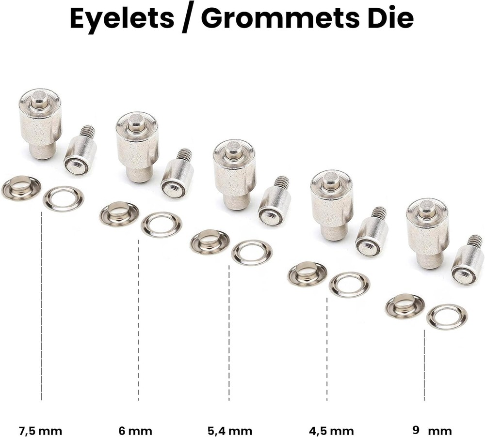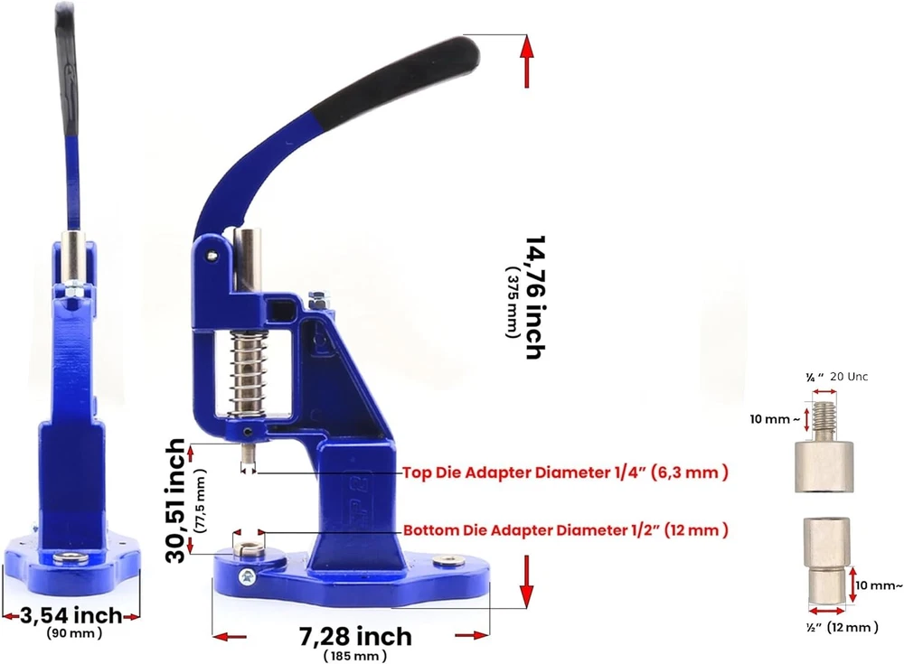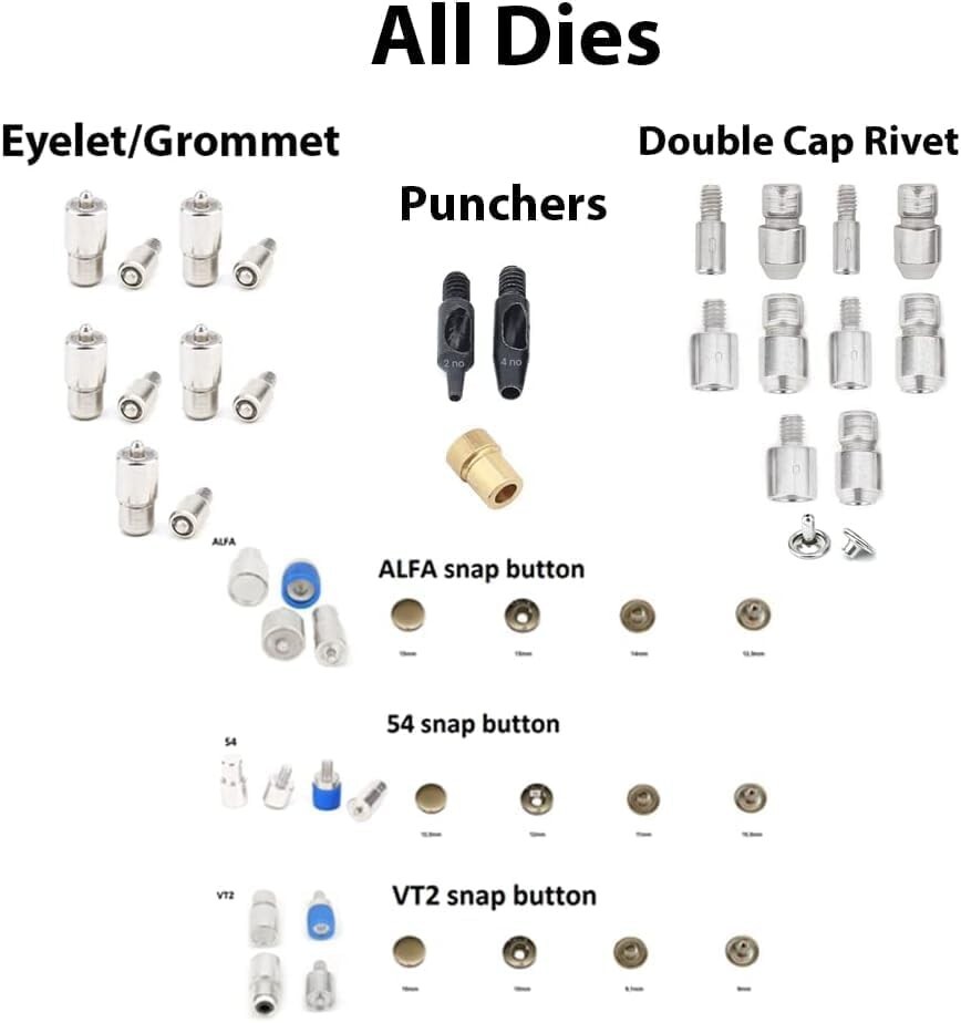Snap Button Fastener, Rivet, Eyelet, Grommet Hand Press Machine with Setting Dies All in One Set ★ This all-in-one set is perfect for setting rivets, eyelets, grommets, and snap button fasteners. The products are made of high quality, durable, and practical to use. Ideal for both professional and amateur use, can be used for DIY projects such as leather craft, fabric, cardboard, garments, belts, bags, and shoes. ★ 100% product new and high quality. Comes with essential installation dies, suitable for various snap buttons, rivets, grommets and eyelets. Easy to operate, can punch and set quickly and easily. ✔ Includes 17 pieces: Hand press machine, 3 sets Snap Button Dies, 5 sets Double Cap Rivet Dies, 5 sets Eyelet Grommet Dies and 2 mm, 4 mm hole punchers for press machine. ✔ Setting Dies: 10 mm, mm and 15 mm s spring metal snap button dies, 5 mm, 6 mm, 7 mm, 9 mm and 12 mm double cap rivet dies, mm, mm, 6 mm, mm and 9 mm eyelet grommet dies and 2 mm, 4 mm punching dies with one brass base. ⚠ Please note that: The accessories are not included. This listing includes hand press machine and installation dies molds. Rivet, grommets and snap buttons are not included. Hand press machine Specs: Machine is product new DZNTOOLS, made of aluminium and manufactured in Turkey. It weighs 1650 is a universal machine and, with the proper die, you can use it to install snaps, grommets, eyelets, fabric-covered buttons, rivets, jeans tack buttons, top screw thread diameter is 1/4'' inch (6,3 mm). The bottom diameter size is 1/2’ inches (11,9 mm)Dies Specs: Dies screw top thread size of mm (1/4"), bottom diameter size of mm (1/2’’), and are compatible with DZNTOOLS hand press machine. If you have a different hand press, please check your hand press measurements to ensure they match the requirements of your machine.Package includes press machine, 3 sets Snap Button Dies, 5 sets Double Cap Rivet Dies, 5 sets Eyelet Grommet Dies and 2 mm, 4 mm hole punchers and brass base. Total 17 pieces.