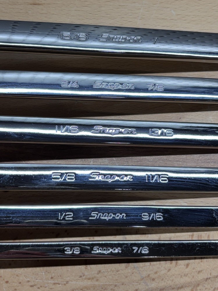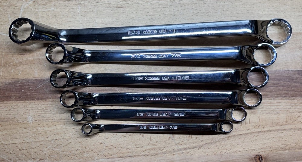 Up for bids is a brand new Snap-On 6 Piece 12 Point SAE Flank Drive 60 Degree Deep Offset Box Wrench Set. It consist of numbers: XO1214 (3/8'-7/16"), XO1618 (1/2"-9/16"), XO2022 (5/8"-11/16"), XO2226 (11/16"-13/16"), XO2428 (3/4"-7/8") and lastly XO3032 (15/16"-1"). Superb set for the arsenal. Satisfaction guaranteed. Shipping & handling will be $9.99 to most US destinations. Hawaii & Alaska may have an additional shipping cost. International bidders contact me for shipping quote. Payment due immediately if Buy it Now is used, otherwise five (5) days from end of auction. If there is a problem please contact me, I will try and work it out if within reason. Feedback is essential for buyer & seller and is what makes eBay work. Thanks for bidding