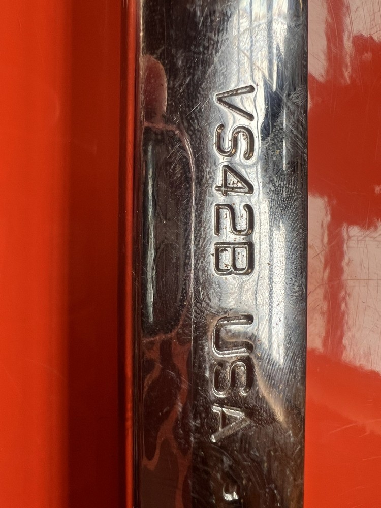 The Snap-On VS42B 1-5/16" SAE Four-Way Angle Head Open End Wrench is a high-quality hand tool designed for automotive use. Made in the United States by Snap-on, a reputable brand in the industry, this single item wrench features a 13" long handle with a 1-5/16 inch size suitable for various applications. The open-end design and four-way angle head make it versatile for different tightening and loosening tasks, making it a valuable addition to any toolbox for professionals and automotive enthusiasts alike. Has some slight surface rust and scratches but in good working condition