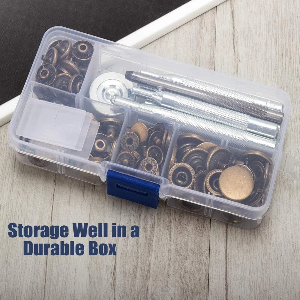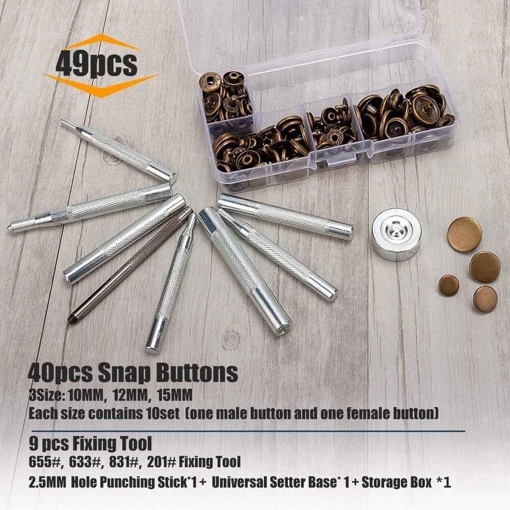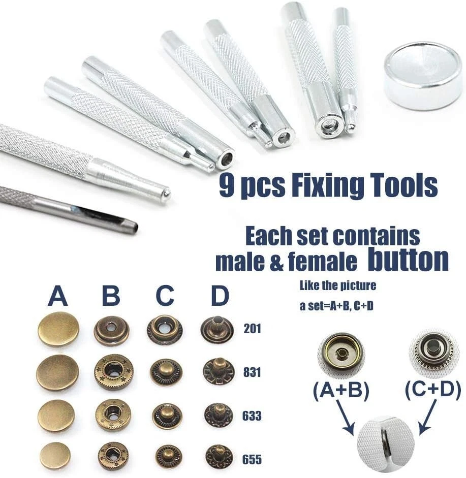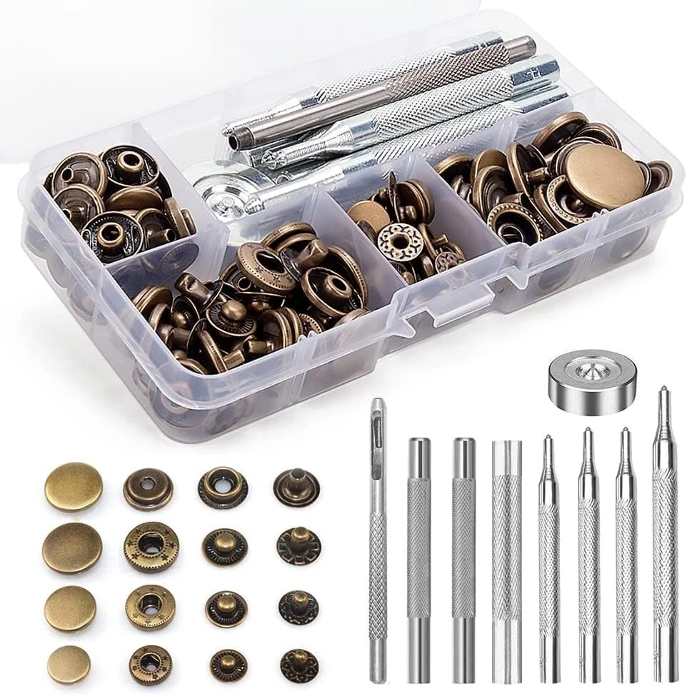 Snaps Fasteners Kit for Leather β 40 Sets of Durable Metal Snap Buttons with 9 Setting Tools Upgrade your DIY leathercraft projects with this Snaps Fasteners Kit, which includes 40 sets of high-quality metal snap buttons and 9 professional setting tools. Perfect for leather, fabric, denim, canvas, and other materials, these sturdy snaps provide a secure and stylish fastening solution for jackets, bags, belts, wallets, and more. Whether you're a professional tailor, leatherworker, or DIY enthusiast, this kit has everything you need for easy snap installation and long-lasting durability. π© Key Features & Benefits β 40 Complete Snap Sets β Includes 40 sets of metal snap fasteners in a premium finish, ensuring a secure and stylish hold on leather, fabric, and other materials. β 9-Piece Setting Tool Kit β Comes with a punch tool, anvil, and setting dies to make installation quick and hassle-free, even for beginners. β High-Quality Metal Construction β Made of rust-resistant, heavy-duty metal, these snap buttons are durable and long-lasting for all your projects. β Versatile Applications β Ideal for leathercraft, jackets, coats, bags, wallets, belts, denim, canvas, and even DIY home projects. β Easy to Use β Designed for both beginners and professionals, this snap fastener kit allows for smooth installation with precise and secure results. β Compact Storage Box β Keeps all components organized and easy to access, ensuring no lost pieces during projects. π Whatβs Included in the Kit? πΉ 40 Sets of Metal Snap Buttons β Includes all 4 snap parts (cap, socket, stud, and post) for complete fastener assembly. πΉ 9-Piece Setting Tools β Contains punch tool, anvil, setting dies, and hammer rod for seamless installation. πΉ Storage Box β Keeps everything organized, portable, and easy to use. π Product Specifications β Material: Heavy-duty metal alloy, rust-resistant β Number of Snaps: 40 complete sets β Number of Tools: 9 professional setting tools β Colors: Available in classic metallic finishes (silver, bronze, gunmetal, and gold) β Application: Works with leather, fabric, denim, canvas, and synthetic materials π οΈ Perfect for Various Projects β Leathercraft & Repairs β Great for handmade leather wallets, purses, keychains, and accessories. β Clothing & Fashion β Secure jackets, coats, jeans, skirts, and shirts with professional-quality snaps. β DIY Home & Outdoor Gear β Ideal for canvas tents, tarps, backpacks, and upholstery projects. β Bag & Shoe Making β Add durable snaps to handmade bags, belts, and shoes with ease. π§ Easy Snap Installation in 3 Simple Steps! 1οΈβ£ Punch a Hole β Use the included punch tool to create a precise hole in your material. 2οΈβ£ Place the Snap Components β Align the cap and socket on one side and the stud and post on the other. 3οΈβ£ Secure with Setting Tools β Use the anvil and hammer rod to tighten and lock the snap into place. π© Get Professional-Quality Snaps for All Your Leather & Fabric Projects! This Snaps Fasteners Kit provides everything you need for strong, stylish, and durable fastenings. Whether you're repairing old snaps or creating new leather goods, this kit is a must-have for any DIY enthusiast, tailor, or leatherworker. π¦ Order Today & Start Crafting Like a Pro!