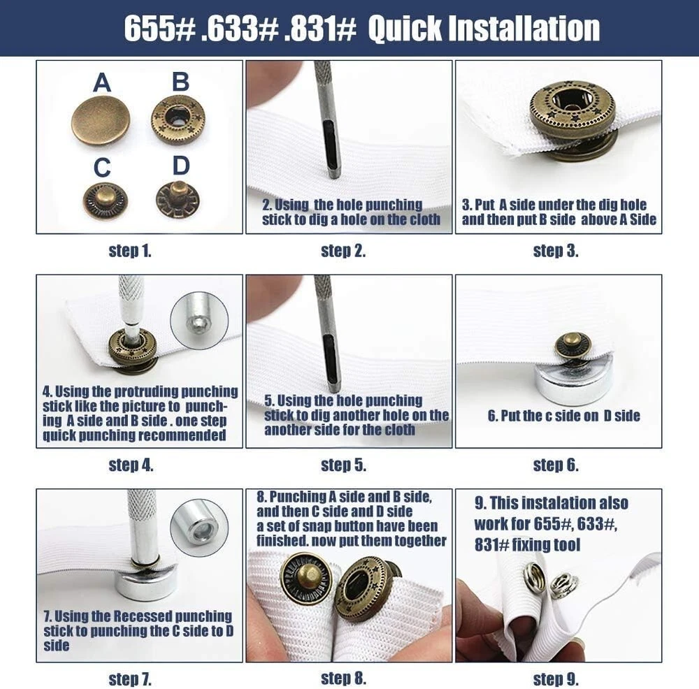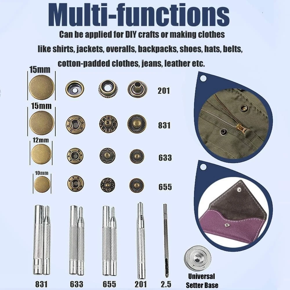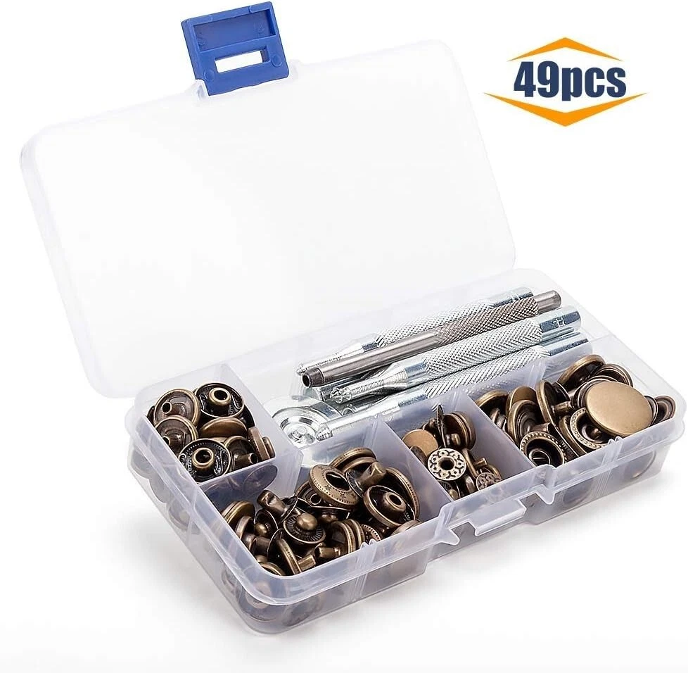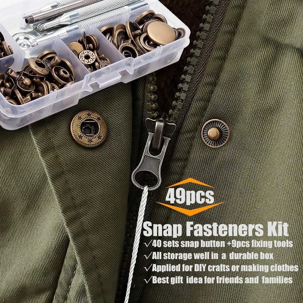 Snaps Fasteners Kit for Leather β 40 Sets of Durable Metal Snap Buttons with 9 Setting Tools Upgrade your DIY leathercraft projects with this Snaps Fasteners Kit, which includes 40 sets of high-quality metal snap buttons and 9 professional setting tools. Perfect for leather, fabric, denim, canvas, and other materials, these sturdy snaps provide a secure and stylish fastening solution for jackets, bags, belts, wallets, and more. Whether you're a professional tailor, leatherworker, or DIY enthusiast, this kit has everything you need for easy snap installation and long-lasting durability. π© Key Features & Benefits β 40 Complete Snap Sets β Includes 40 sets of metal snap fasteners in a premium finish, ensuring a secure and stylish hold on leather, fabric, and other materials. β 9-Piece Setting Tool Kit β Comes with a punch tool, anvil, and setting dies to make installation quick and hassle-free, even for beginners. β High-Quality Metal Construction β Made of rust-resistant, heavy-duty metal, these snap buttons are durable and long-lasting for all your projects. β Versatile Applications β Ideal for leathercraft, jackets, coats, bags, wallets, belts, denim, canvas, and even DIY home projects. β Easy to Use β Designed for both beginners and professionals, this snap fastener kit allows for smooth installation with precise and secure results. β Compact Storage Box β Keeps all components organized and easy to access, ensuring no lost pieces during projects. π Whatβs Included in the Kit? πΉ 40 Sets of Metal Snap Buttons β Includes all 4 snap parts (cap, socket, stud, and post) for complete fastener assembly. πΉ 9-Piece Setting Tools β Contains punch tool, anvil, setting dies, and hammer rod for seamless installation. πΉ Storage Box β Keeps everything organized, portable, and easy to use. π Product Specifications β Material: Heavy-duty metal alloy, rust-resistant β Number of Snaps: 40 complete sets β Number of Tools: 9 professional setting tools β Colors: Available in classic metallic finishes (silver, bronze, gunmetal, and gold) β Application: Works with leather, fabric, denim, canvas, and synthetic materials π οΈ Perfect for Various Projects β Leathercraft & Repairs β Great for handmade leather wallets, purses, keychains, and accessories. β Clothing & Fashion β Secure jackets, coats, jeans, skirts, and shirts with professional-quality snaps. β DIY Home & Outdoor Gear β Ideal for canvas tents, tarps, backpacks, and upholstery projects. β Bag & Shoe Making β Add durable snaps to handmade bags, belts, and shoes with ease. π§ Easy Snap Installation in 3 Simple Steps! 1οΈβ£ Punch a Hole β Use the included punch tool to create a precise hole in your material. 2οΈβ£ Place the Snap Components β Align the cap and socket on one side and the stud and post on the other. 3οΈβ£ Secure with Setting Tools β Use the anvil and hammer rod to tighten and lock the snap into place. π© Get Professional-Quality Snaps for All Your Leather & Fabric Projects! This Snaps Fasteners Kit provides everything you need for strong, stylish, and durable fastenings. Whether you're repairing old snaps or creating new leather goods, this kit is a must-have for any DIY enthusiast, tailor, or leatherworker. π¦ Order Today & Start Crafting Like a Pro!
