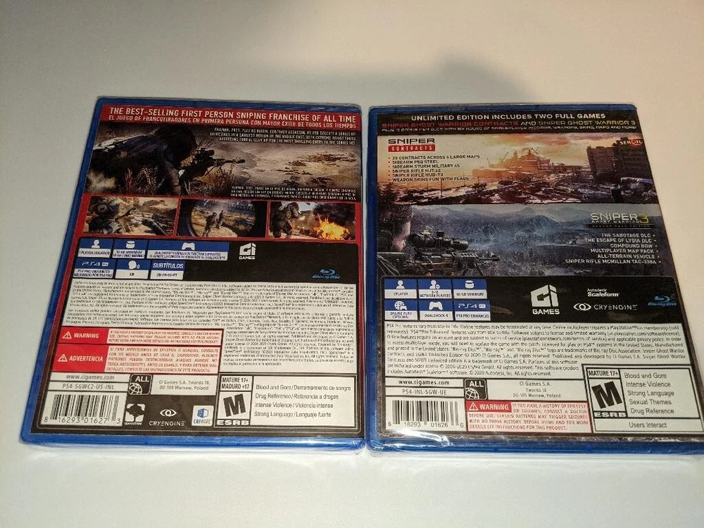 Brand New Sealed! INCLUDES ●Sniper Ghost Warrior Contracts (Unlimited Edition) ●Sniper Ghost Warrior Contracts + Sniper Ghost Warrior 3 ●Season Pass for SGCW 3 ●Bonus DLC content ●Sniper Ghost Warrior Contracts 2 (Standard Edition) Free shipping offer for bundle Disclaimer: No Returns Accepted Please note that I do not accept returns on these items. Both games are brand new and factory-sealed. Any opened or unsealed products will not be eligible for return. Please review the listing carefully before purchasing, and feel free to ask any questions. Thank you for your understanding!