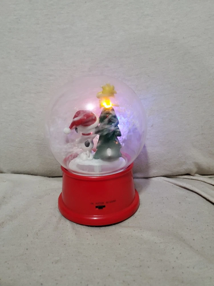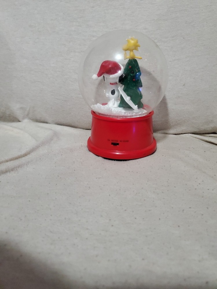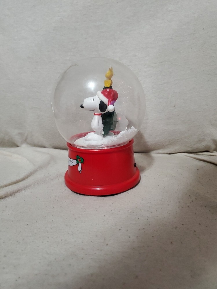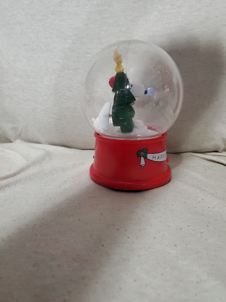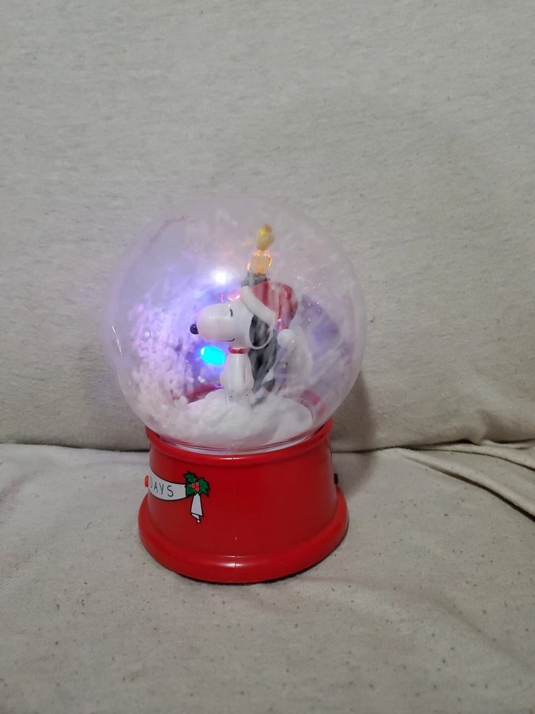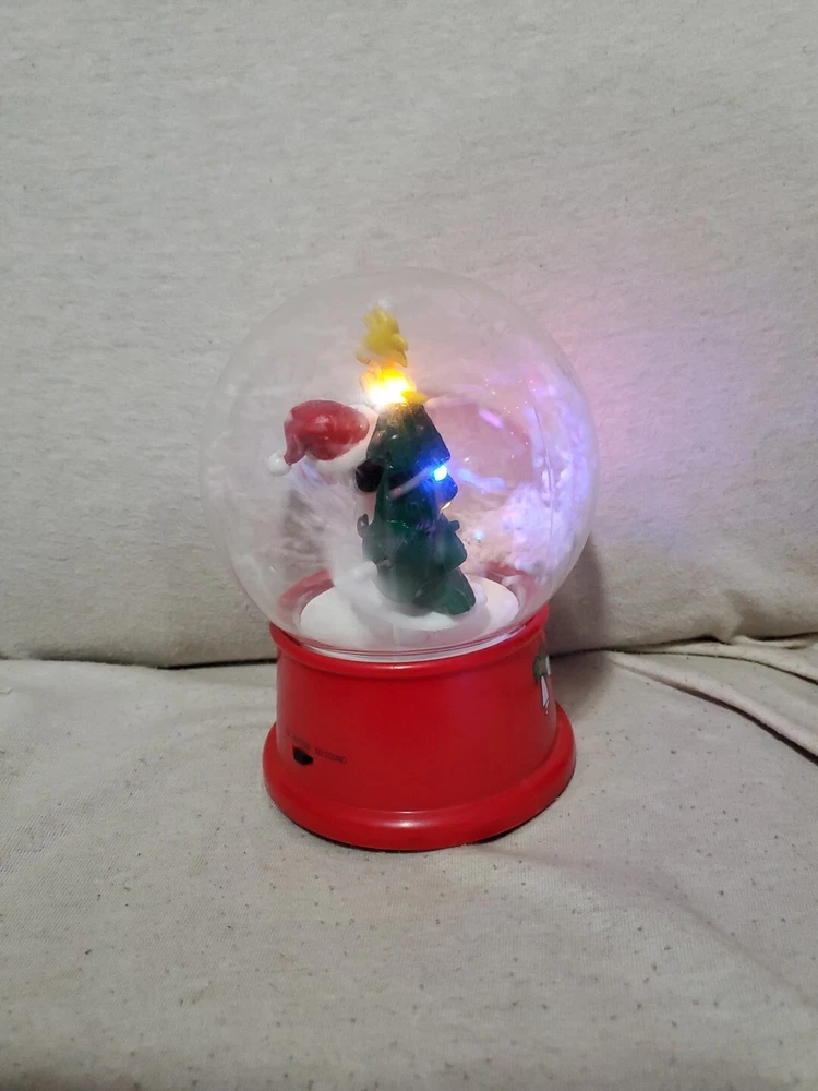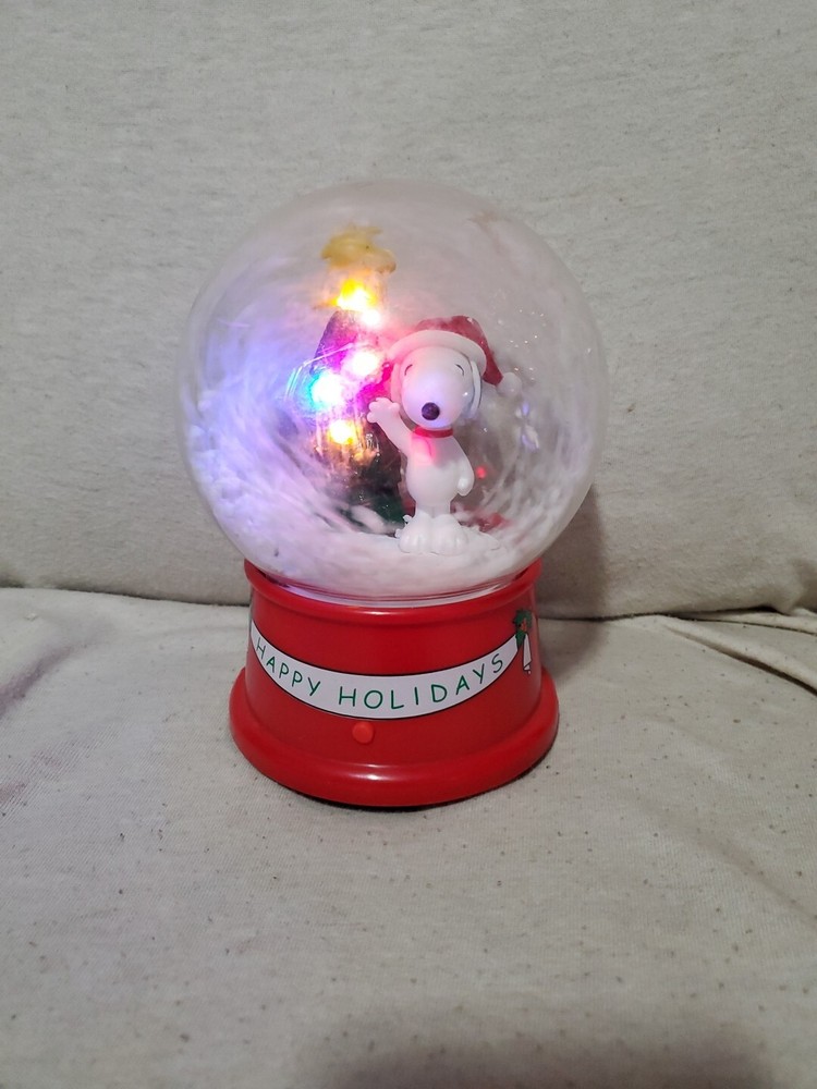 Gemmy Snoopy & Woodstock Happy Holidays Musical Waterless Snow Globe Tree Lights WORKS Batteries Not Included