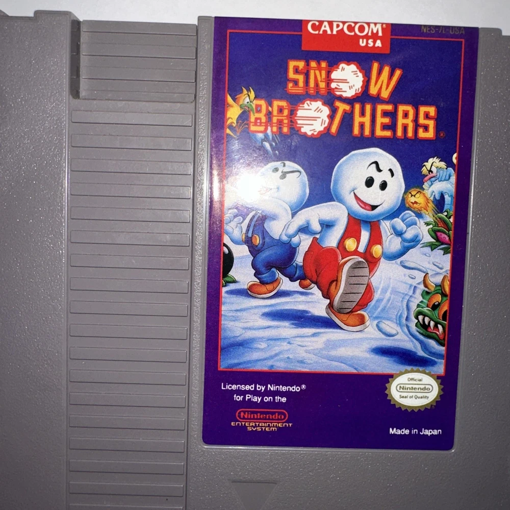 The product is a rare Nintendo Entertainment System game cartridge of "Snow Brothers" released in 1991 by Capcom. This action and adventure game is rated E10+ (Everyone 10+). The game follows the story of two snowboarding brothers as they go on various exciting adventures in the snowy mountains. Players can expect an engaging gameplay experience with challenging levels and fun gameplay mechanics.