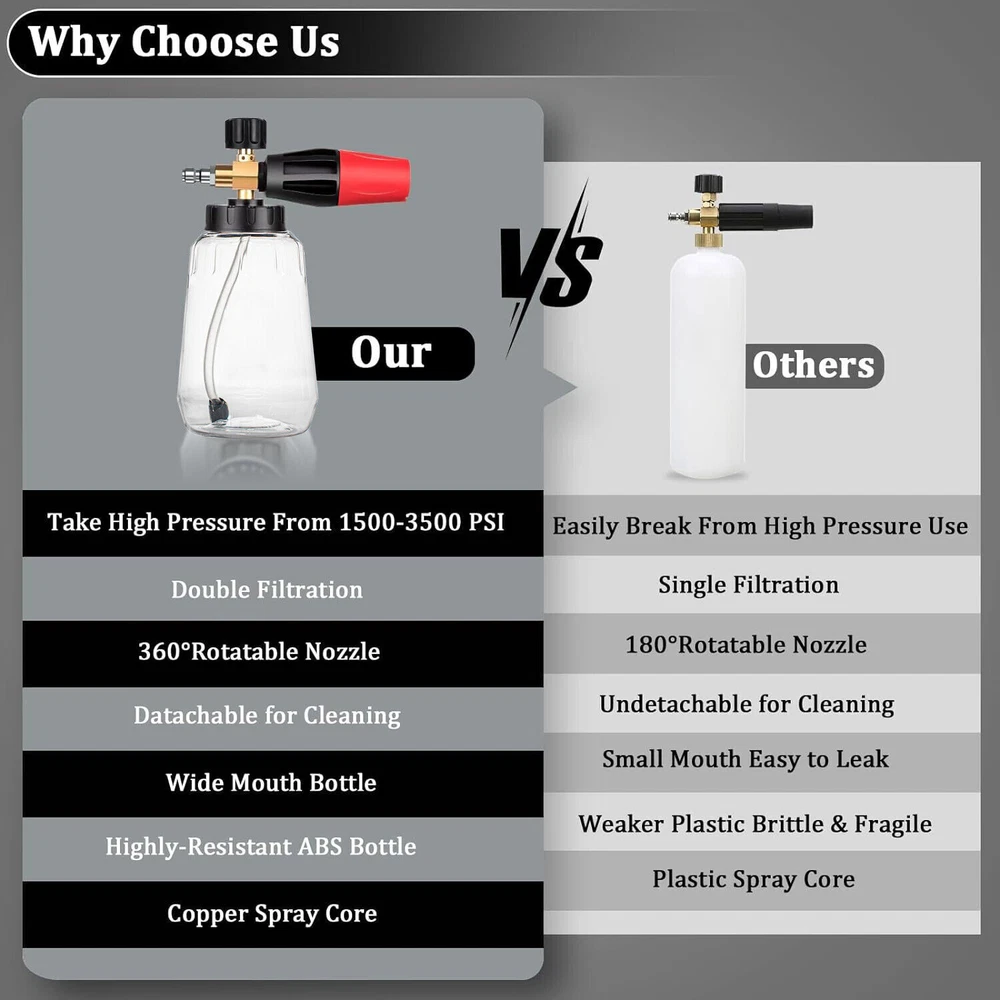 Features 【BIG MOUTH FOAM CANNON】 【ADJUSTABLE NOZZLE UPGRADE DESIGN】 【HIGH QUALITY】 【EASY TO USE】 【MULTIPLE USE PRESSURE WASHER FOAM CANNON】 Package includes: 1x Soap Foam Cannons Snow Foam Lance Cannon Soap Bottle Sprayer For Pressure Washer Gun Jet Car Wash Features 【 BIG MOUTH FOAM CANNON 】: Our car soap foam gun simplifies the process of washing your car by producing a thick and luxurious foam. Its easy-to-pour bottle design ensures that you won't waste any soap liquid. 【 ADJUSTABLE NOZZLE UPGRADE DESIGN 】: To achieve the thickest foam mixture, simply turn the top knob in a right (-) direction. This knob controls both the amount of water used and the overall thickness of the foam. Due to the foam gun's design, you'll be able to produce a thick, high-quality foam that is perfect for washing your car or other vehicles. 【 HIGH QUALITY 】: The adjustable nozzle is constructed with a heavy-duty brass core and stainless steel, which improves the sealing of the joint effectively. our car wash foam gun can handle a maximum working pressure of3800 PSI. The knob can be adjusted to achieve the desired foam level, and the adjustable nozzle can be modified to change the spray width and angle as necessary. 【 EASY TO USE 】: This snow foam cannon is very easy to use. It comes with 1/4 inch quick connect accessories and an upgraded filter block design that provides maximum protection against damage from foam or water particles while being used. The 1/4 quick coupling allows the cannon to be securely attached to your pressure washer gun. Additionally, the adjustable foam concentration and spray angle help to improve the foam coverage and cleaning effectiveness. 【 MULTIPLE USE PRESSURE WASHER FOAM CANNON 】: Our foam sprayer is compatible with most pressure washers and can be used for a variety of applications, including washing cars, bikes, motorcycles, floors, windows, driveways, roofs, and siding. It's great for removing dust and dirt from your vehicle, including even the smallest cracks and crevices. Package includes: 1x Soap Foam Cannons Payment Shipping Return Contact us About us Payment 1.Paypal, Credit Card, G Pay etc, many payment way is accepted. 2.Please be sure your shipping address is correct before make a payment. Shipping 1.We will ship out the item within 1-3 business days after comfirming the payment, appreciate your patience. 2.If the items are broken on the way( we will check the orders clearly before we sent them ),please contact us in 3 days you received it. We will send you a new one or refund your payment. Return 1.We stand behind every buyer.Items can be returned for exchange or refund within 30 days. 2.Please contact us when you have any confusion of our item, we will solve the trouble for you as soon as possible. Contact us 1.This is professional Seller.We will reply your message within 24 hours. 2.Please contact us whenever you have any question about the item. We will deal with it as soon as possible. 3. If you are unhappy with the item or our service,please Contact Us before leave feedback,just give me a chance,thank you! About us 1. Unless specified otherwise, all our products are IN STOCK and are shipped from Local warehouse - Not Overseas! 2. We provide a 30 day Satisfaction Guarantee or your money back (provided items are in the same new and resaleable condition.) 3. We have a PayPal Verified Business Account, please buy with Confidence! 4. Every item will be tesrted before send.We know our products well and if we don't have the answers we will do our best to find them for you! 5. Our friendly team look forward to serving you! Your satisfaction is our No.1 Priority We will do our best to satisfacy you.