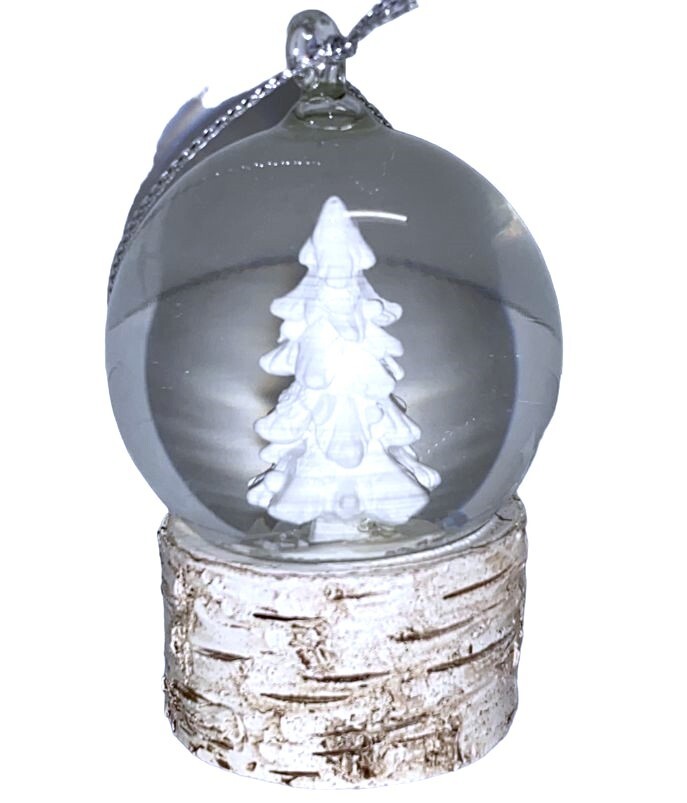 SEASONAL ABODE NEW WITH TAG Classic snowy white Christmas Tree snow water globe with rustic white birch look base ornament. 3" high Inv: 734331-353, 734400 [B77]