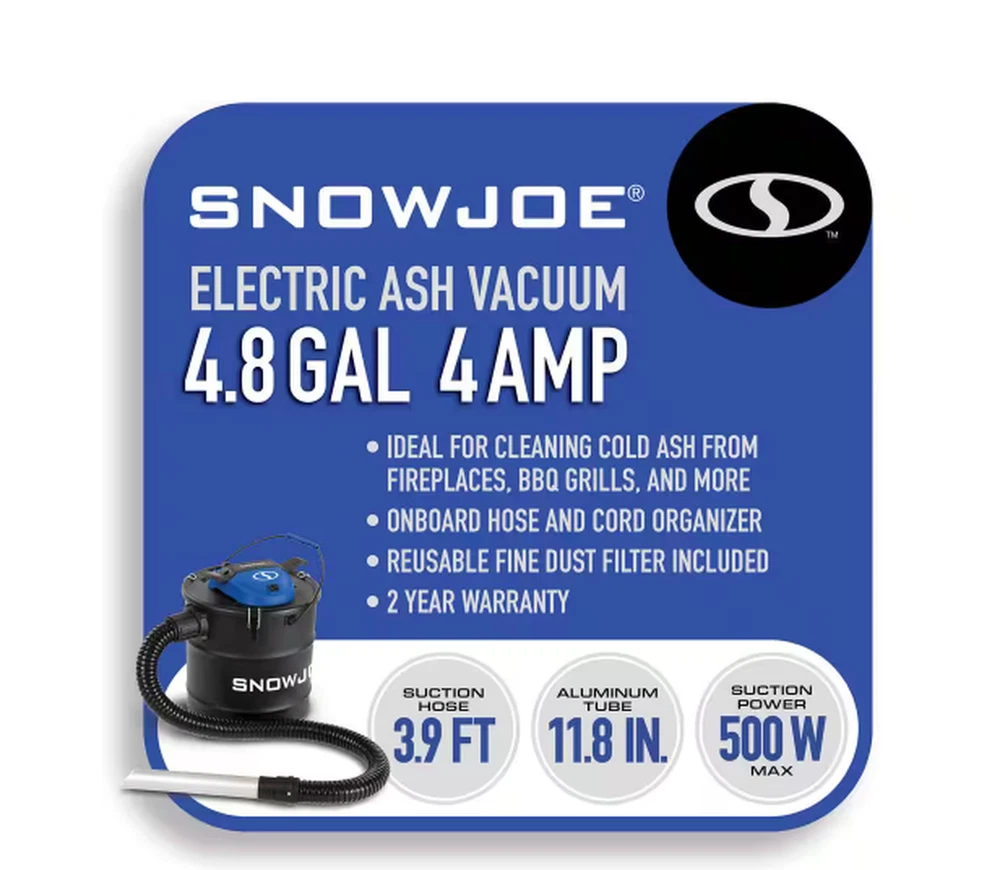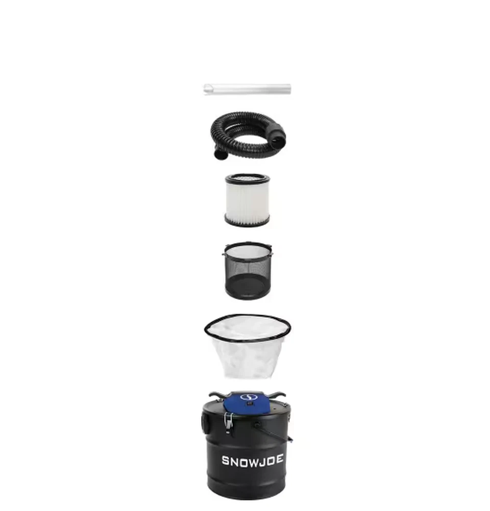 The Snow Joe ASHJ201 4.8 Gal. Ash Vac is designed for cold ash pickup from wood stoves, pellet stoves, fireplaces, firepits, and BBQ grills. Equipped with a dual filtration system that employs both a coarse-dust pre-filter and a fine-dust pleated filter, the Ash Vac effectively traps dust particles during the ash cleaning process and prevents them from escaping into your breathing space. No more dusty mess around your home. Operation is simple: just insert the Ash Vac's aluminum intake nozzle into your pile of cold ash, flip the switch, and watch its powerful 4 Amp motor generate up to 500 W of suction power and 42.4 cu. ft. per minute of air flow. The Ash Vac's extra-large metal canister stores up to 4.8 Gal. of ashes, so you can finish your task without stopping to empty the container. Plus, it's a self-contained, bag-free system, which allows for easy ash removal with a simple lift of the container lid. Other features include a safety stop switch to prevent the Ash Vac from operating without a properly fitted filter, a wire filter basket to protect the fine dust filter, an easy carry handle, an inspection window blockage indicator, and an onboard cord/hose organizer for convenient storage. Backed by a full 2-year warranty, the Ash Vac ASHJ201 is the reliable cleanup tool you'll need to deal with any ash problem in a simple, clean and safe way. Powerful 4 Amp motor generates up to 500-Watt of suction power Extra-large metal canister stores up to 4.8 Gal. of ashes Flexible, metal-reinforced suction hose (3.9 ft.) with aluminum intake nozzle (11.8 in.) ETL approved Designed for cold ash pickup from wood stoves, pellet stoves, fireplaces, firepits, and BBQ grills Reusable fine dust cartridge filter resists clogging and is easy to clean Dual filtration system: pre-filter + pleated filter to clean ashes dust-free Hose Length (ft.) 3.9 ft Interior Hose Diameter (in.) 1.6 in Product Depth (in.) 12.6 in Product Height (in.) 13 in Product Width (in.) 12.6 in Amperage (A) 4 A Appliance Category Floor Care Appliance Series Not Applicable Assembly Required Yes Bag Type Bagged Brush Bristle Type Plastic Brush Included Brushless Bundling Options Tool Only Cleaning Path Width (in.) 1.6 in Color Family Black Commercial/Residential Residential Cord Length (ft.) 8.5 ft Cordless/Corded Corded Filter Type Cartridge Floor Care Features Lightweight, Portable Floor Cleaning Type Vacuums Horsepower (hp) 0 Included Accessories No additional accessories included Noise Level (dB) 1 Number of Attachments 1 Number of Filters 1 Number of Wheels 0 Pack Size 1 Product Weight (lb.) 8.82 lb Recommended Surfaces Multisurface Voltage (v) 120v