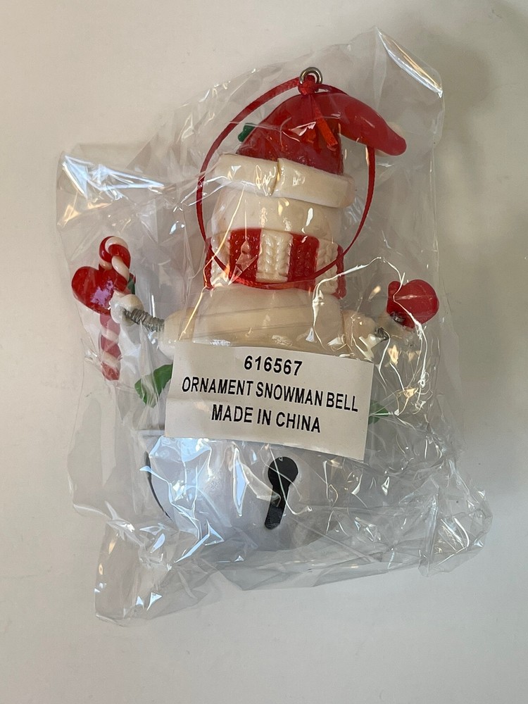 Snowman Bell Ornament w/ Red & White Scarf & Hat Christmas Springy Hands NIP. Also comes with small box.
