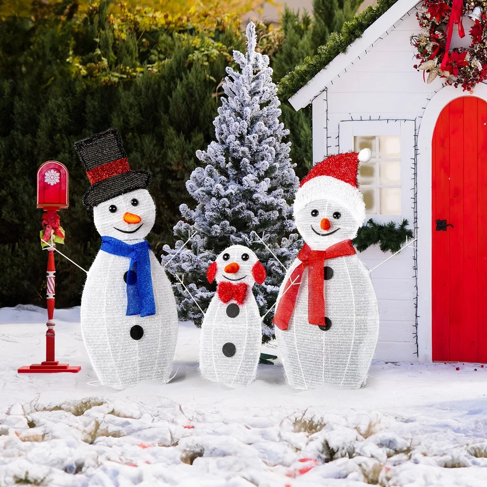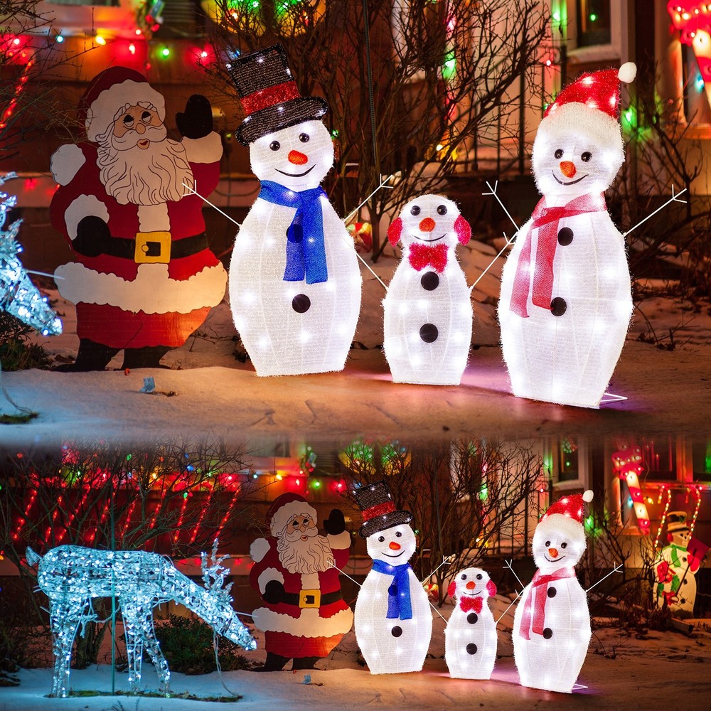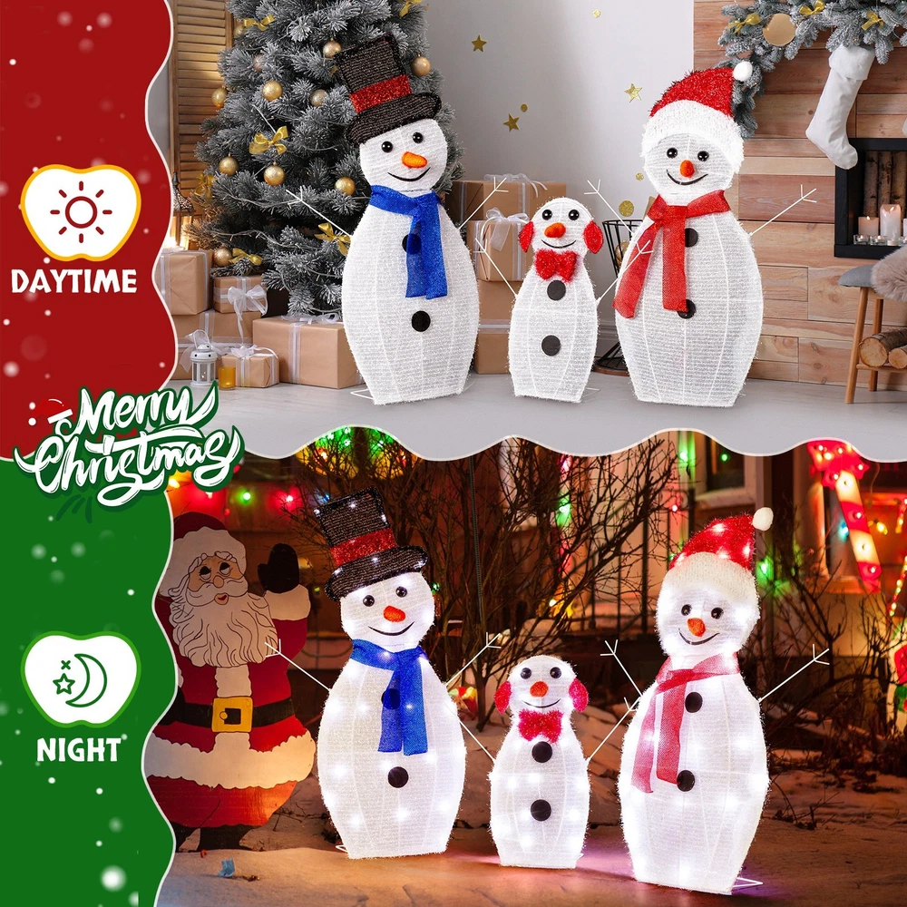 Create a warm and festive atmosphere with this enchanting set of Christmas lighted decorations. Perfect for both indoor and outdoor use, these glowing holiday displays will instantly brighten up your home, yard, or patio, making them a great addition to your seasonal décor. With durable construction and weather-resistant materials, these decorations are designed to withstand winter conditions, ensuring that they will bring holiday cheer year after year. Easy to set up and store, they provide a hassle-free way to enhance your holiday celebrations. Features: 1. Adorable Christmas Decoration: This set features a charming father, mother, and baby snowman, each wrapped in sparkling tinsel, with joyful expressions and open arms to welcome the Christmas season. Their delightful appearance will instantly enhance the festive spirit of your home and yard. 2. Eye-catching LED Lights: Pre-lit with 80 well-placed LED lights, the snowman family radiates a soft, white glow that illuminates your space beautifully at night. The lights bring your outdoor decor to life, making your home the highlight of the neighborhood during the holidays. 3. Easy Assembly and Storage: This collapsible Xmas decoration can be set up in minutes, allowing you to enjoy your festive display without hassle. Once the holiday season is over, the snowmen easily fold down into a compact size for convenient storage. 4. Weather-Resistant and Sturdy Build: Made from a durable, rustproof metal frame with waterproof fabric, this set is built to withstand wind, rain, and snow. The included ground stakes provide extra stability, ensuring your decorations stay secure in winter weather. 5. Perfect Holiday Decor for Indoor & Outdoor: Whether displayed in your living room, near your Christmas tree, on the porch, or in the yard, this lighted Christmas decoration adds a magical and cozy ambiance to any space. Its lightweight design makes it easy to move and position them wherever you want to spread holiday cheer. Specifications: 1. Father Snowman Size: (19.5 x 29) in / (49.5 x 73.7) cm 2. Mother Snowman Size: (19.5 x 28.5) in / (49.5 x 72.4) cm 3. Baby Snowman Size: (17 x 17) in / (43.2 x 43.2) cm 4. Overall Dimensions: (29 x 56) in / (73.7 x 142.2) cm 5. Number of Lights: 80 pcs 6. Light Color: White Package Includes: 1 x Snowman Family Christmas Lighted Decoration 1 x Set of Ground Stakes
