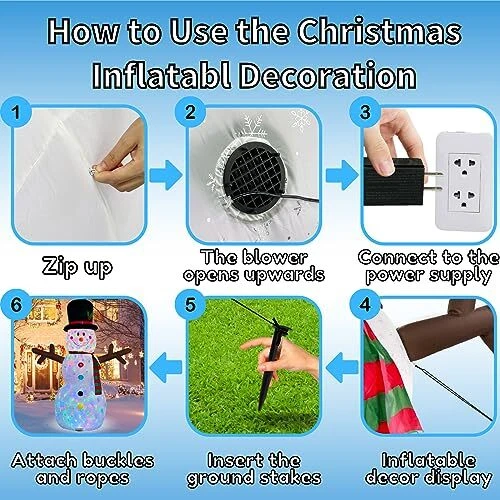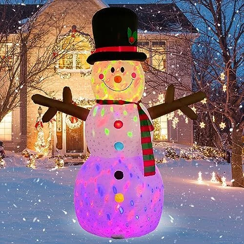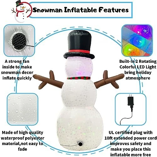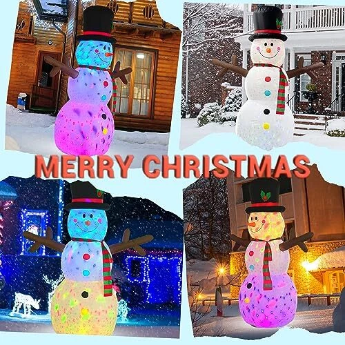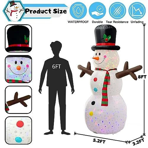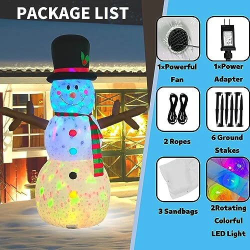 30 Days Return Policy Fast Delivery Trusted seller Snowman Inflatable Christmas Yard Decorations 8ft Giant Frosty Blow Up Snowman Inflatables Outdoor Rotating Colorful Led Lights Blowups Merry Xmas Winter Decor for Indoor Outside Lawn Vacation Product Description Durable & Waterproof Material:The 8ft tall giant snowman inflatable christmas yard decorations is made of thickened polyester,printed with snowflakes,which is waterproof,weather-proof, fadeproof,the excellent stitching improves the durability of the inflatable decor,It is against rips, tears and holes.This LED light blow up snowman inflatables outdoor decorations will create a xmas festive focal point in your outside front yard.It will bring the happy atmosp of christmas for you Built-In 2 Rotating Colorful LED Light & Printed with Snowflakes: The cute large christmas inflatables outdoor decorations with super 2 bright 360° rotating magic colorful LED lights. It will emit colorful lights which is very suitable for displaying at night. It will make funny blowups snow man inflatable decor outside look very real at winter night, make children’s love at first sight. It is easy to attract the attention of guests. Decorative yard in your neighborhood Safety & Reinforcement Design: It is equipped with 2 Fasten Ropes, 6 Ground Stakes and 3 fixed heavy sandbags that make it more stable. No need to worry that your merry christmas vacation inflatable snowmen will fly away with the wind and the blower's unique waterproof design protects the blower from water.uses only 12 volts, making it even safer. So this large frozen blowups snowman ensures it can stand indoor and outhouse for a long time Self-inflates Fast & Easy to Use: Blow up snowman inflatable for yard with a 10ft extended power cord which meaning that you can place it anyw. Just zip up the bottom zipper and plug into the power, It will be standing up to 8 foot tall within few minutes. Unplug the power, it is easy to deflate and storage without needing too much space. Note: Please make sure the blower is facing up when inflating Best Christmas Ornaments for Any Occasion: Great for indoor, outhouse, front yard, lawn, garden, stage prop, party, restaurants, cafes, home, party,family presents, xmas, new years,holiday, festivals, vacation. It looks super cool. The only thing you are worried about is just the huge snowman inflatables will be stolen from your yard Shipping Returns Payment Shipping Shipping is FREE to all addresses other than APO/PO boxes in the lower 48 states. All our stock ships from US-based warehouses. Shipped via USPS or UPS (depending on location and package weight) Unless stated otherwise, all orders will ship within 24-72 hours of your payment being processed. Check our feedback to see the great reviews of FAST shipping we offer. Returns As our valued customer, we will do our best to make sure the product you receive arrives to you on time and as expected. If you are not satisfied with your purchase, please contact us within 30 days of receiving your order to process a return. Payment We currently accept payment via eBay managed payments only. Once payment is cleared, we will dispatch your shipment within 1-3 business days. Please refer to the "Shipping" tab for more information regarding shipping speed to your destination.