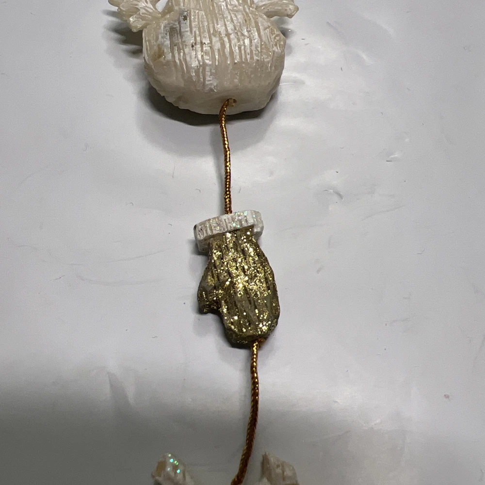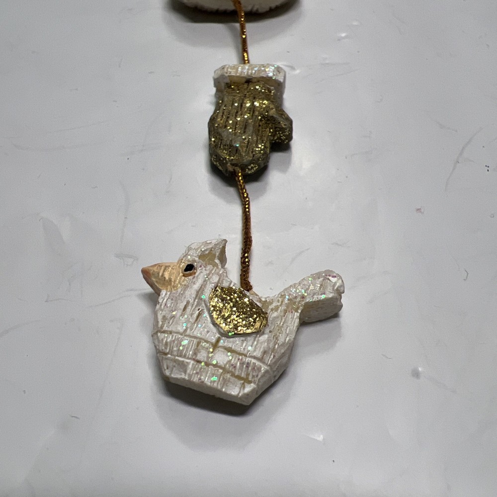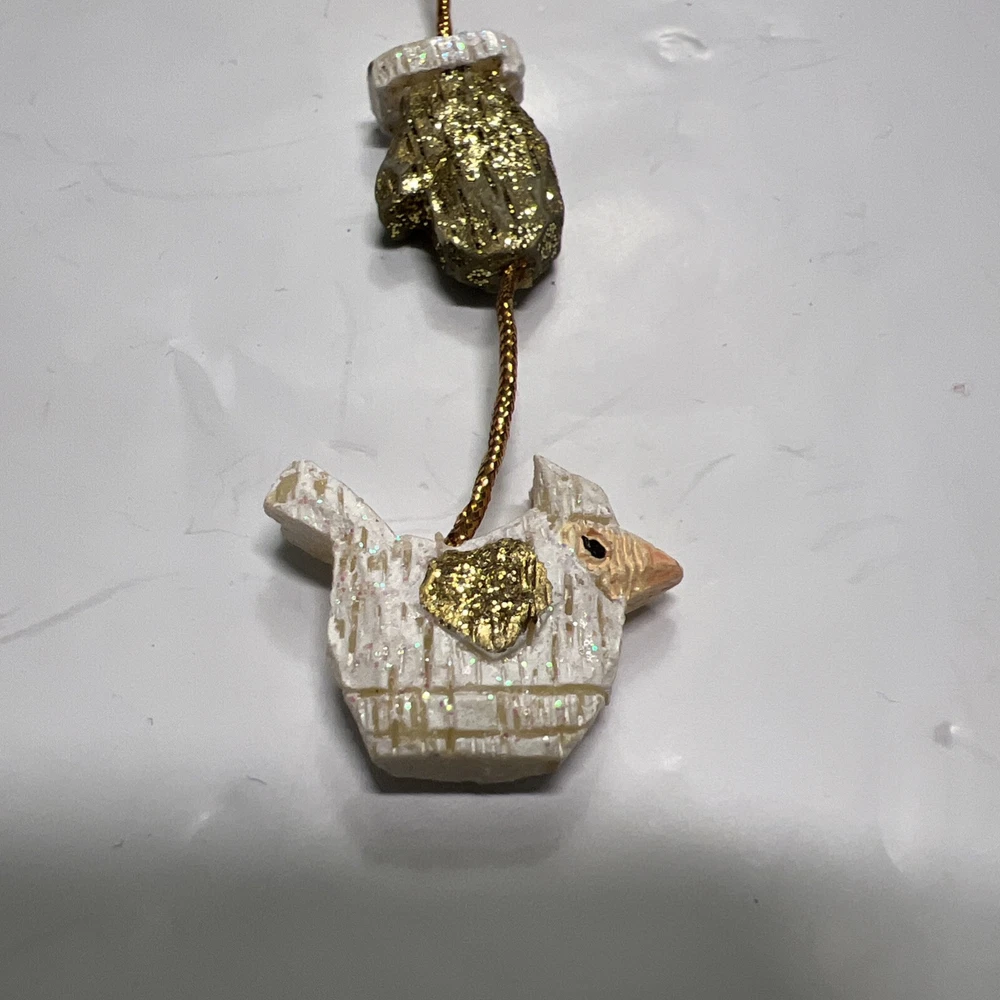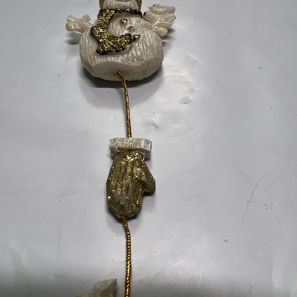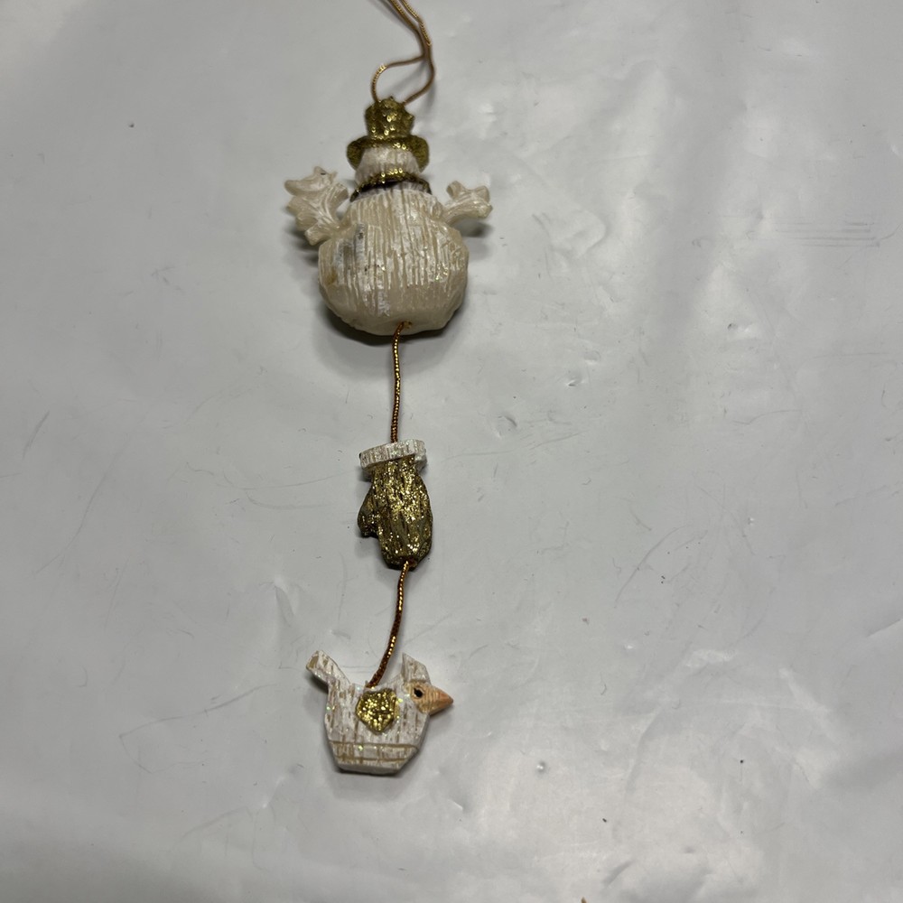 This ornament is a charming Snowman Holding Bird design in white and gold, embellished with glitter for a festive touch. The snowman is depicted holding a bird, adding a whimsical element to the Christmas-themed decoration. It features a hanging design, making it easy to display on a Christmas tree or around the home during the holiday season. Perfect for adding a touch of holiday cheer and sparkle to any space.