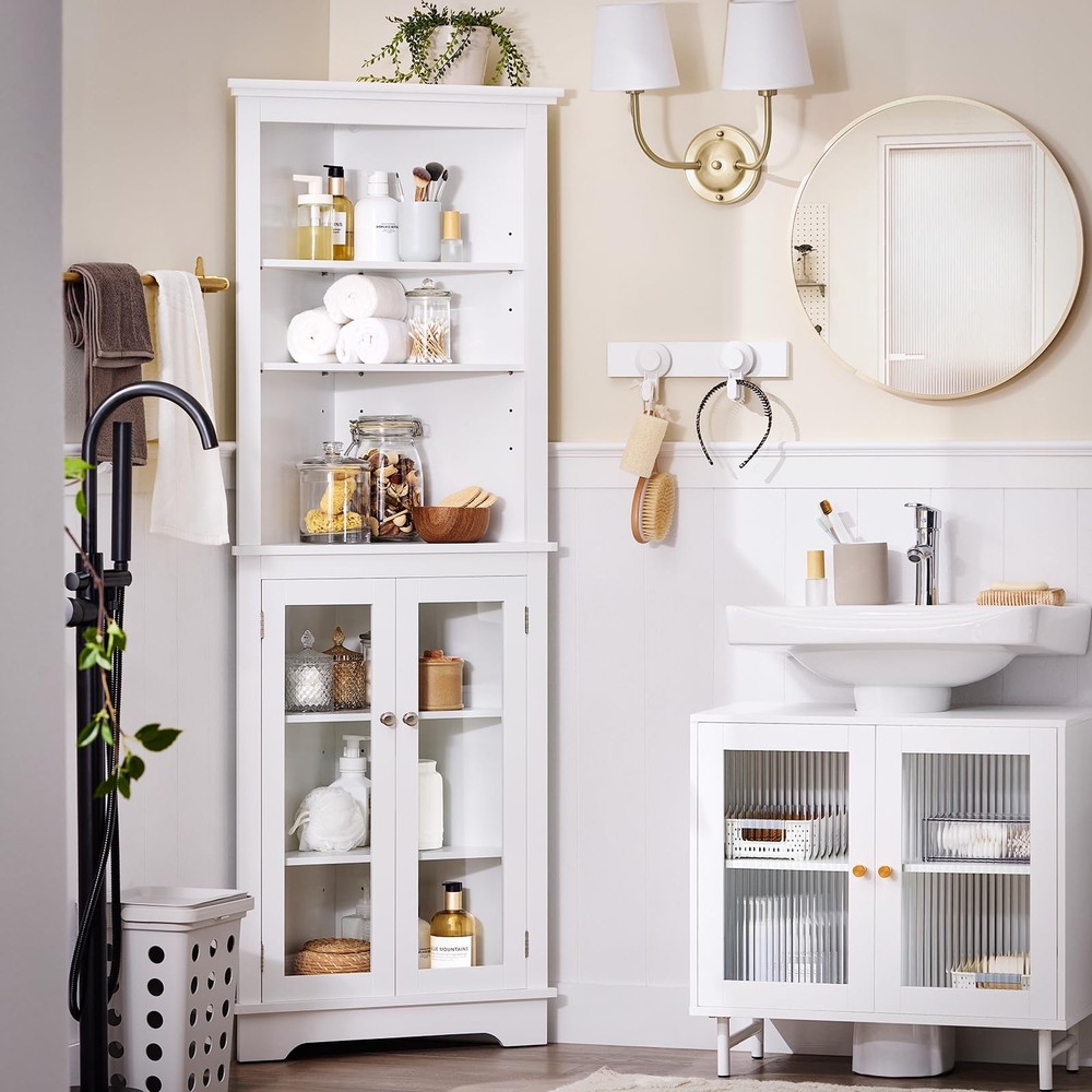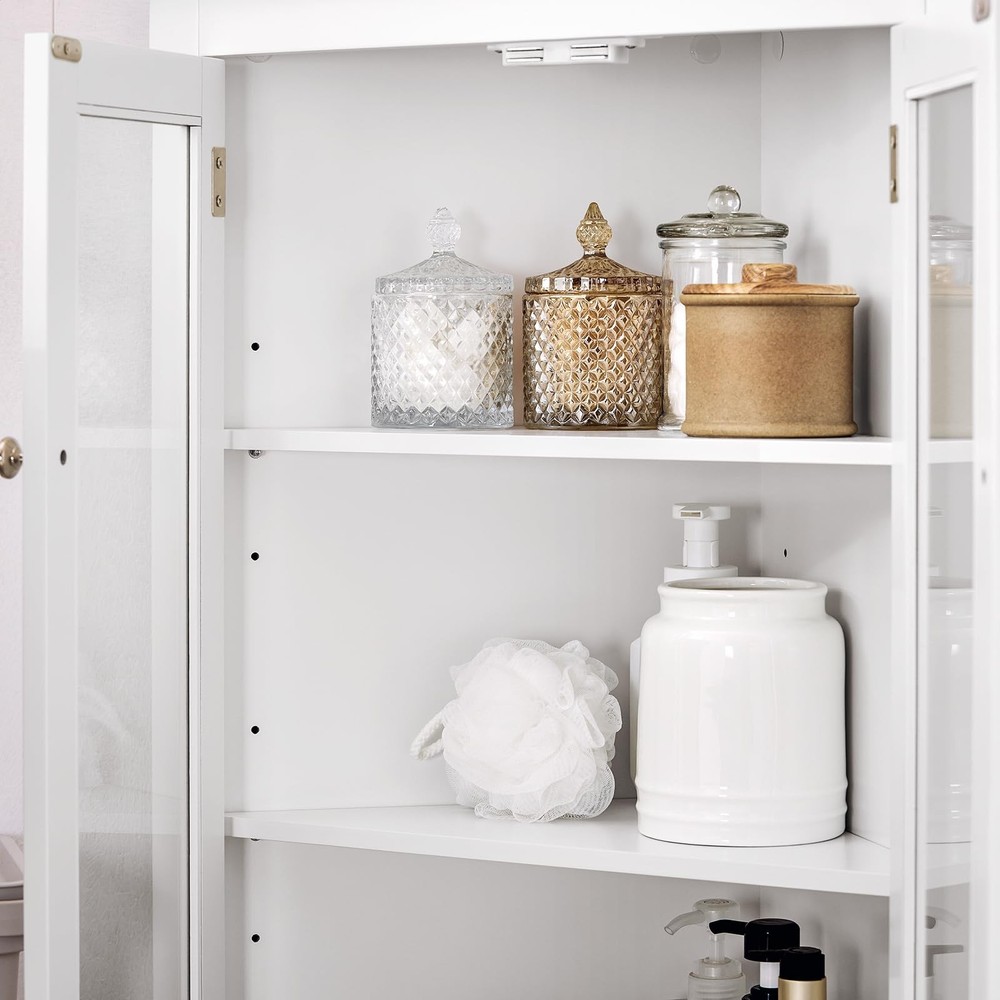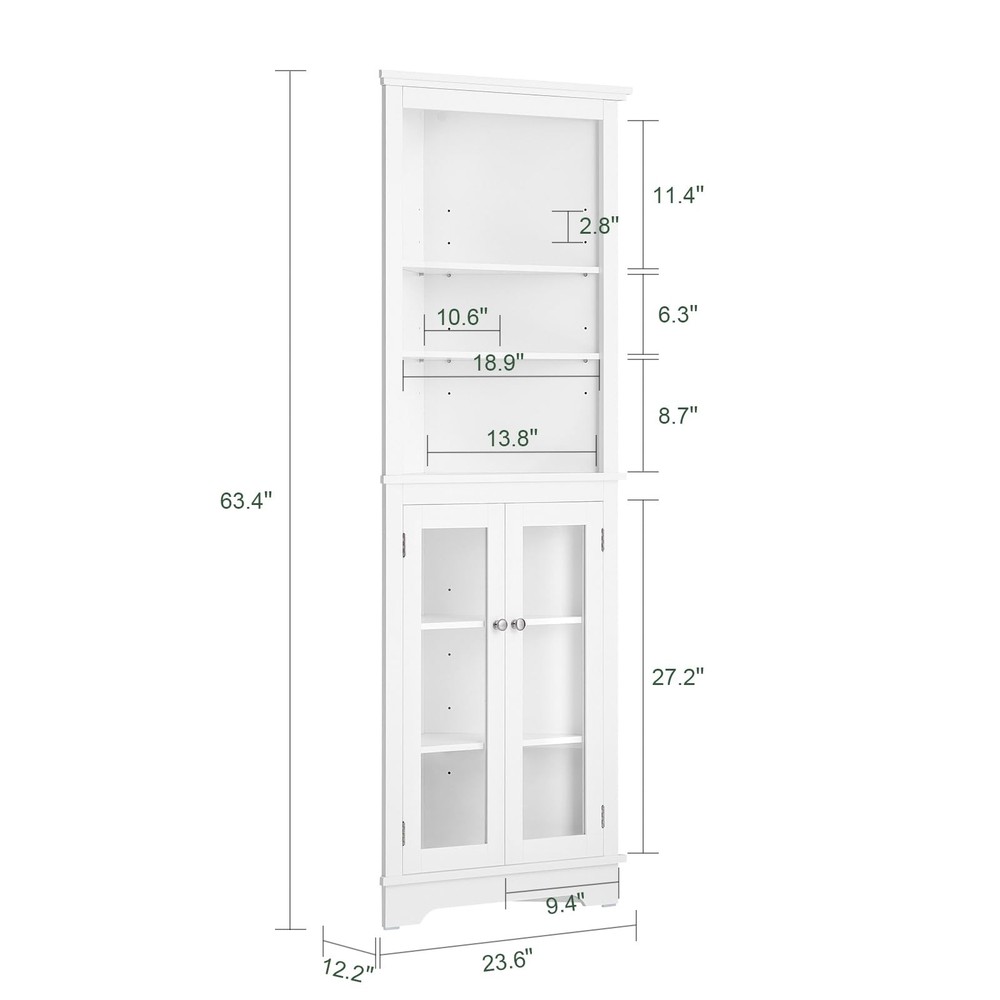 Tall Corner Cabinet, Bathroom Storage Cabinet, Kitchen Storing Unit with Adjustable Shelves Glass Doors Organizer for Space Saving, White BZR145-W [Adjustable Shelves for Space-saving]: The free standing storage cabinets with doors and shelves, open shelves that provide enough space. The baffles between the compartments can be removed or adjusted in height, facilitating you to use more flexibly. [Made for Small Spaces]: This tall thin storage cabinet is designed with convenience and functionality in mind. It is perfect for narrow spaces or to be placed behind a door. Despite the small floor area, it offers ample storage space, allowing you to keep your items organized and easily accessible. [Versatile Storage Cabinet]: This multipurpose slim cabinet seamlessly integrates into narrow spaces in bathrooms, laundry rooms, kitchens, living areas, foyers, or hallways. It accommodates a diverse range of items, including tableware, cans, shower essentials, towels, laundry detergent, CDs, books, and decorations, providing convenient storage solutions for every corner of your home. [Safe]: This floor-standing storage cabinet is made of high-quality medium-density fiberboard, which is of excellent quality and has a white surface, which is smoother and more beautiful. [Explanation of Tall Silm Cabinet]: Dimension: W23.6x D16.9x H63.4 inch. Weight: 54.49 lbs. Experience hassle-free assembly with detailed instructions, numbered parts, and precision-drilled holes.