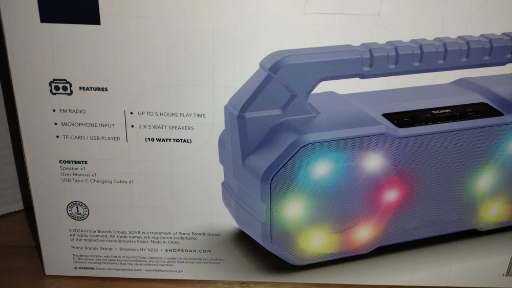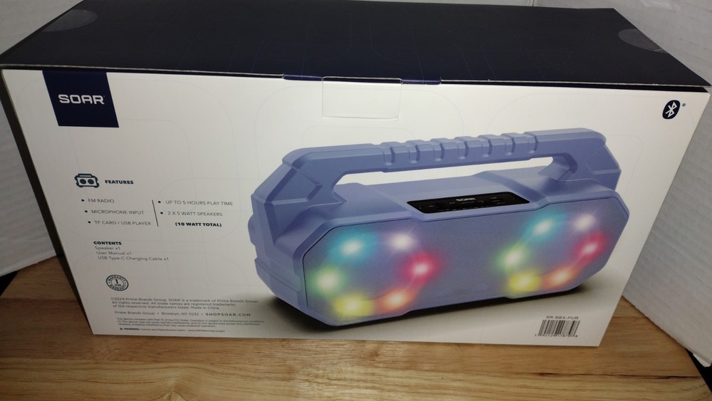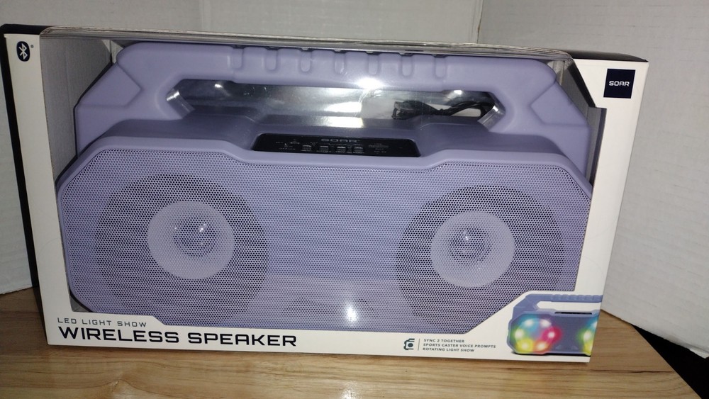 Soar LED Light Show Wireless Speaker Brand New Sealed. Purple/Lavender color. The outter plastic packaging has some slight cracking I pointed it out in the photos. Other than that brand new and sealed in the package.