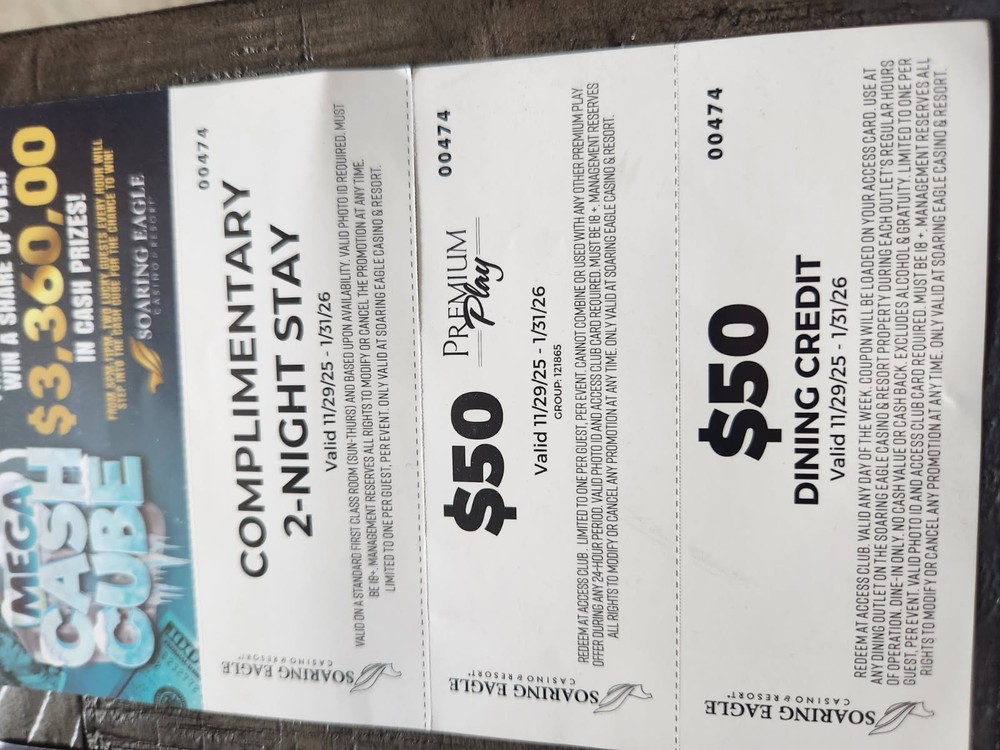 3 Soaring Eagle Casino and Resort Premium Play $50, Dining Credit $50, and Complimentary 2 Night Stay. Expires January 31, 2026. Value of $300 not even counting the complimentary 2 night stay. Shipping will be cost of a stamp to send or pickup whichever works best.