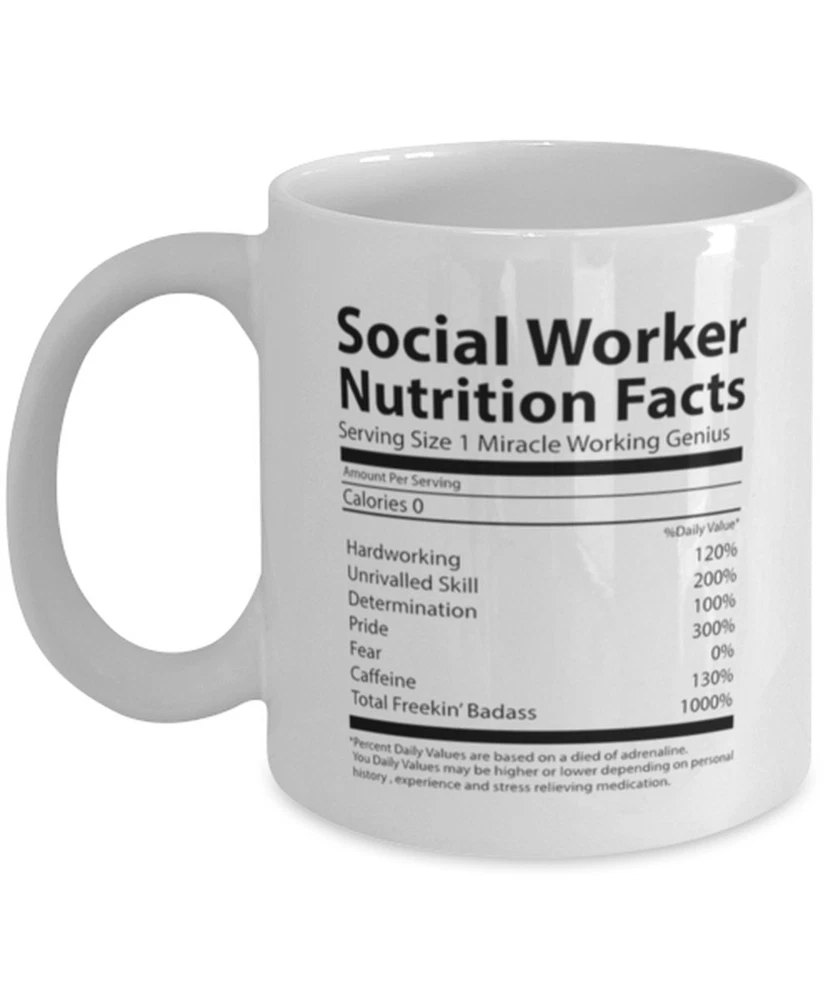 Social Worker Funny Coffee Mug Nutritition Facts - White Coffee Mug Product Details.. This high quality 11oz. ceramic white mug has a premium hard coat that provides crisp and vibrant color reproduction sure to last for years. Perfect for all hot & cold beverages. The highest quality printing possible is used. It will never fade no matter how many times you wash it. Material: 100% Ceramic. Print both sides. Dishwasher and Microwave Safe. High Gloss + Premium White Finish. Printed in the U.S.A. Personalized & Custom. We support personalized and custom mug to add custom, when placing an order, you can add notes to the "order note" in shipping address section. Also you can contact us directly via message. Shipping Info. Ready to ship in 1 to 2 business days, All products are made-to-order and proudly printed in the United States. Shipped by USPS and DHL, You will receive your order in 5-7 days. Replace & Refund. All products are defective during shipping broken, chipped will be replaced free of charge. You are not satisfied with the product, we will refund 100% money to you. If any other issues arise, please do not hesitate to message, we would be more than happy to assist you.