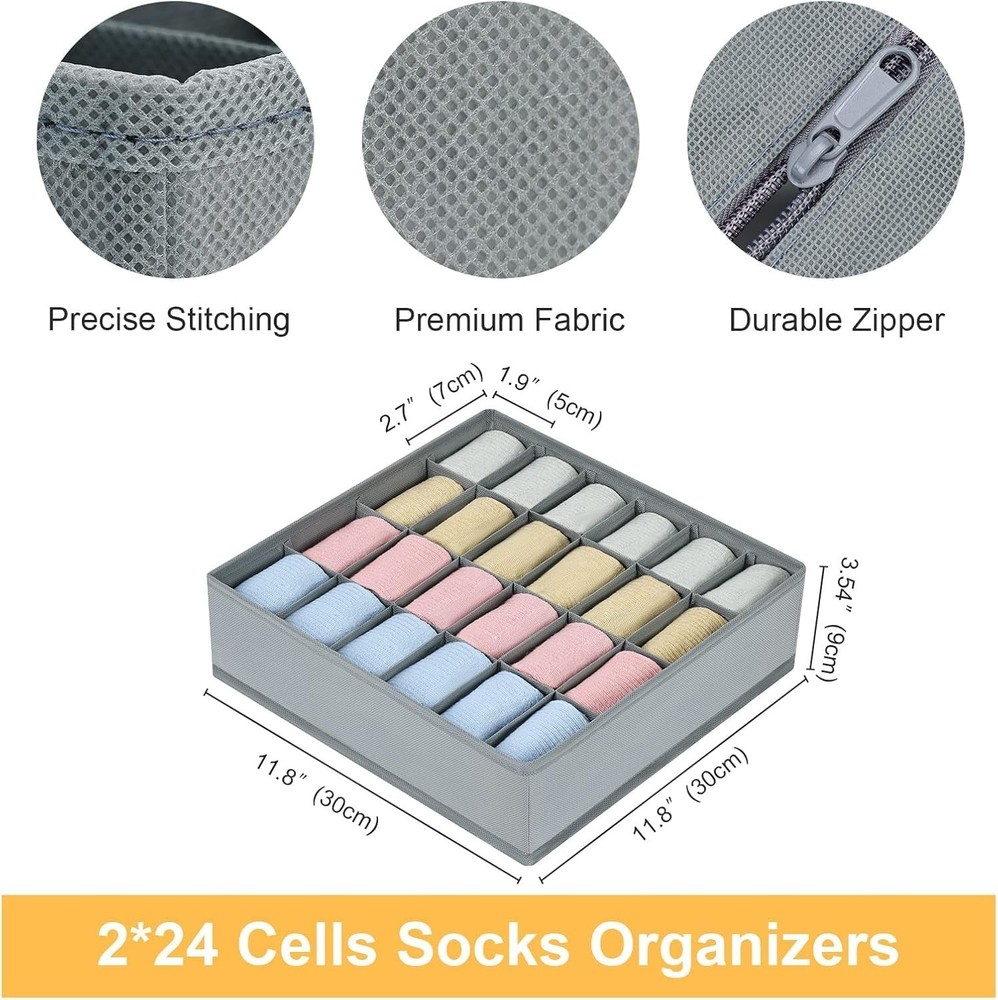 Sock Drawer Organizer Divider 2 Packs Underwear Organizer, 24 Cell Closet Organizers and Storage Organizer Sock Holders Organizers for Storing Socks, Handkerchiefs, Ties, Belts Grey Versatile Closet Organizers and Storage: Comes with 2 pack of closet dividers, you can use one as wardrobe organiser for storing socks, underwear and handkerchiefs, another one for dresser drawers to store jewellery, nail polish, lipstick, other bits and bobs etc, make your drawer is no longer chaos, become tidier and neater Collapsible Drawer Oganizers: The storage box itself is foldable with easy secure zip base, you can easily pop it open and run the zip along the bottom when in use. Also, you can just unzip and fold it become flat for easy storage when not in use Space and Time Saver: The sock organizer is perfect to save space for your closet, drawer, wardrobe and cabinet, it massively improve the utilisation of your drawer space, also you can be easier to find which one you want, saves much time on picking your items 24 Cells Underwear Organizer: x x , great size to make your socks fit well. Each pack has 24 cells, enough to organize your gadgets and your families'items by color and style, manage your life into a neat organised arrangement SATISFACTION GUARANTEE : Our foldable sock drawer organizers are made under strict quality control for the superior quality and your satisfaction. Also we offer s no-reason . 24H reliable customer service for you Provide Useful and Superior-Quality Products
