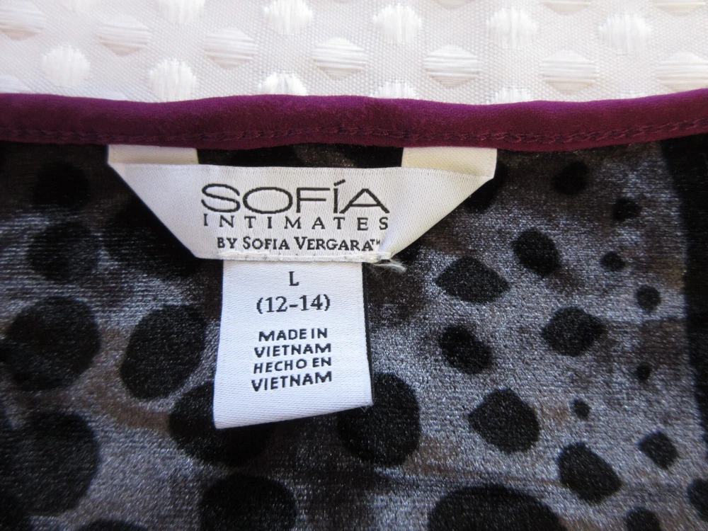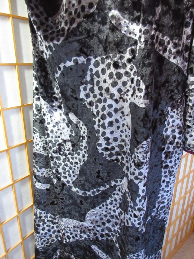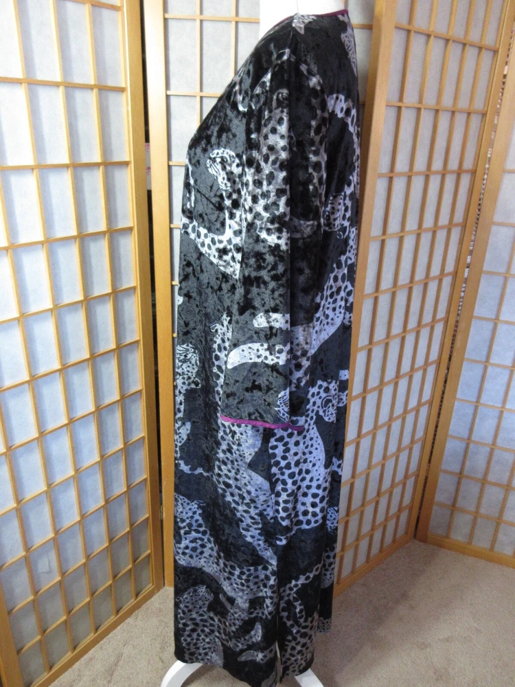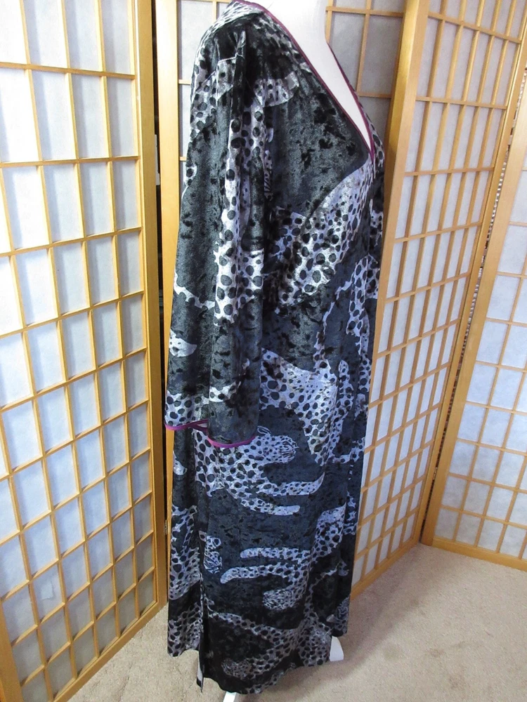 Sexy, elegant loungewear from Sofia Vergera, in pristine condition. Super soft crushed velvet jaguar print with purple trim. Polyester 95%/Spande 5%. 12" side slits. Other measurements: Length: approx 49" Armpit to armpit: approx 20" Sleeve length: approx 19" Please be aware there are no returns so measure carefully! All measurements are approximate and taken with utmost attention to accuracy Smoke-free home Seller has pets Items are not laundered prior to listing Please measure yourself to make sure this will fit you as there are no returns! Please measure your other clothing against this item of clothing to help you decide if this item will fit you! Please study photographs carefully as they are part of the description and items are sold “as is” Please do not hesitate to contact me with any questions you may have or if you need additional photos Actual color of item may vary due to camera flash, computer monitor, color variations I do not accept layaway so please do not ask me to "hold" something for you beyond eBay's policy. Thank you for your understanding.