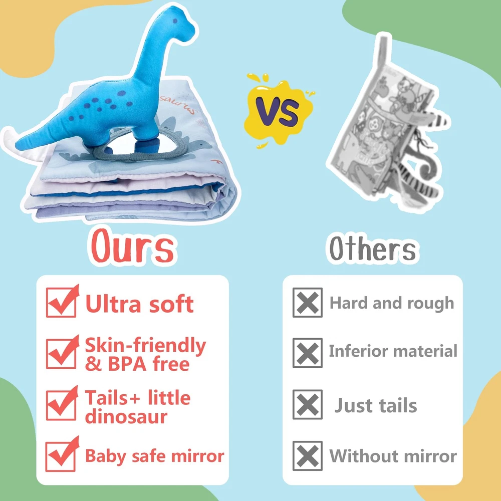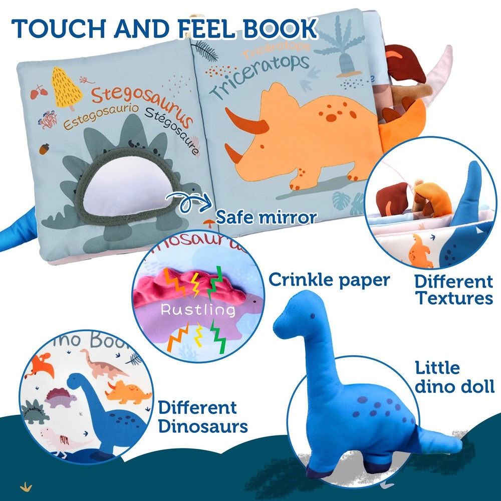 Baby Books 0-6 Months,Infant Tummy Time Toys Sensory Baby Toys 6 to 12 Months Touch Feel Book Gift Christmas Stocking Stuffers for Boys Girls 0-3 Months Book Early Learning Stroller Toy Baby Books 0-6 Months - 2PCS Baby Toys 0-6 Months Baby Toys 6-12 Months - Touch & Feel Tummy Time Books, Baby Boy Gifts, 3 6 9 Month Old Toys Baby Books Toys, Touch and Feel Crinkle Cloth Book for Infant Baby 0-3-6-12-18 Months, Early Development Interactive Stroller Soft Toys, Shower Gifts Christmas Stocking Stuffers for Boys Girls Baby Books Toys, Touch and Feel Cloth Soft Crinkle Books for Babies,Toddlers Infant Kids Teething Toys Activity Early Education Toys Baby Boy Gifts: baby book has a lot of textures to explore and imaginative content for babies, keeping them absorbed with sounds, textures, and bright colors. It is soft, comfortable, and has no sharp edges. Perfect for newborns to toddlers, it will bring endless hours of fun to your child or grandchild Baby Toys 6-12 Months: Each page offers something new--various dinosaurs and 3D tails, a dino doll, squeaky bubble, crinkle pages, a mirror, colorful and eye-catching images, and easy-to-turn pages to help develop motor skills. Each tail is made of different fabrics and textures, making it great for grabbing and learning! It is perfect as a newborn toy, infant toy, tummy time toy, baby boy stuff, baby boy toy, baby girl toy, baby shower gift, baby Christmas gift, baby stocking stuffer Baby Books 0-6-12 Months: 0-3 Months: Bright colors and contrasting patterns are what newborns like to look at. 3-6 Months: Babies can reach out and grasp book, and with each touch, they are learning about life and their surroundings. 6-12 Months: Different textured tails and crinkle pages are great for developing babies' sensory skills. 12-18 Months: Describe what dinosaurs are in the book to your baby to foster a love of reading Non-toxic & Sturdy: The BPA-free polyester fabric is extra sturdy and has strong stitching. The fabric ring on the side makes it easy to attach to the cot sides, car seat, and stroller. Its perfect size makes it easy to take on the go for baby's entertainment. The fabric book is easy to clean and the color won't fade or tear when washed, so you can keep the baby sensory book always clean! The soft baby book will stay together long enough until your baby no longer needs it Perfect Gifts for Baby Boys Girls and Newborn Parents: soft baby books are interactive and fun to play with; every baby should have cloth books, as it will create a reading habit for them and apply both fine motor skills and visual learning
