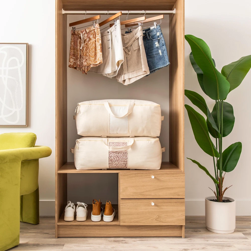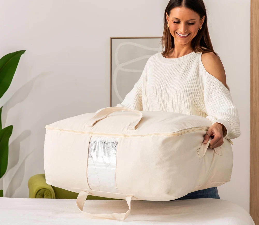 FOUR HANDLES FOR CARRYING AND LIFTING: A woven zipper storage bag comes with 4 handy handles! Use side handle to lift from wardrobe, top handles to carry if moving your large canvas bag around. Easy to use large storage bags for bedding, clothing, heavy linens or travel air mattress storage! COTTON CANVAS STORAGE WITH CLEAR WINDOW: You need to see which duvet storage or bed sheet storage is inside your case, right? So we added a scratch-resistant window to our beautiful beige canvas storage bag. This big full-sized viewing pane lets you see all your seasonal storage at a glance. CALI KING JUMBO STORAGE BAGS: Our extra large storage tote is more than a queen comforter bag. These giant storage bags are 25x19x9in to fit California King quilts and any XL size comforters! Perfect for storing down jackets in abundance, or throw pillow storage bags. Available in 1pc and 2pc sets. HEAVY DUTY, DURABLE WASHABLE STORAGE BAGS: Made with thick 12oz canvas cloth, each zip up storage bag holds 50lbs! This king comforter storage has overlocked stitches and handles are double line and criss-cross stitched, so nothing frays. Winter clothing storage is no match! 100% Machine Washable. VERSATILE IDEAS: Thanks to their style and durability a Canvas Soft Storage Bag can be for anything! Wedding dress storage, dorm clothing storage, winter coat, baby clothes, traveling, moving bags, garment storage, cushion storage bag and anything else you can cram in this storage season!