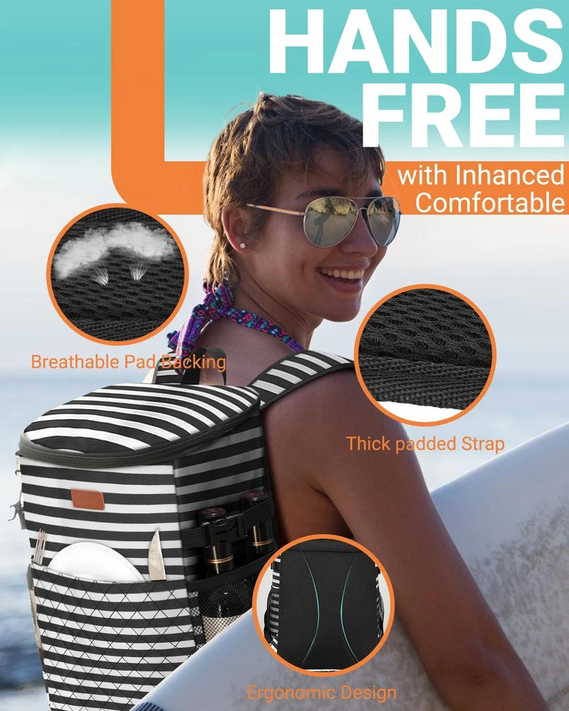 Soft Cooler Backpack 30 Cans/45 Cans, Coolers 30 Stripe Description Features: Multipurpose Storage: 30-Can capacity. Measuring L11.6" x W7.28" x H15.75" easily meets the need for 2-4 friends.This small cooler has 4 separate compartments: roomy zipper main compartment; 2 side mesh pockets for long bottle beers and wines, easy access front pocket, wide mouth opening, make it a spacious and organized adventure essential. EXCEPTIONAL INSULATION: Up to 20 hours insulation with this backpack cooler's 5 layer material--including thickened foam insulation and advanced food-grade PEVA seal. Designed to keep your beverages cool and food fresh throughout days of various outdoor activities like tournaments or concert, camping, fishing/boating/beach weekend, family trip, theme part trips. LEAK-PROOF AND RUGGED: this insulated backpack adopts high-tech seamless ultrasonic welding instead of traditional sewing, the interior PEVA lining with outter high quality oxford fabric material waterproof and easy to clean. 210D waterproof wear-resistant lining lowers the risk of tearing or coming apart.(The zipper is not leakproof, please be careful not to tip over when using it. ) HANDS FREE COOLER: This lightweight, backpack-style portable cooler has thicker padded and ventilated straps that leave both your arms free to grab your surfboard, fishing pole, or any other adventure gear. Perfect portable cooler for men and women. VERSATILE: Besides used as excellent cooler bag,it is also a perfect lightweight gear for backpack lunch box,camping backpack,picnic backpack, fishing backpack,beach cooler, great for hunting,trail,cycling and other outdoor activities. Suitable for both men and women. Product Details: Handling We will ship all orders within 1 business day of payment. Delivery We Do Not Ship Outside of the Continental US. Return Policy All items qualify for returns within 30 days of receipt. Buyer is responsible for return shipping on any item that is not damaged. Feedback We take our reputation seriously, we buy and sell online, so we understand the value of trust. If you are unsatisfied with your order, please contact us and we will work with you to resolve it to your satisfaction.