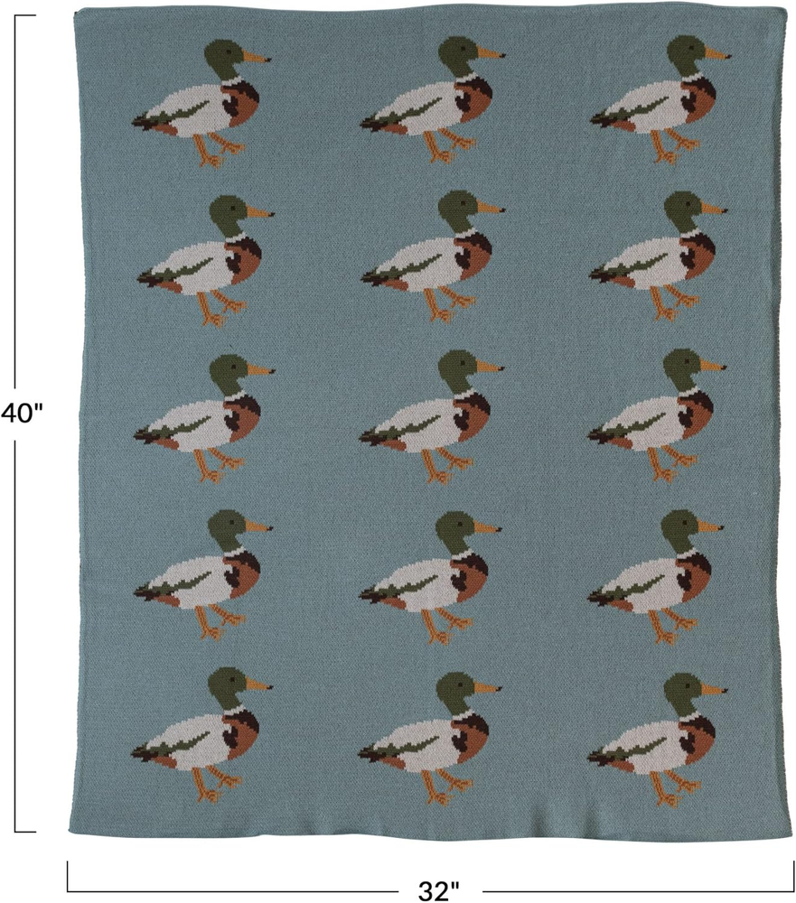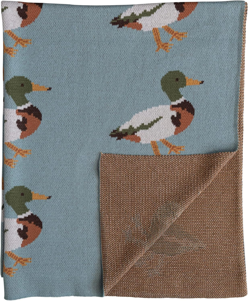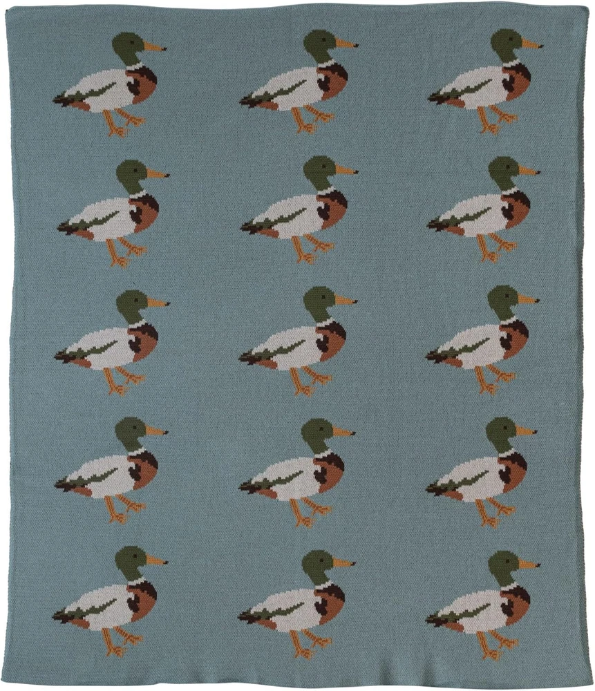 This whimsical baby blanket showcases a duck print on soft knitted cotton Display in a children's room of any style Machine Wash Warm, Gentle Cycle, Do Not Bleach, Tumble Dry Low, Warm Iron If Needed Made from cotton 40 inches L x 32 inches W x 0.25 inches H Featuring an ample selection of lush woven textures, intricate embroidered details, and timeless patterns, our collection of blankets, throws, and quilts will bring comfort and elegance to a space of any style. Instantly transform a bedroom, living room, or reading nook into a cozy paradise by exploring a vast array of throw blankets in every size and masterfully embroidered quilts fit for any space. Choose from a wide variety of luxurious fabrics from cotton to velvet and styles from mid-century modern to boho. Add a dash of relaxation and sophistication to a bedtime ritual, extended guest stays, or family gatherings to curate a warm and welcoming ambiance that is guaranteed to impress.
