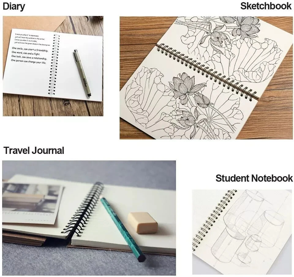 Perfect size: 18cm x 12cm/ 7 "x 4.75", perfect size for handbag, schoolbag or backpack, easy to take away for traveling Blank inside pages: With 100 completely blank and unlined pages in each of the books, you can draw what you need without the limit of the line, documented in a sketch pad meant for taking with you anywhere High quality material: Strong acid free brown hard cover and blank cream white paper, thick paper prevents ink from bleeding through the pages, and the durable binding of each spiral notebook keeps these pages together Wide usage: Ideal for a diary, travel journal, poetry work, creative writing, making sketches and drawings, Work records, study notes, mood diary, scrapbooks and so on