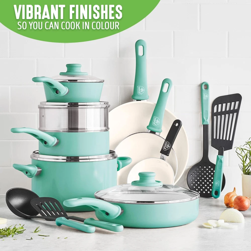Store New Arrivals Add to Favorite View Feedback Contact Soft Grip Healthy Ceramic Nonstick, 1QT and 2QT Saucepan Pot Set With Description Item model number CC002559-001 Style Saucepans Country of Origin China Is Oven Safe Yes With Lid Yes Number of Pieces 4 Item Volume 1.89 Liters Material PFAS Free Ceramic Nonstick, Bakelite Handles Compatibility Options stove Closure Material Glass Is Dishwasher Safe Yes Item Weight 4.69 pounds Material Type Free Cadmium Free, Perfluorooctane Sulfonate (PFOS) Free, Perfluorooctanoic Acid (PFOA) Free, Bisphenol-A (BPA) Free, PFAS Free, Lead Free Special Feature Gas Stovetop Compatible, Electric Stovetop Compatible Utensil Compatibility Metal, Wood, Silicone, Plastic Color Turquoise Global Trade Identification Number 00885837019506 Handle Material Bakelite Included Components Saucepans with Lids, 1-Quart and 2-Quart Product Dimensions 16.73 x 10.24 x 6.1 inches Size 1 Quarts HEALTHY CERAMIC NONSTICK: Our healthy and easy-to-clean ceramic nonstick coating is derived from sand and delivers effortless release with quick cleanup TOXIN-FREE: Our coating is free of PFAS, PFOA, lead, and cadmium so you can make every meal healthier EXPERT-DESIGNED COOKWARE: Crafted by culinary experts to meet the demands of both home cooks and professional chefs, ensuring superior performance in every kitchen WOBBLE-FREE BASES: Each frypan is reinforced with a wobble-free base for extra strength and even heating EASY TO CLEAN: Dishwasher safe, but most messes wipe away SNAG-FREE INTERIORS: The rivetless interiors prevent food buildup and make cleaning simple EASY VIEW GLASS LIDS: Durable glass lids offer an easy way to check on any meal in progress EFFORTLESS PERFORMANCE: Delivers on all stovetops, except induction and oven safe up to 350˚F MADE WITH RECYCLED MATERIALS: Cookware vessels (excluding handles) are made from a minimum of 65% recycled materials. The Soft Grip collection is all about comfort and control. Designed for effortless performance and cleanup, this set features our toxin-free Thermolon nonstick coating, which is free of PFAS, PFOA, lead, and cadmium. GreenLife’s healthy ceramic nonstick is not stuck in the past—that’s why our ceramic nonstick starts with sand and creates 60% less CO2 emissions during the curing phase than traditional coatings. The pans are also crafted with recycled aluminum, because we want your kids’s kids to cook healthy, too. Finished in vibrant colors, this set is outfitted with stay-cool handles to keep your cooking comfortable. Durable glass lids for a good look at any meal in progress without sacrificing heat. For all stovetops, except induction. Oven safe to 350°F. Dishwasher safe. This cookware set includes: 4-inch mini frypan, 7-inch and 9.5-inch open frypans, 1-quart and 2-quart covered sauce pans, 5-quart covered stockpot, 2.5-quart covered sauté pan, stainless steel steamer, and 4 kitchen utensils. ABOUT US We offer the best prices around on high quality products. Our E-store includes media such as books, movies, music and games while offering electronics, toys, sporting apparel, clothing, tools, general home, garden items and more. SHIPPING We are always working hard to ensure your package arrives as soon as possible. Please understand that some factors like weather, high postal traffic, and the performance of shipping companies are outside of our control. RETURNS We offer a 30-Day Return Policy on items which you are not completely satisfied with. You have the option for a full-refund or an exchange of the item. PAYMENT We accept PayPal. CONTACT US This page content is yet to come Please ad us to your favorite seller and visit again later Thank You CUSTOMER SATISFACTION We try our very best to make sure every customer is completely satisfied. If there's a problem, message us! We're happy to help.