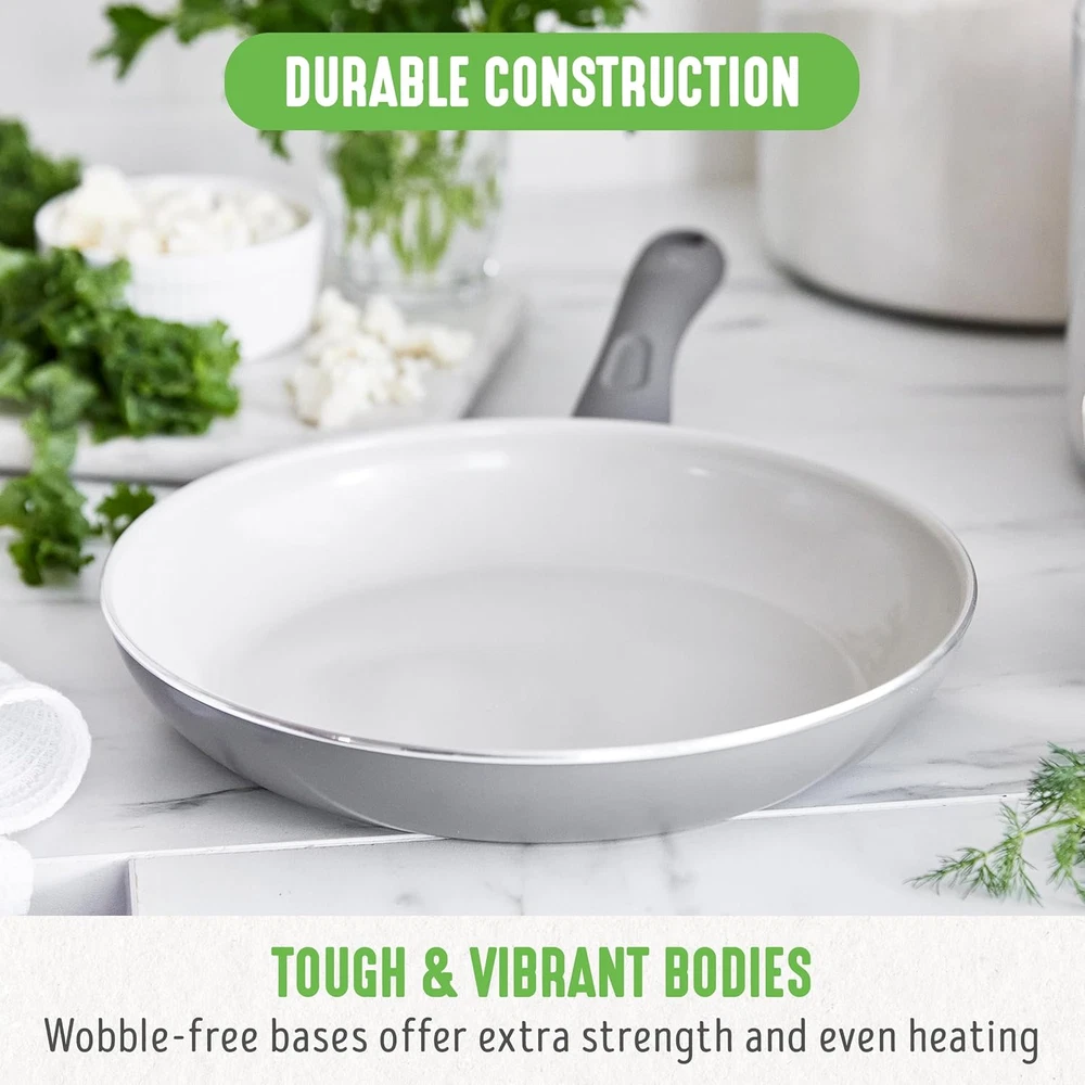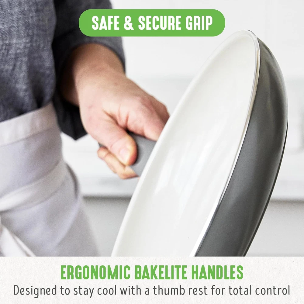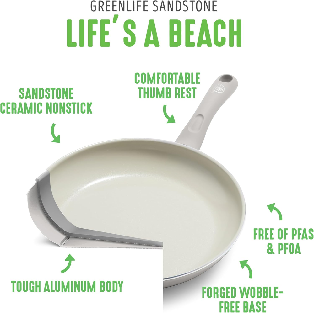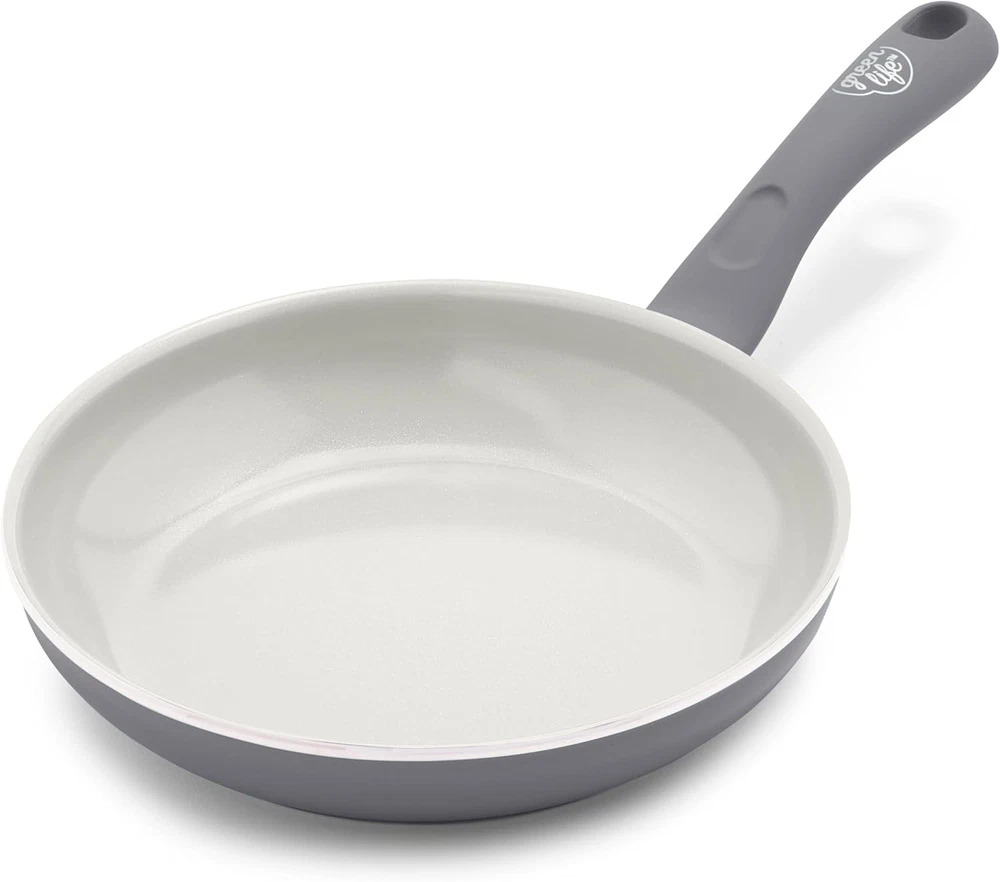 HEALTHY CERAMIC NONSTICK: Our healthy and easy-to-clean ceramic nonstick coating is derived from sand and delivers effortless release with quick cleanup TOXIN-FREE: Our coating is free of PFAS, PFOA, lead, and cadmium so you can make every meal healthier STAY-COOL HANDLES: Soft Grip Bakelite handles are designed to stay cool on the stovetop for maximum comfort WOBBLE-FREE BASES: Each frypan is reinforced with a wobble-free base for extra strength and even heating EASY TO CLEAN: Dishwasher safe, but most messes wipe away EFFORTLESS PERFORMANCE: Delivers on all stovetops, except induction and oven safe up to 350˚F MADE WITH RECYCLED MATERIALS: Cookware vessels (excluding handles) are made from a minimum of 65% recycled materials. Designed for effortless performance and cleanup, this frying pan features our diamond-infused Sandstone nonstick coating, which is free of PFAS, PFOA, lead, and cadmium. GreenLife’s healthy ceramic nonstick is not stuck in the past—our ceramic nonstick starts with sand and creates 60% less CO2 emissions during the curing phase than traditional coatings. This pan is also crafted with recycled materials because we want everyone to cook healthy for years to come. Finished in vibrant colors, this pan is outfitted with a stay-cool handle to keep your cooking comfortable.