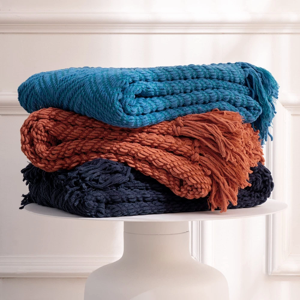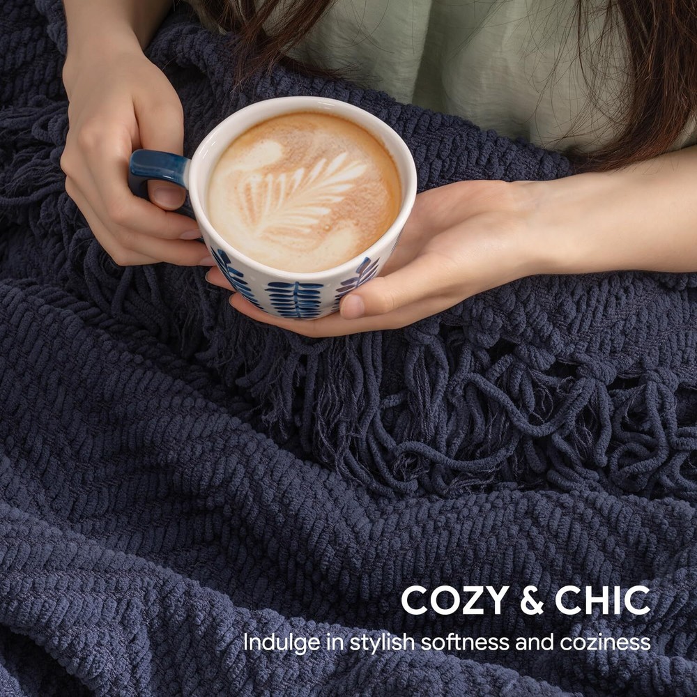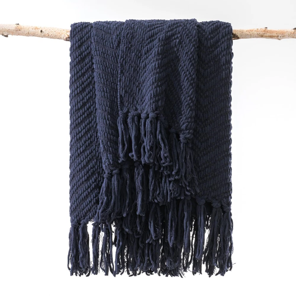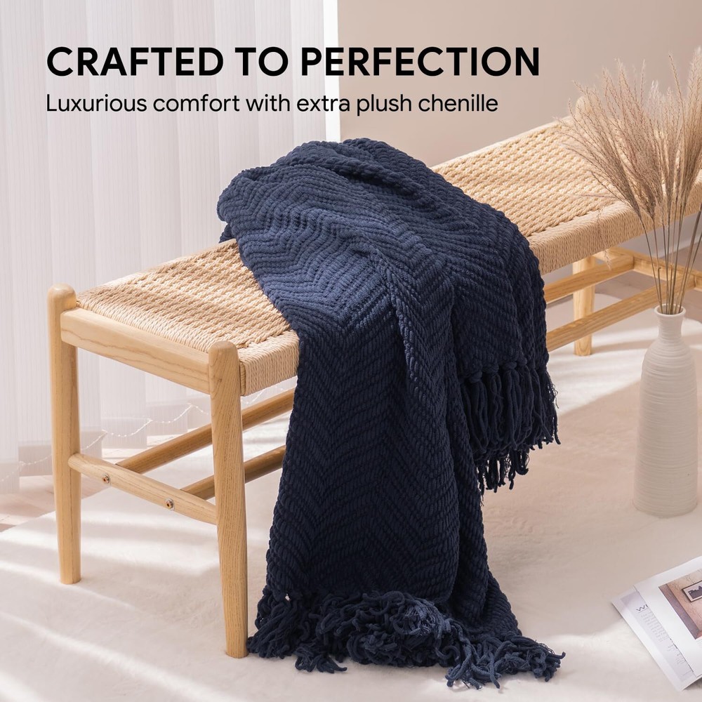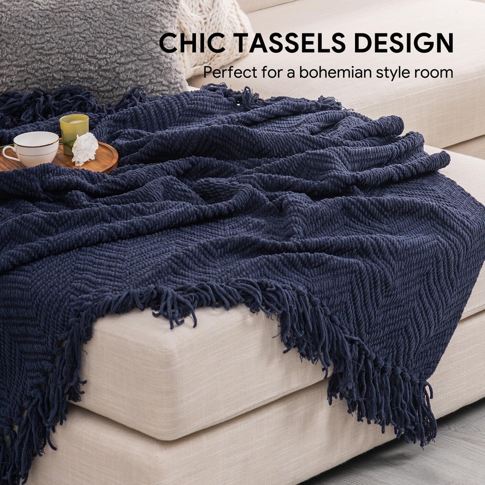 Unique Boho Design - Introducing our exquisite boho chenille knit throw blanket, featuring a mesmerizing boho design that is truly one-of-a-kind. The intricate herringbone patterns and well-thought colors come together in perfect harmony, creating a stunning visual masterpiece that will effortlessly enhance the aesthetics of any space. Soft & Comfortable - Our cozy knitted throw blanket is made of high-quality chenille fabric, which makes it super soft yet lightweight. With premium knitting and stitching craft, this textured throw blanket is also warm but breathable. You can use it throughout the year to enjoy warmth and softness without getting sweaty. Versatile & All-Season Use - This knitted 50x60 throw blanket can provide the perfect companion for cozy evenings on the sofa or bed, snuggling up while watching your favorite shows or enjoying a good book. Its lightweight design makes it an ideal travel companion, whether you're embarking on outdoor adventures or simply heading on a road trip. Built to Last - Made from high-quality, fade-resistant fabrics and impeccable craftsmanship, our navy blue throw blanket boasts superior durability, ensuring vibrant hues that stay vivid even after countless washes. Additionally. This soft chenille throw blanket is certified to Oeko-tex standard 100, so it's safe for you and your family to use in daily life. Easycare & Giftable - Our throw blanket for couch is super easy to clean, simply machine wash on a gentle cycle in cold water, then tumble dry low. Our decorative throw blankets also come elegantly packaged, ready to impress and delight your loved ones. It's the perfect gift for housewarmings, birthdays & holidays.