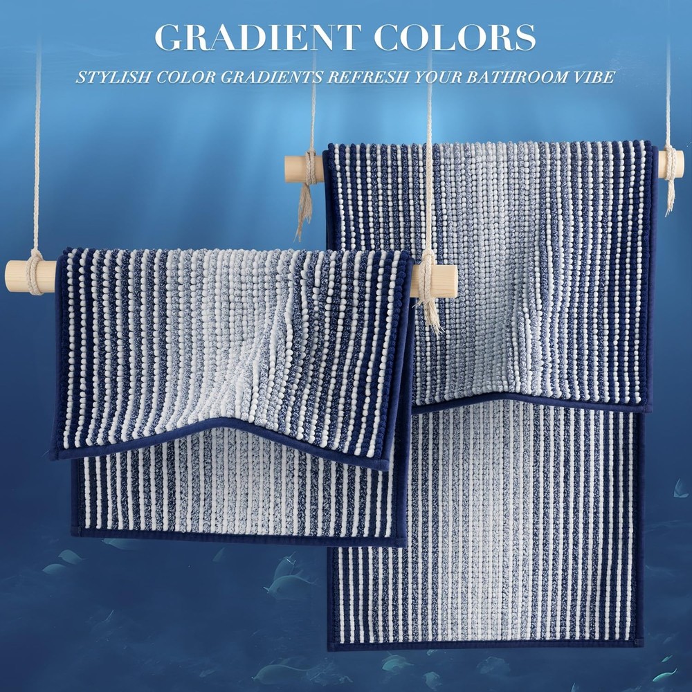 Chenille Bathroom Rugs and Runner Mats Set of 2 for Bathroom Floor You always need a soft, warm, dry place to relax your feet after you step out of a refreshing shower, 's bathroom rugs are ultra-soft and absorbent to give your feet the gift of exceptional comfort. Our bath mat set made of 100% plush chenille, the fibers dense and not easily turn deflated after use, non-slip material provides long-lasting and durability performance, super-absorbency pile keeps your floor dry. What's more, the unique gradient pattern design leads a beautiful, rich and charming element to your bathroom and home. Extra Soft Chenille : Luxury chenille microfibers, bring you comfortable feeling to the touch like walking on the cloud. Warm and soft thick pile offers a good way to soothe tired feet. Super Absorbent : The soft chenille bathroom mat is pretty comfortable to touch, super-absorbent performance can quickly soaks up an impressive amount of water and dry quickly. Non Slip Backing : High quality hot melt adhesive backing to keep the bath mat firmly in place and prevent shifting and skidding. Machine Washable : the bath rugs is made with premium fiber locking technology so that every fiber is firmly attached onto the backing to prevent shedding during frequent machine washing. Colours & Sizes Variants : Unique gradient pattern design, a bunch of colors for individual needs, these bath rug set is easily coordinate with bathrooms or any different styles. Perfect Chenille Bathroom Rug Set : With different colors and sizes to choose from, can be used at bathroom, shower, vanity, tub, bedroom, front of sink or other place in your home. 【PREMIUM CHEILLE BATH MAT SET】: You will get 20"x 47" & 16"x24" bathroom rug sets, which are made of high quality fluffy plush chenille microfibers. The soft fibers are very dense and not easily turn deflated after use, soothing your tired feet and shielding your toes from the cold floor. The density and plushness of our pile surpass that of most other brands. 【EXTRA ABSORBENT BATHROOM RUG】: The luxury performance chenille microfibers can quickly absorb moisture from your feet when you step out of the bath or shower, and save your floors from dripping water, and dries quickly, making your feet feel the ultimate luxury enjoyment 【NON-SLIP/BREATHABLE】: High quality hot melt adhesive backing to keep the carpet firmly in place and prevent shifting and skidding. Provide better security for families with children or the elder. Attention: The bath rug underlay should be clean, flat, and dry before placing the mat on the floor. Water or dust under mat may cause slippage. 【MULTI-PURPOSE USE】: The gradient color design for this shaggy bathroom rug set is beautiful, make it easy to go with any bathroom home decor, bring charming and fantastic feeling for your family, multiple sizes are essential for any style spaces, it can be applied in bathroom, kitchen, bedroom, living room, door entrances, stairs, balcony, laundry room, pet house, pet rug, and more. 【MACHINE WASHABLE BATH RUGS】: Durable material, machine washable, With premium fiber locking technology, every fiber is firmly attached onto the backing so that the bathroom mat will not shed during using or washing, color will stay nice and vibrant for years to come no matter how many times be washed and dried. Machine wash with cold water and mild detergent (no chlorine or bleach) tumble dry at low speed or hang dry.