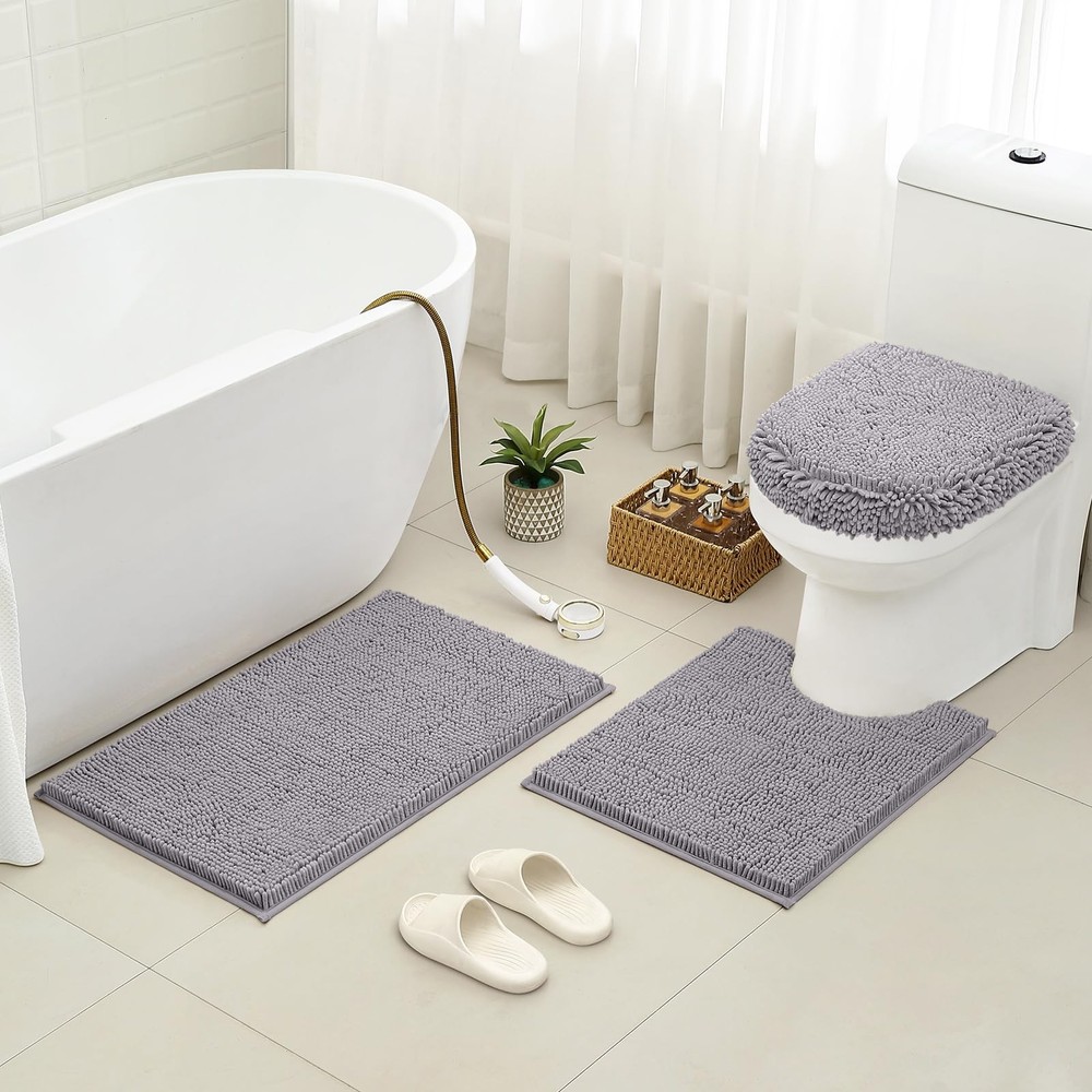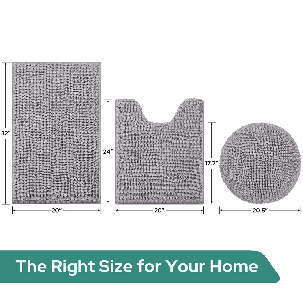 3 Pieces Bath MatsSoft Microfiber Surface High Water Absorbency Bath mat soft microfiber super absorbent water after shower.No more wet mat on the bathroom floor, Also It has unique fiber-locking technique and neatly wrapped sides, not easy to get hair loss or off line. Much better than other brands in the market.Anti-slip PVC Bottom Non-slip bottom is made of high quality PVC material. This anti-skid backing has practically slip resistance on the floor surface, that it won’t slip or slide to keep you more safe and cozy. It doesn't matter how many times you wash it, it stays the Origina.Machine Washable Wash on cold with mild detergent.Use only non-chlorine bleach when needed, hang to dry or air dry flat.Do not Bleach or Dry Clean. Please do not use the dryer or put it in hot water. Luxury 3 Pieces Bathroom Rugs: 1 Bath Rug 20"x32", 1 U-Shape Bath Contoured Rug 20"x24", 1 Round Toilet Lid Cover applies to size 15.5"-19.5", wide using for most lids at home. bathroom lid covers with durable elastic band all around, bringing the cover kind of adjustability. This soft and durable bath rug is especially for you to decorate and warm your bathroom Ultra Soft: These upgraded luxurious shag rugs can soak up the water and keep your floor dry like a gaint sponge, made of plenty of shaggy microfibers, each fiber about 1 inch and more compact and thick to arrange together, the rug set soft enough like sinking into a deep shag pile while you step on it Non-slip Bath Rug: Non-slip bottom is made of high-quality material. This anti-skid backing has practically slip resistance on the tile floor surface, that it won’t slip or slide to keep you more safe and cozy. Unlike other rugs where the rubber backing tends to wear and peel off after several washes. The rugs are much stronger and durable for long-lasting use High Watter Absorbency: High-pile, thick Chenille fabric helps save your floors from dripping water while you're stepping out of the bath, shower, or getting ready by the sink. Moisture is trapped in the bathroom mat's deep pile, allowing the bath mat to dry quickly and cleanly. Place rug on Clean Dry Smooth Floor only. Water under the rug can cause it to slip. Keep bottom of rug dry Machine Washable: Wash on cold with mild detergent. Use only non-chlorine bleach when needed, hang to dry, or air dry flat. Do not Bleach or Dry Clean