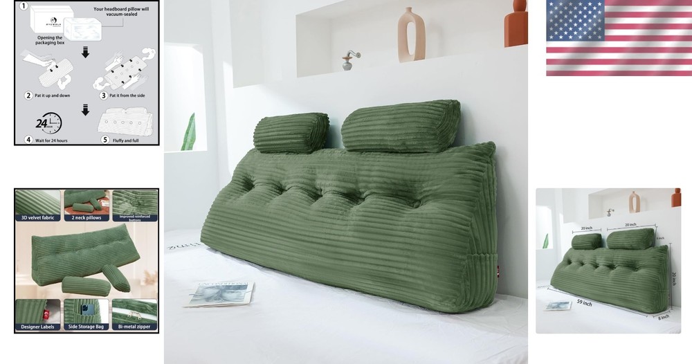 Versatile Headboard Wedge Pillow with Neck Roll Pillows - Soft & Stylish, Queen ‹ › ‹ › ‹ › ‹ › ‹ › ‹ › ‹ › ‹ › Versatile Headboard Wedge Pillow with Neck Roll Pillows - Soft & Stylish, Queen Features: Made from high safety environmental soft Velvet fabric and two types of PP cotton for unbeatable comfort. Large headboard wedge pillow provides excellent support for your back, lumbar, and neck. Includes two detachable small round neck roll pillows for extra support where you need it. Designed with two side pockets for easy storage of your phone or glasses—perfect for those quiet nights. Ideal for watching TV, reading, or simply lounging in bed. Benefits: Incredibly comfortable and supportive, promoting good posture whether sitting up or lying down. Transforms your bed into a cozy retreat, filling the awkward space between mattress and headboard. Versatile design suitable for dorm rooms, day beds, sofas, couches, floors, and playrooms. Fashionable and easy to maintain with a removable, machine-washable cover. Elegant design complements various decor styles in your home, bringing both comfort and style to any space. Why choose our Versatile Headboard Wedge Pillow? If you seek comfort and style all in one, our Versatile Headboard Wedge Pillow with Neck Roll Pillows is the ultimate choice. This pillow provides dependable back and neck support, ensuring you can enjoy relaxed evenings and lazy weekends without discomfort. Perfect for any space in your home, it includes two handy side pockets to keep essentials close at hand. Upgrade your relaxation experience today and transform your bedroom into your personal sanctuary! Don’t settle for less—embrace comfort and elegance with our Queen-size Wedge Pillow, tailor-made for your leisure time. Shipping Free & Fast Shipping - We offer free shipping to most of the USA with a normal delivery time of 3-7 days. However, due to the current situation, additional delivery time (up to 3 weeks) may be required for some items. Alternative Carriers - We may use alternative carriers (e.g. USPS, FedEx, UPS, etc.) to ensure your package arrives safely and on time. Due to the use of multiple carriers, we are unable to provide a tracking number automatically. Handling Time - Orders are processed and shipped within 1-2 business days of receiving cleared payment. Shipping Restrictions - Shipping to Alaska, Hawaii, Puerto Rico, Guam, and other US territories may incur shipping charges or delivery restrictions. Please contact us before ordering, or your order can be refunded/cancelled. State Restrictions - There may be restrictions based on your state of purchase. For example, certain items may not be shipped to California due to state regulations. Contact for Tracking Updates - If you require tracking updates or have any concerns about the delivery of your order, please feel free to contact us, and we will be happy to assist you. Return 30-Day Hassle-Free Returns - We want you to be completely satisfied with your purchase. If you are not, you can return the item within 30 days of receiving it for a full refund or exchange. Easy Return Process - To start a return, simply contact us and we will provide you with a prepaid return shipping label and detailed instructions. Restocking Fee - There are no restocking fees for returns. However, the buyer is responsible for return shipping costs if the return is not due to a seller's error. Refund Processing Time - Refunds will be processed within 5 business days of receiving the returned item in its condition. Payment We accept all major credit cards, PayPal, and Apple Pay for your convenience. Your payment information is secure and encrypted to ensure a safe and seamless transaction. Please complete your payment within 3 days of purchase to avoid any delays in shipping. Feedback Your feedback is extremely important to us. We strive to provide the best products and customer service possible. If you are satisfied with your purchase, please take a moment to leave us a positive review. If you have any concerns or issues with your order, please contact us before leaving negative feedback. We are committed to resolving any problems and ensuring your satisfaction. Contact Us If you have any questions or concerns, please feel free to out to our customer support team. You can contact us through the eBay messaging system. We are available Monday to Friday, 9:00 am to 5:00 pm EST, and we will do our best to respond to your inquiry within 24 hours. Buy it now and enjoy a pleasant shopping experience! Unit Quantity: 2.0 Material: Polyester,Velvet,PP cotton Features: Removable Cover,Soft and Supportive,Multi-Purpose,Life Changing Pillow,Great for Back Support Care Instructions: Easy Care,Machine Wash Room: Bedroom,Dorm Room,Sofa,Couch,Floor,Kids Play Room Size: 59x8x20 in Type: Headboard Wedge Pillow Fill Material: Polyester Color: Sage Green Shape: Wedge Pattern: Solid Style: Modern Closure Type: Zip Thread Count: 200 or Less GSM (Grams per Square Meter): Below 150