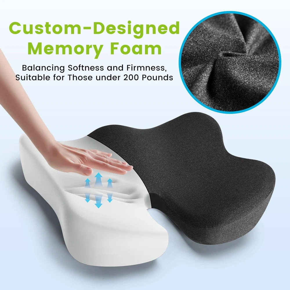 Custom-Designed Memory Foam for Seat Cushion: Made with a unique slow-rebound memory foam formula, our cushion provides soft comfort and proper support, balancing softness and firmness, suitable for those under 200 pounds Cushion for Most Hip Shapes: Designed to fit the contours of the average hip, providing a snug fit for wider hips and extra space for smaller ones Tailbone Pain Cushion & Hemorrhoid Pillow: Featuring an innovative elevated wing-shaped and u-shaped cutout design, it minimizes tailbone and lower back pain, promotes natural spinal alignment, minimizes the impact of gravity on the spine Versatile Seat Cushion for Office Chair: Designed with a sloped leg area for a seamless fit with chair surfaces, and a non-slip bottom to ensure stability. with various chair types, including office chairs, car seats, and gaming chairs Thoughtfully Selected Fabric: Featuring a silky-soft texture, our seat cushion minimizes the friction with clothing and enhances comfort