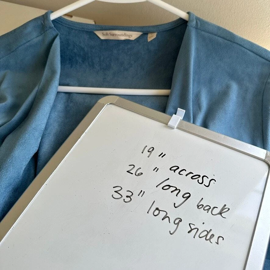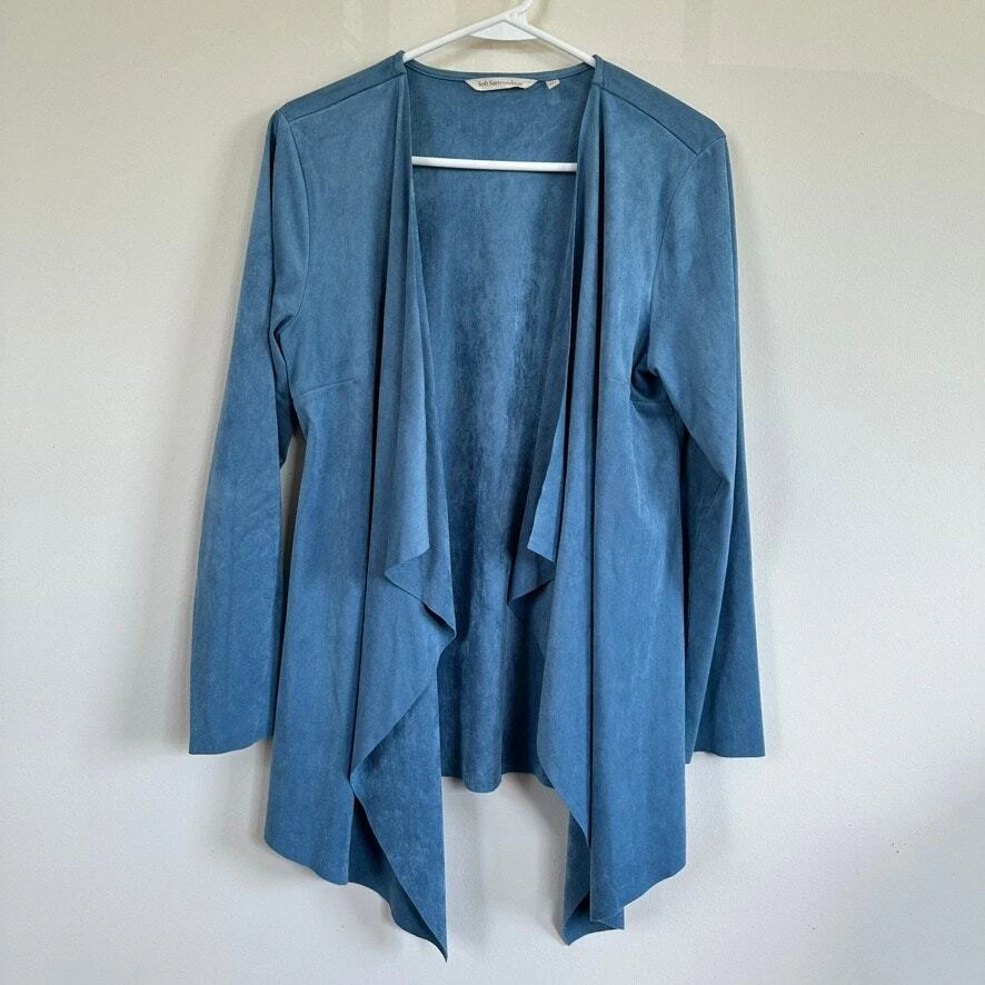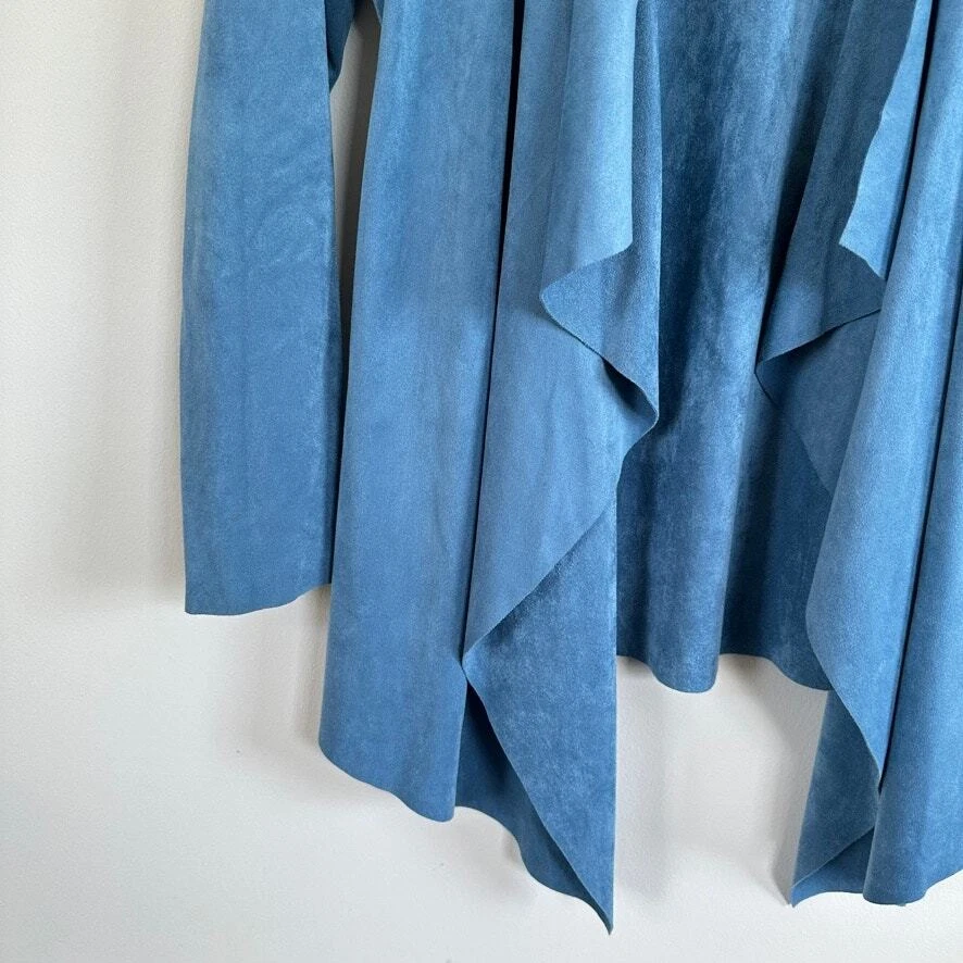 Soft Surroundings Faux Suede Cardigan Draped Open Front size SMALL Blue Soft Surroundings Drape Open Waterfall Cardigan Faux Suede Lightweight Jacket This shape drape topper is a casual relaxed fit open cardigan waterfall opening, asymmetrical front hemline and straight back hemline. Natural comfort, a neutral closet staple that is great for all the seasons and transitions nicely from day into evening. Size: SMALL Approx. measurements: 19" across (pit to pit), 26" long, 33" long on sides (shoulder to hem) Condition: Pre-owned excellent. Pre-loved and in gently used condition. Light wear. no stains, rips, or holes. - see all pics for any wear/condition - From Smoke Free Environment - Item shown the exact item you will receive. ** Be sure to Follow us, We post several shoes / items often, and offer discounts when you bundle. **SHIPS FROM CHICAGO, ILLINOIS :) Western, preppy, southwest, faux suede, boho, bohemian, cowboy, classic, casual